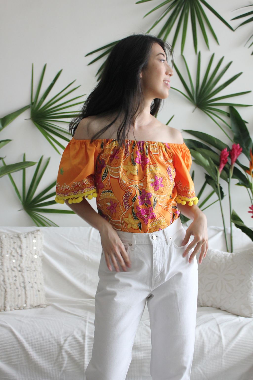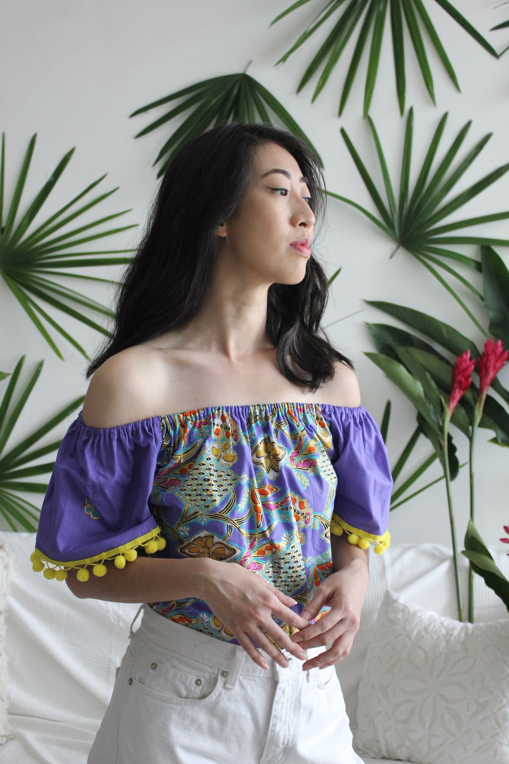 One of a kind fun, bright pom pom tops to add a little blast of joy into your day. Elastic easy and comfy wear off or on shoulder! Made of 100% cotton gold-line batik.