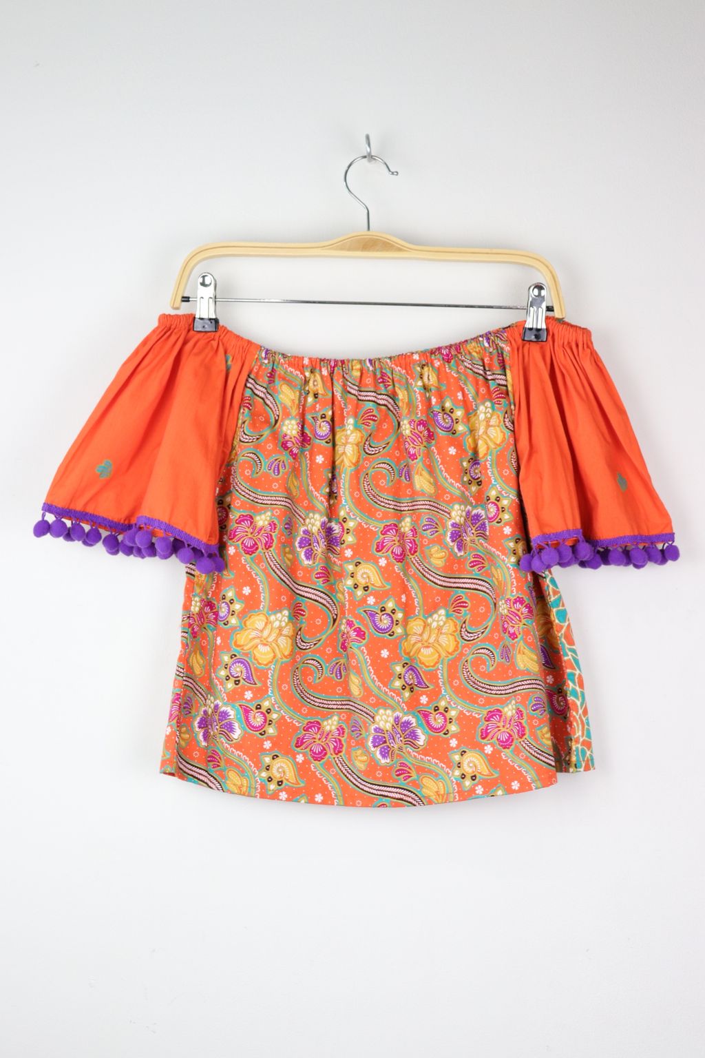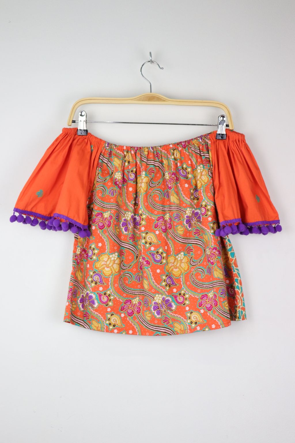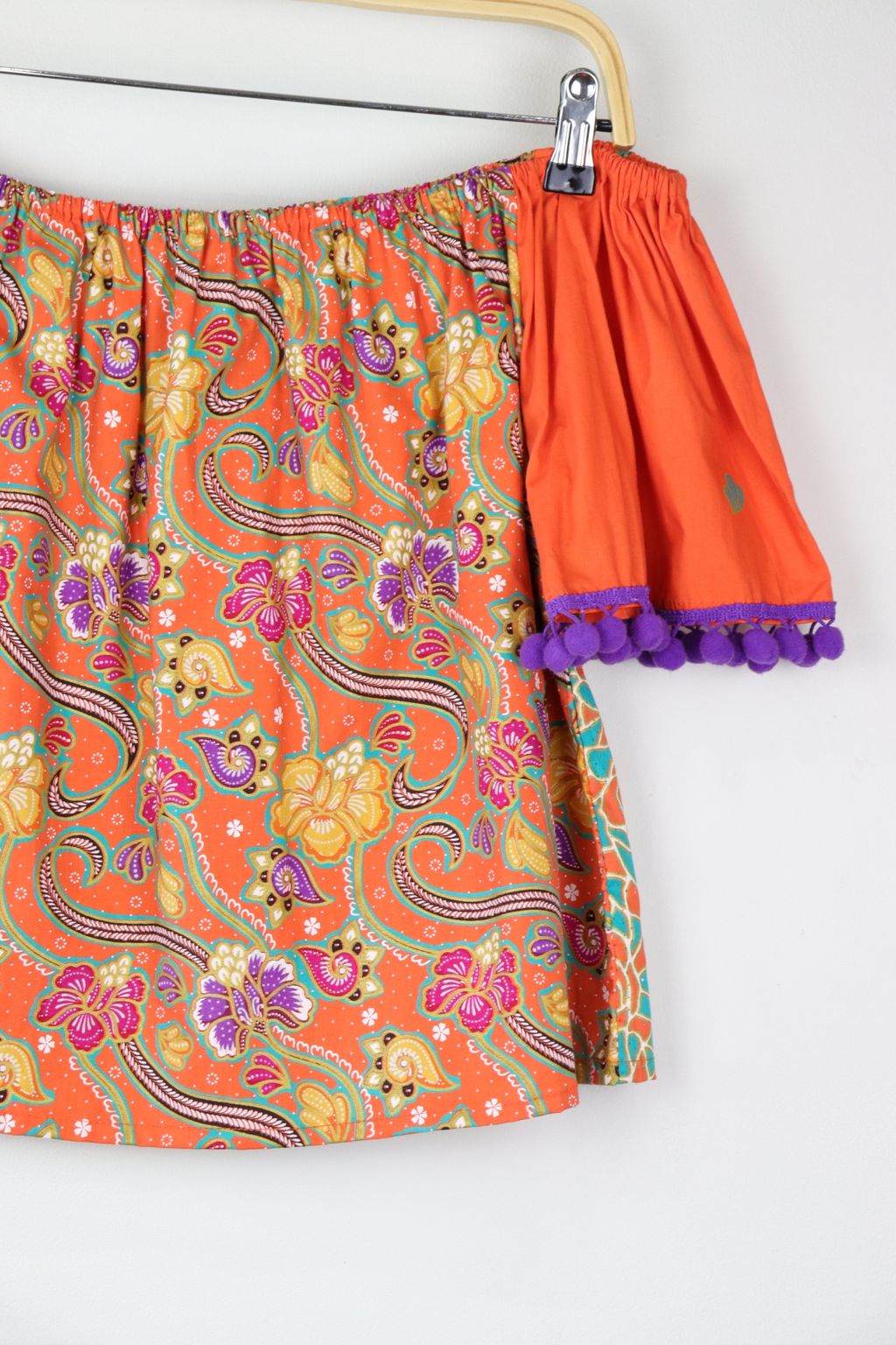One of a kind fun, bright pom pom tops to add a little blast of joy into your day. Elastic easy and comfy wear off or on shoulder! Made of 100% cotton gold-line batik.