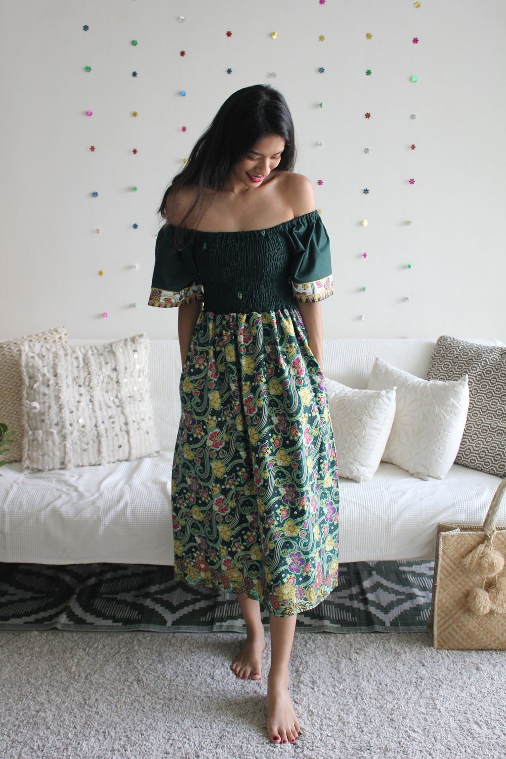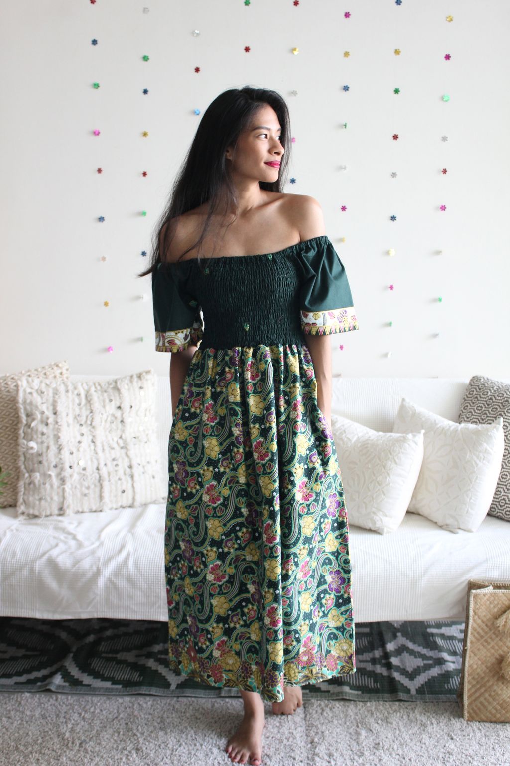 Hello Puteri of the Tropics! This gorgeous dress is really breezy and comfortable to wear! It is made of 100% soft gold-line cotton batik. This dress is labor intensive and handmade in our studio, just as where all our other garments are made with love. Only one of each color made, so if this beau is calling your name, do put it in your cart and check it out :)!