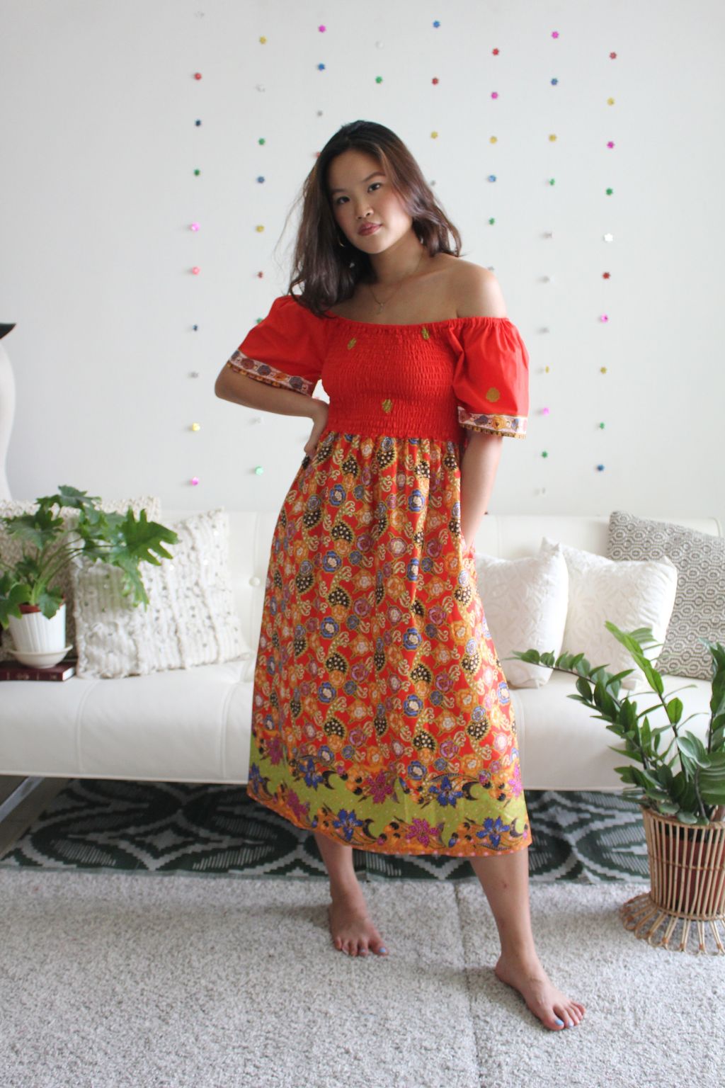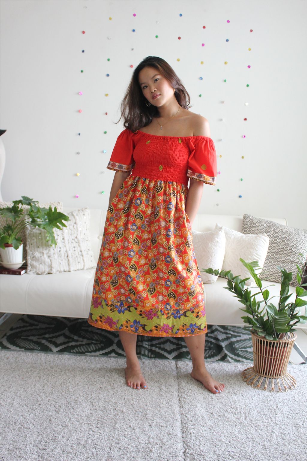 Hello Puteri of the Tropics! This gorgeous dress is really breezy and comfortable to wear! It is made of 100% soft gold-line cotton batik. This dress is labor intensive and handmade in our studio, just as where all our other garments are made with love. Only one of each color made, so if this beau is calling your name, do put it in your cart and check it out :)!