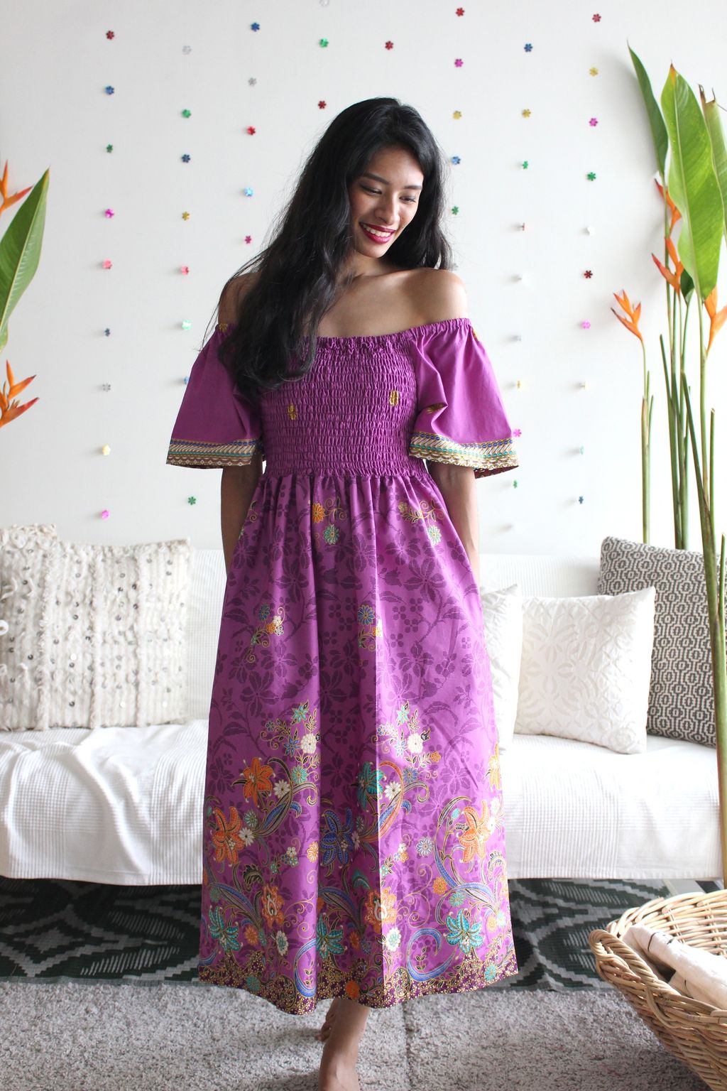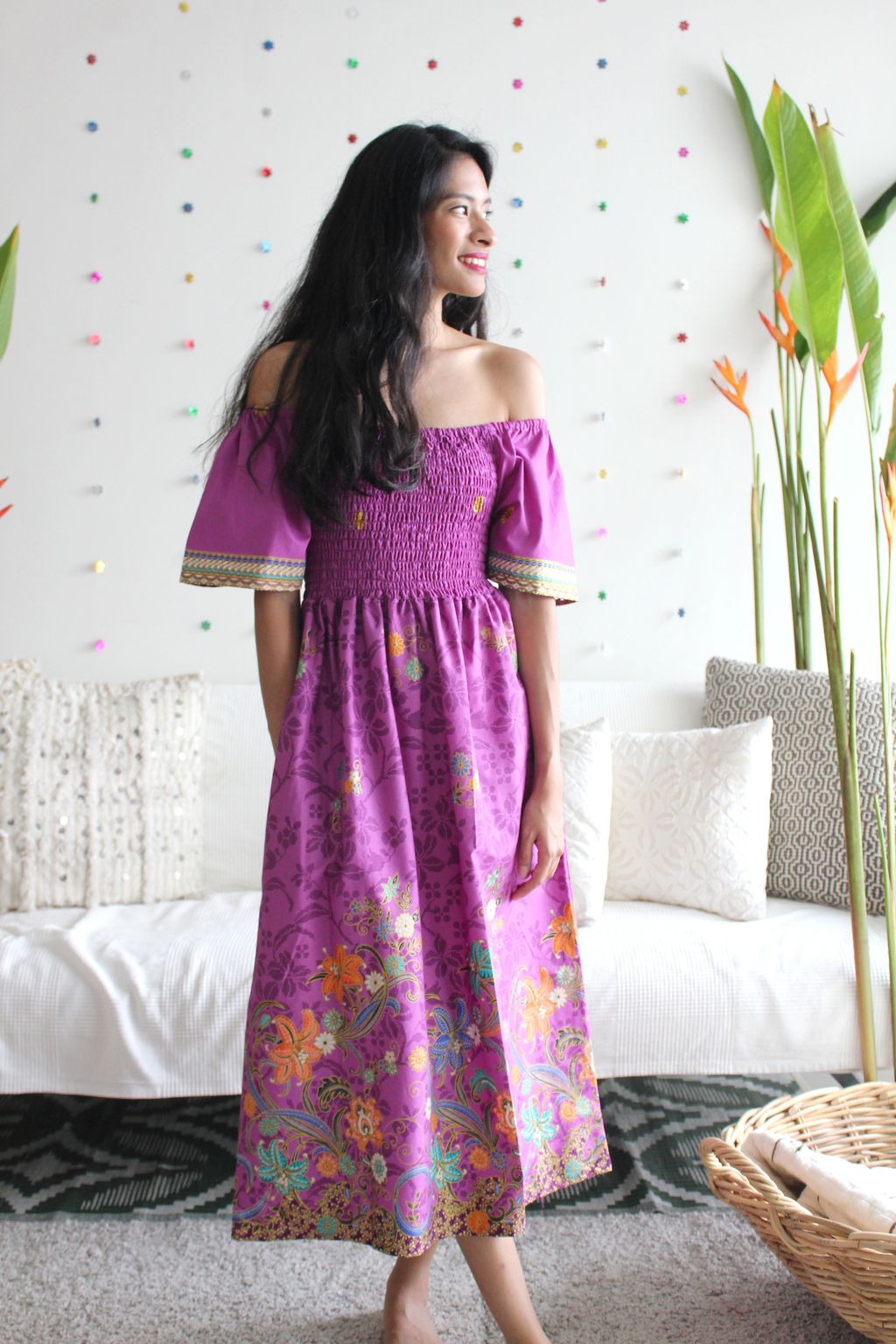 Hello Puteri of the Tropics! This gorgeous dress is really breezy and comfortable to wear! It is made of 100% soft gold-line cotton batik. This dress is labor intensive and handmade in our studio, just as where all our other garments are made with love. Only one of each color made, so if this beau is calling your name, do put it in your cart and check it out :)!