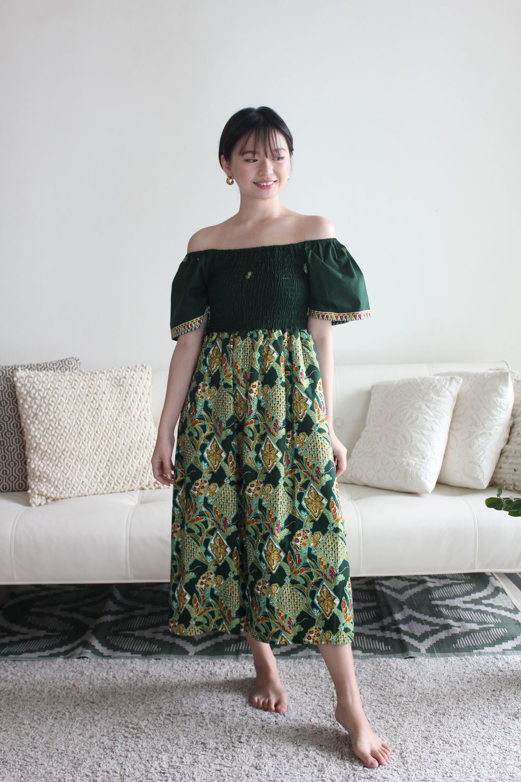 Hello Puteri of the Tropics! This gorgeous dress is really breezy and comfortable to wear! It is made of 100% soft gold-line cotton batik. This dress is labor intensive and handmade in our studio, just as where all our other garments are made with love. Only one of each color made, so if this beau is calling your name, do put it in your cart and check it out :)!