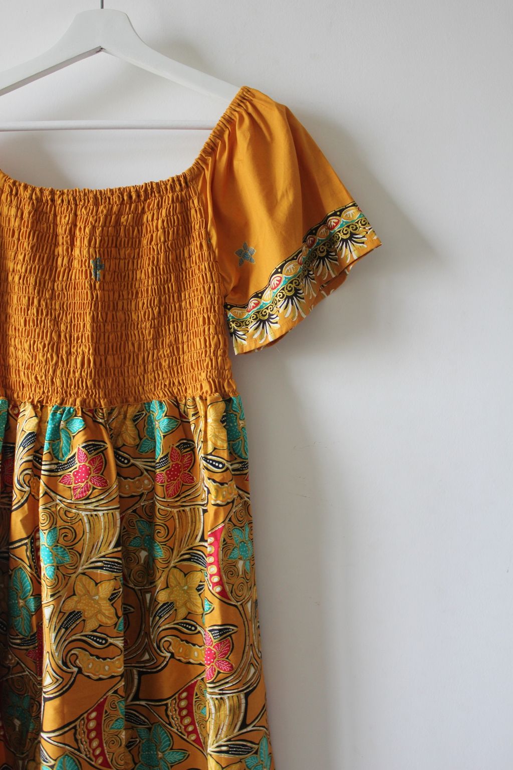 Hello Puteri of the Tropics! This gorgeous dress is really breezy and comfortable to wear! It is made of 100% soft gold-line cotton batik. This dress is labor intensive and handmade in our studio, just as where all our other garments are made with love. Only one of each color made, so if this beau is calling your name, do put it in your cart and check it out :)!