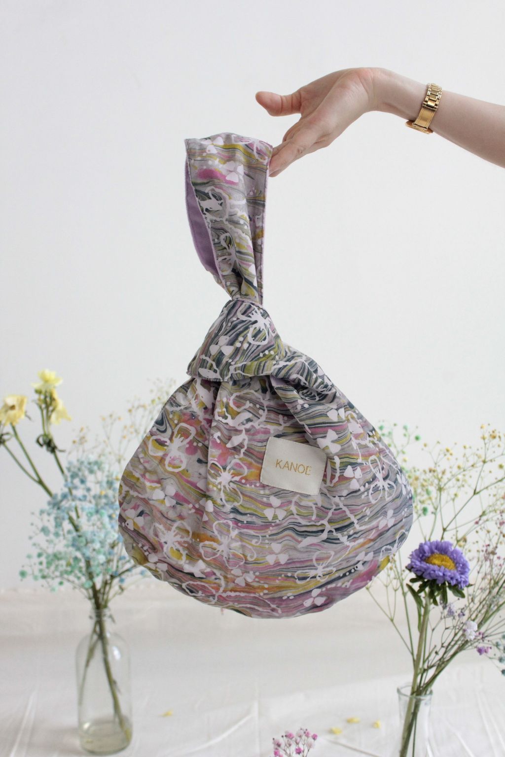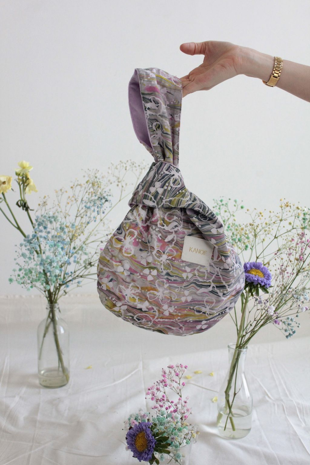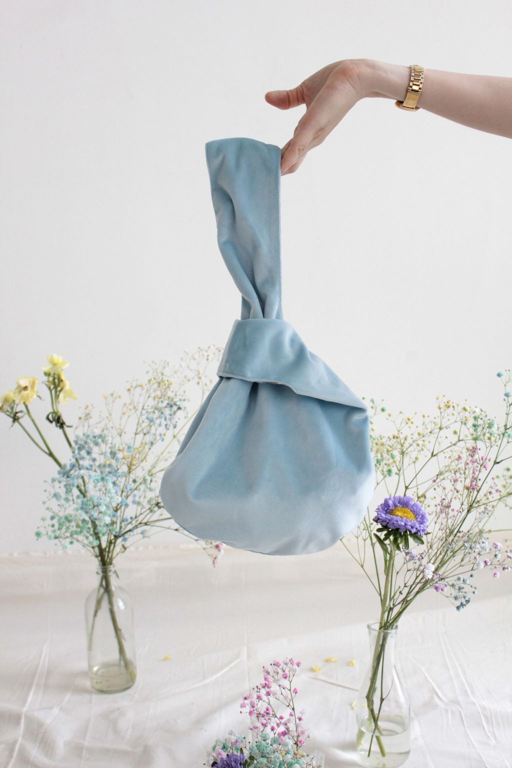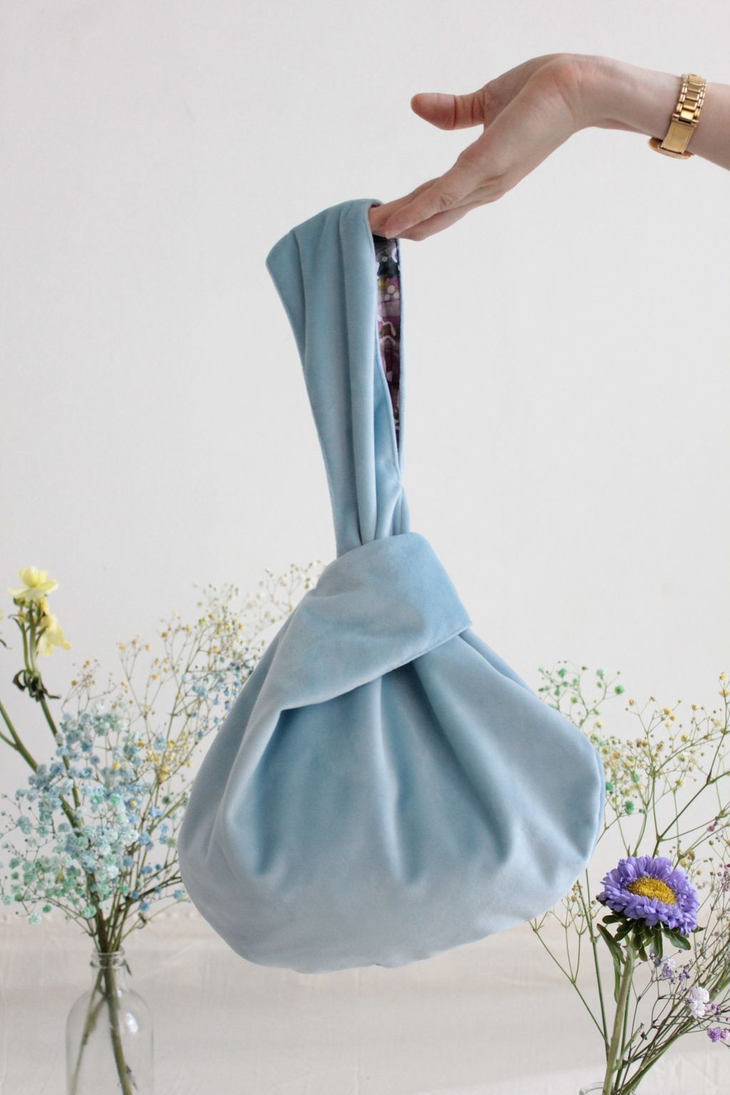 Reversible Velvet+Batik KnotBag - Baby Bleu