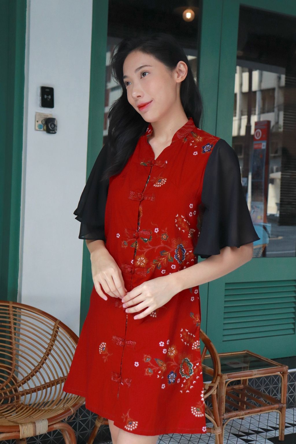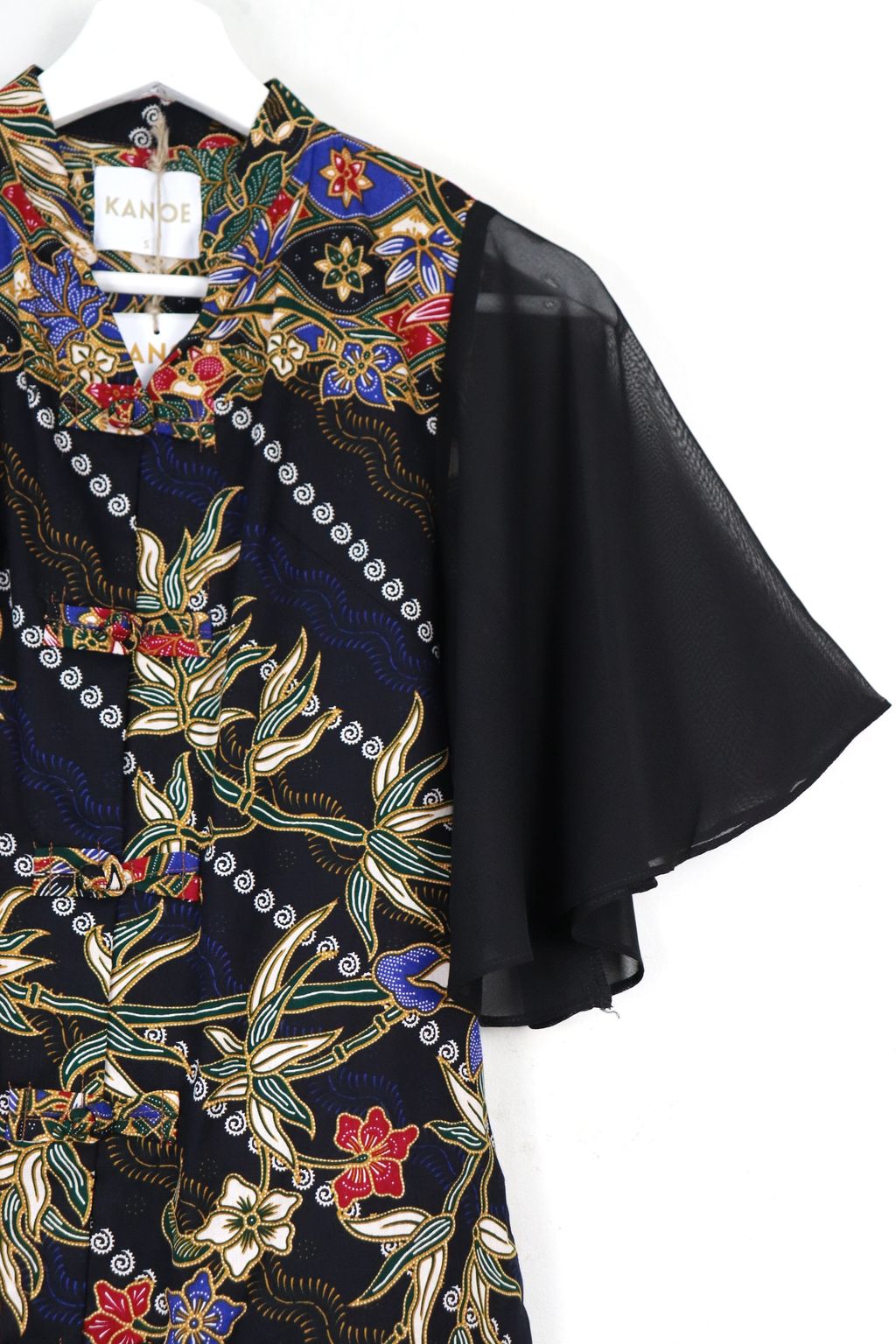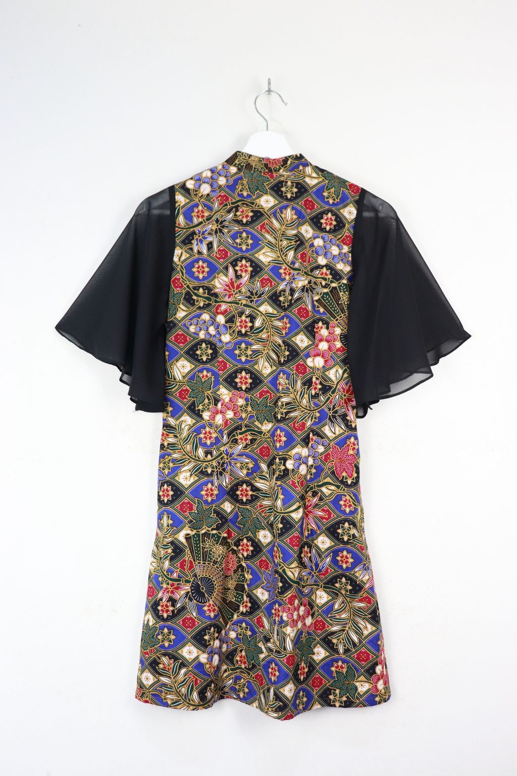 This feminine fatale fitted batik dress comes with flouncy sheer sleeves for added dramatic flair.