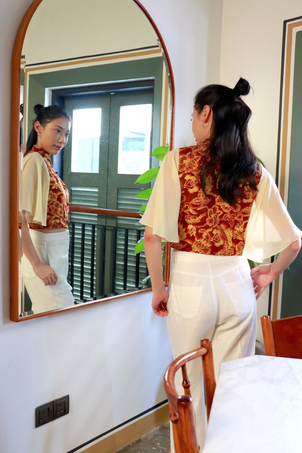 With added oriental charms of the mandarin collar and Chinese knot buttons.