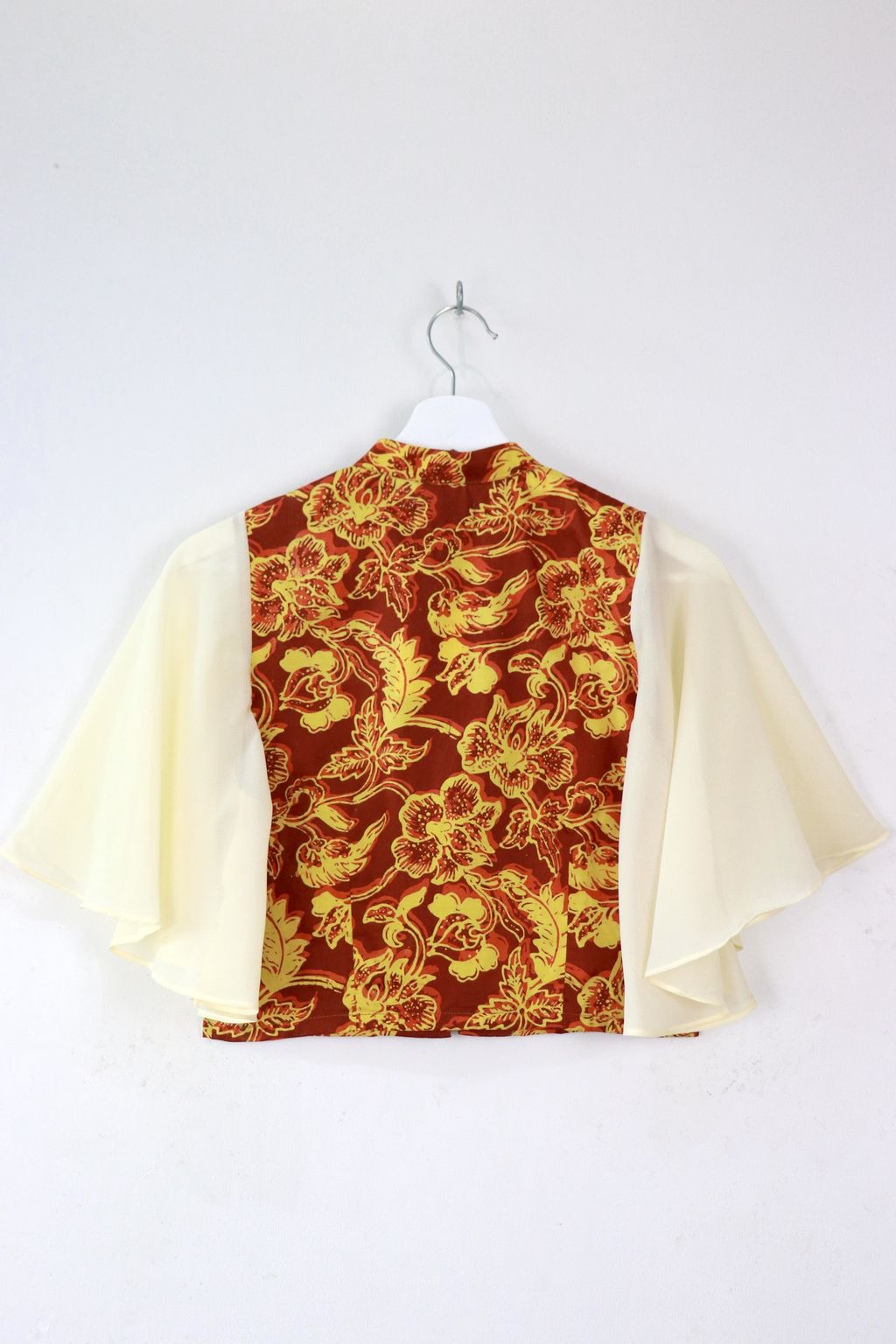 This feminine fatale batik cropped top comes with flouncy sheer sleeves for added dramatic flair.