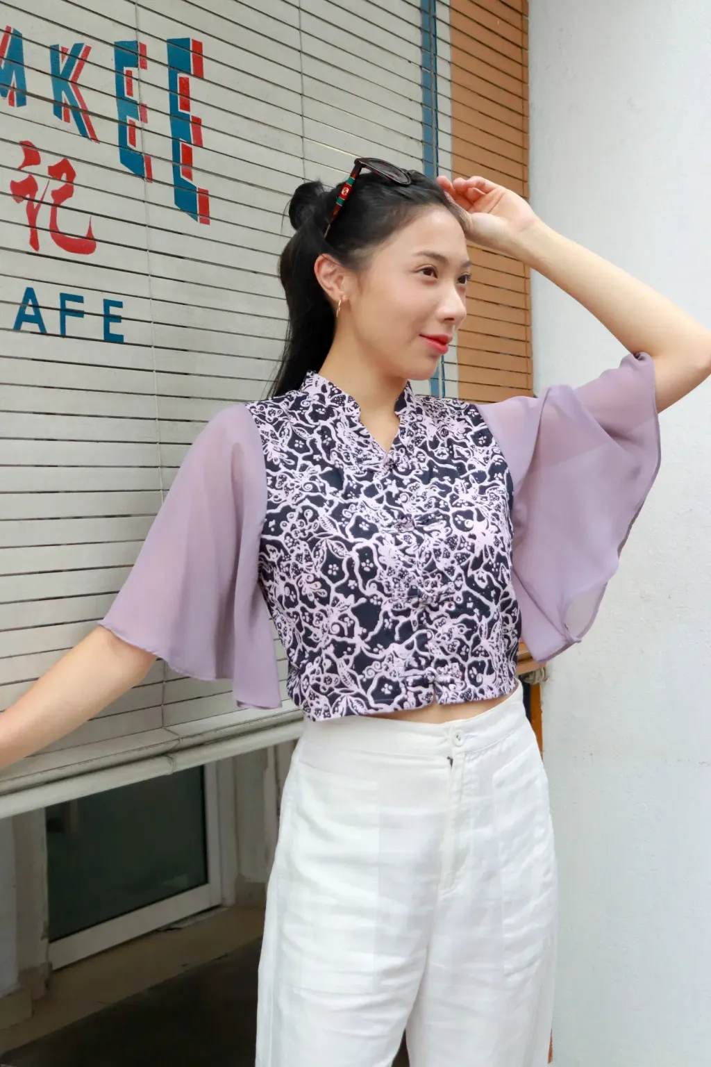 This feminine fatale batik cropped top comes with flouncy sheer sleeves for added dramatic flair.