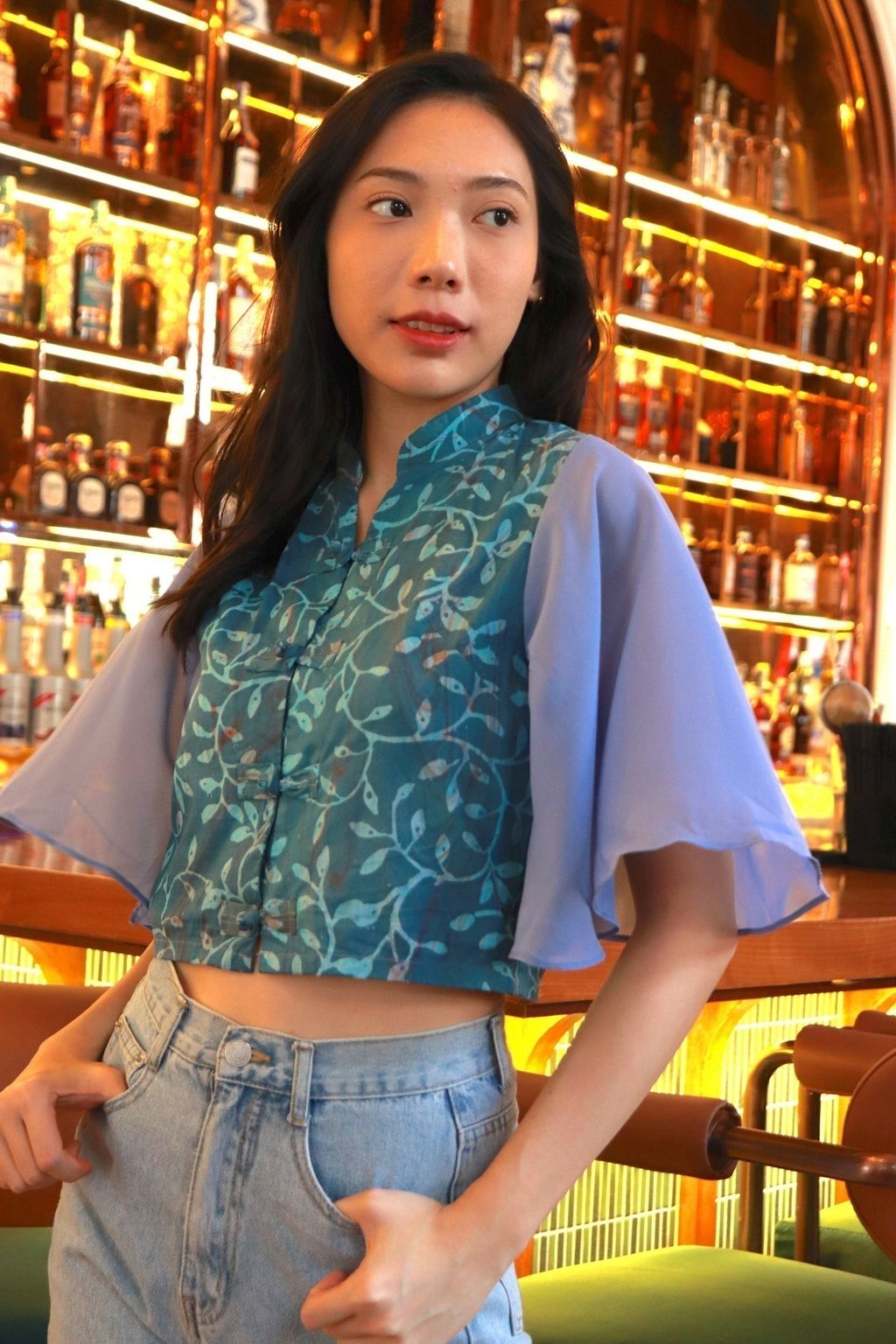 This feminine fatale batik cropped top comes with flouncy sheer sleeves for added dramatic flair.
