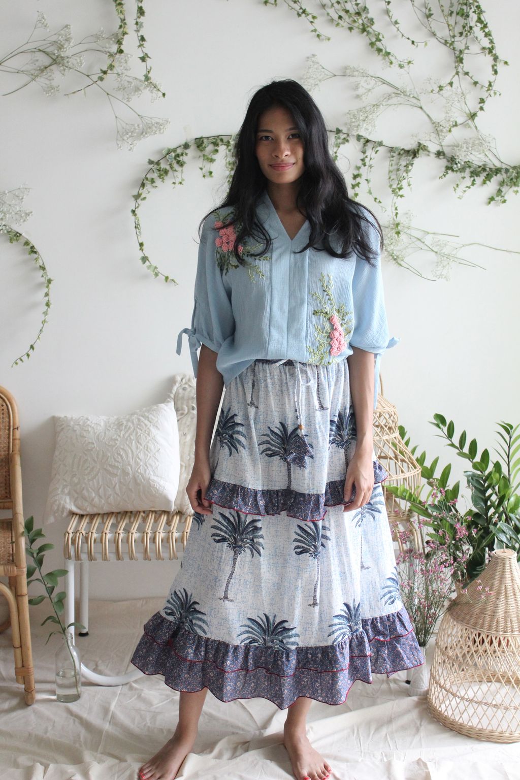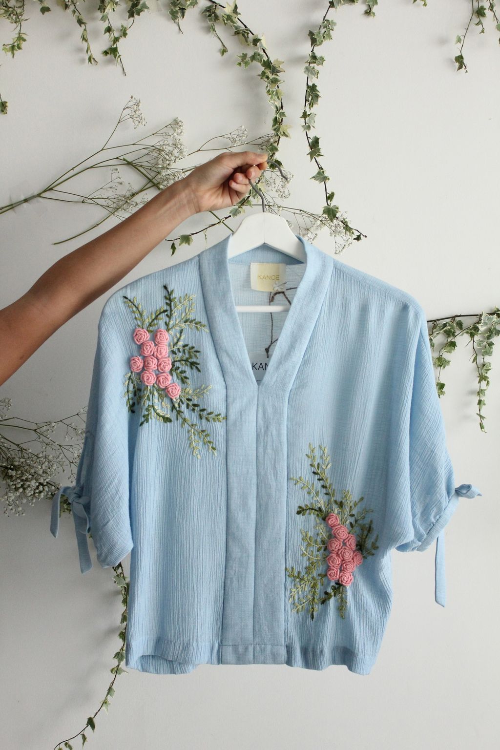 We love how the combinational texture of the silk crepe and 3D effect of the hand embroidered floral bouquet brings so much feel in creating this romantic top. At KANOE we love working with traditional skills and handcrafted art as we see so much beauty in them. We hope you too love and will grow in affection to appreciate these fine art on garments.