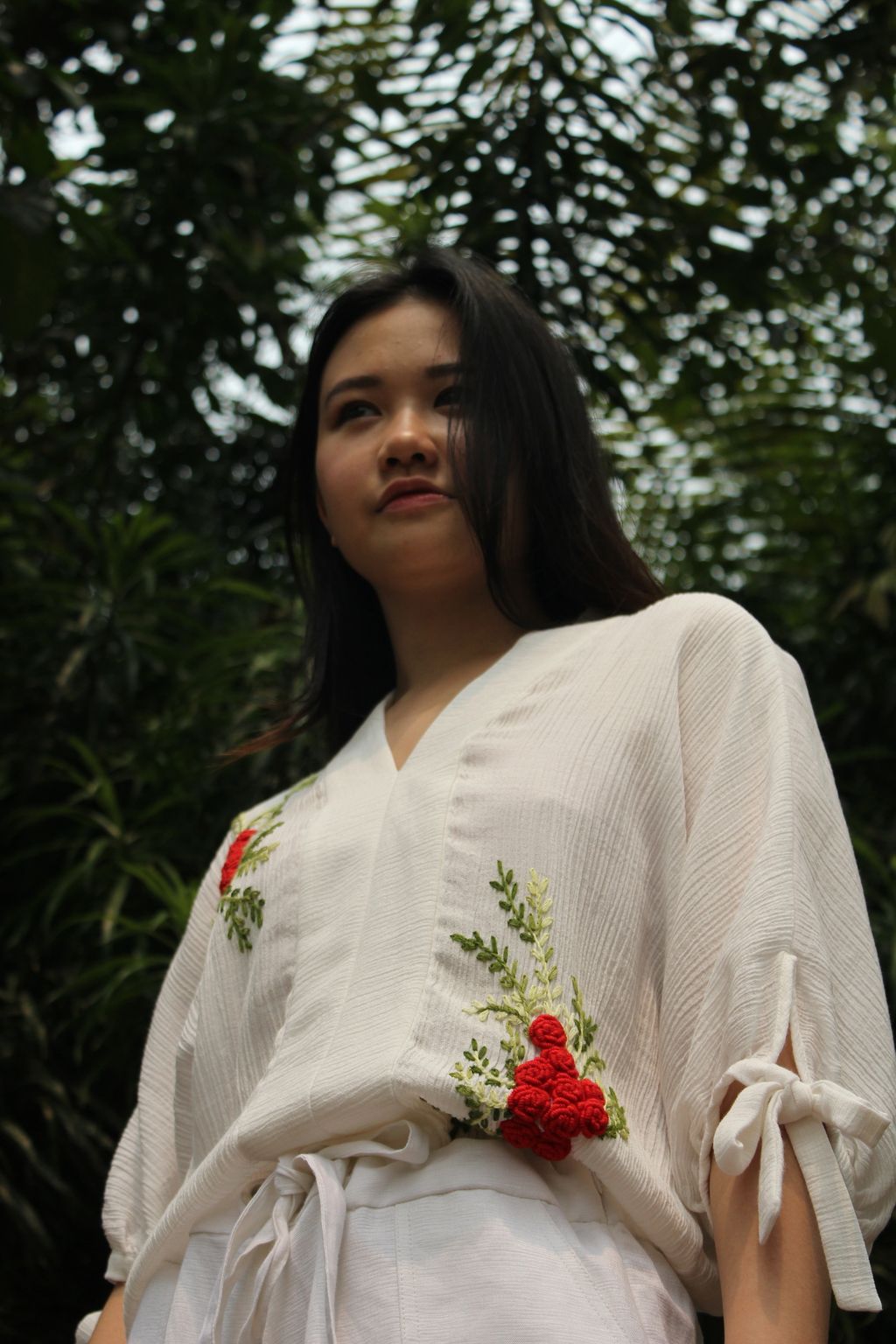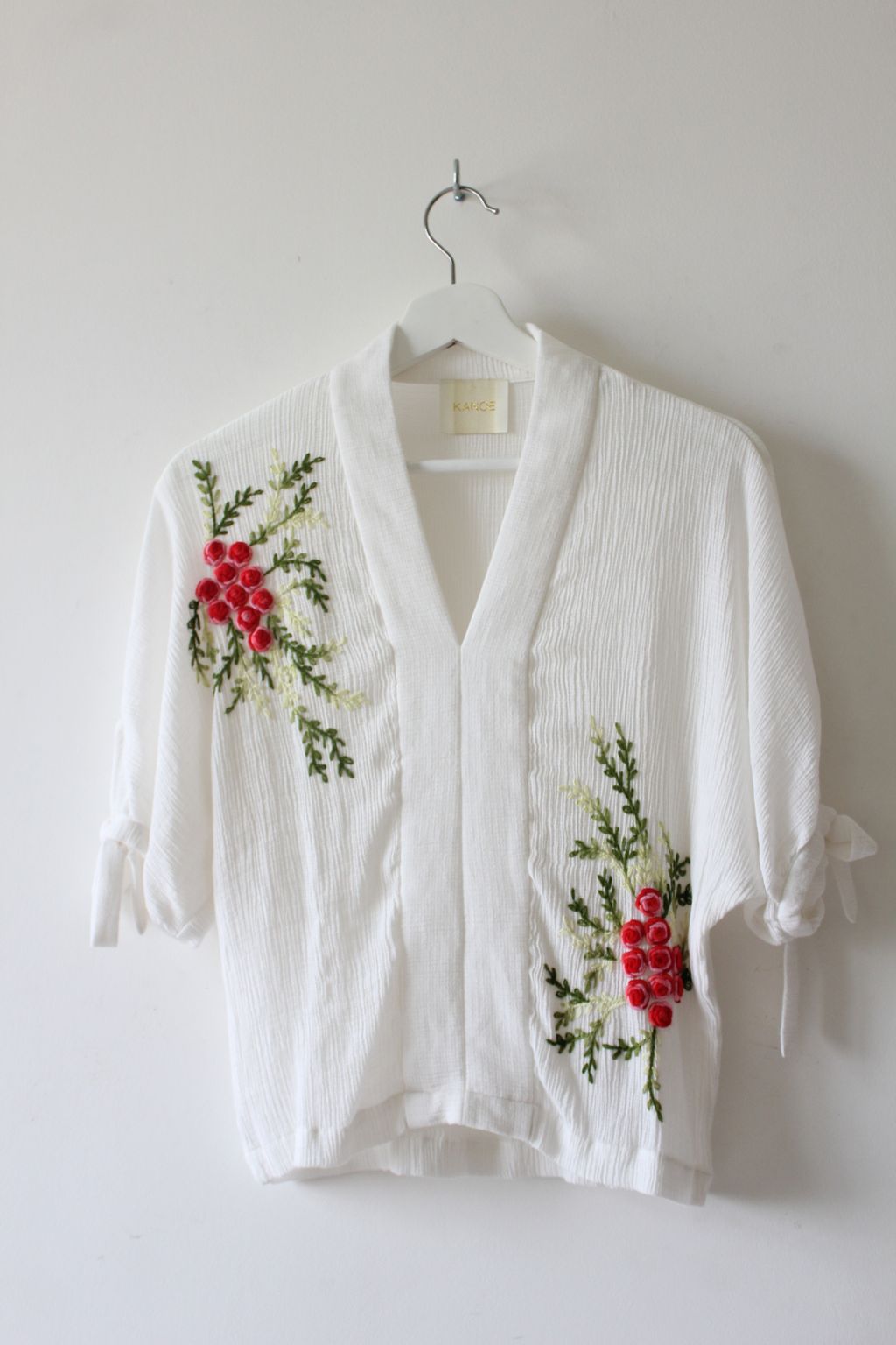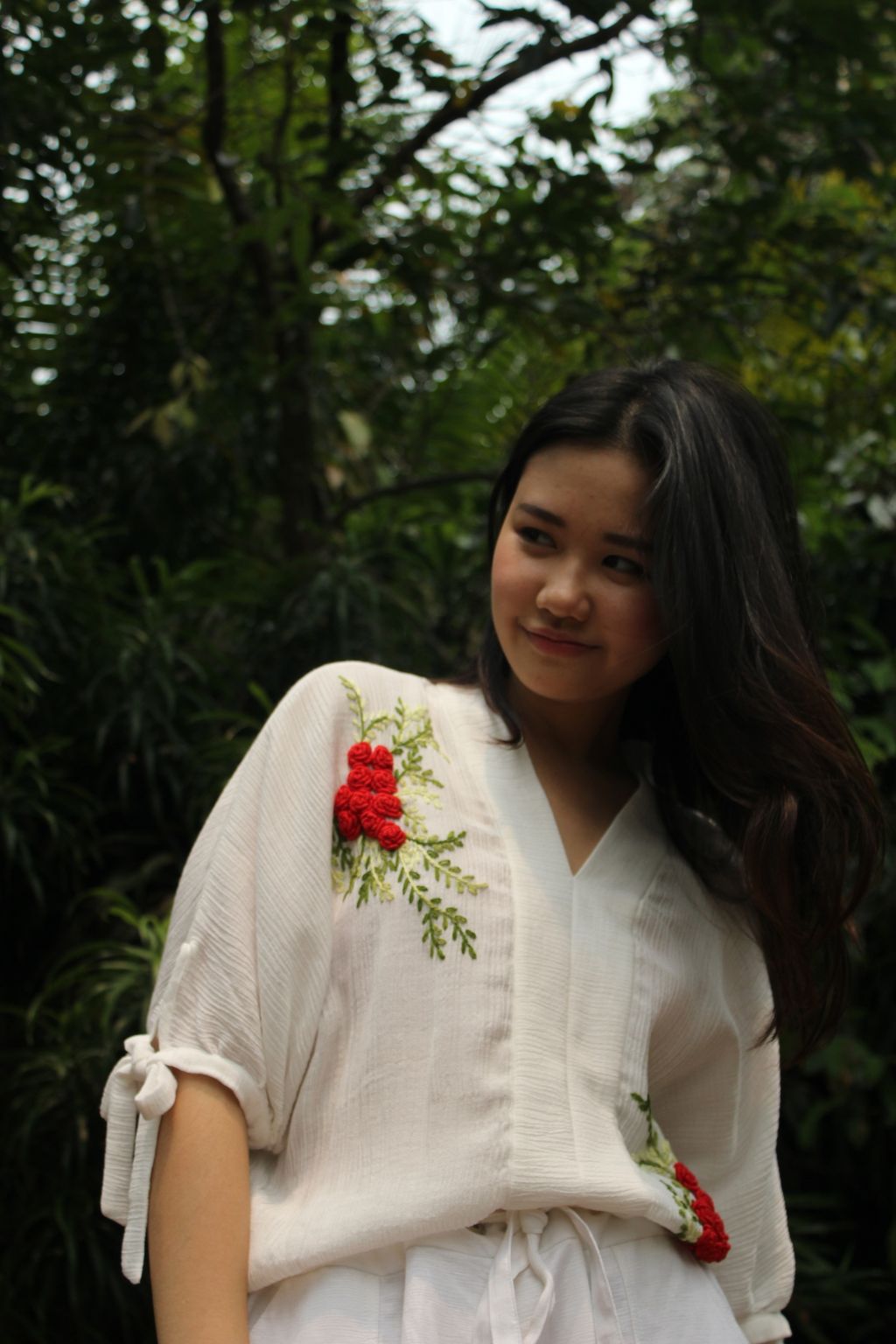 We love how the combinational texture of the silk crepe and 3D effect of the hand embroidered floral bouquet brings so much feel in creating this romantic top. At KANOE we love working with traditional skills and handcrafted art as we see so much beauty in them. We hope you too love and will grow in affection to appreciate these fine art on garments.