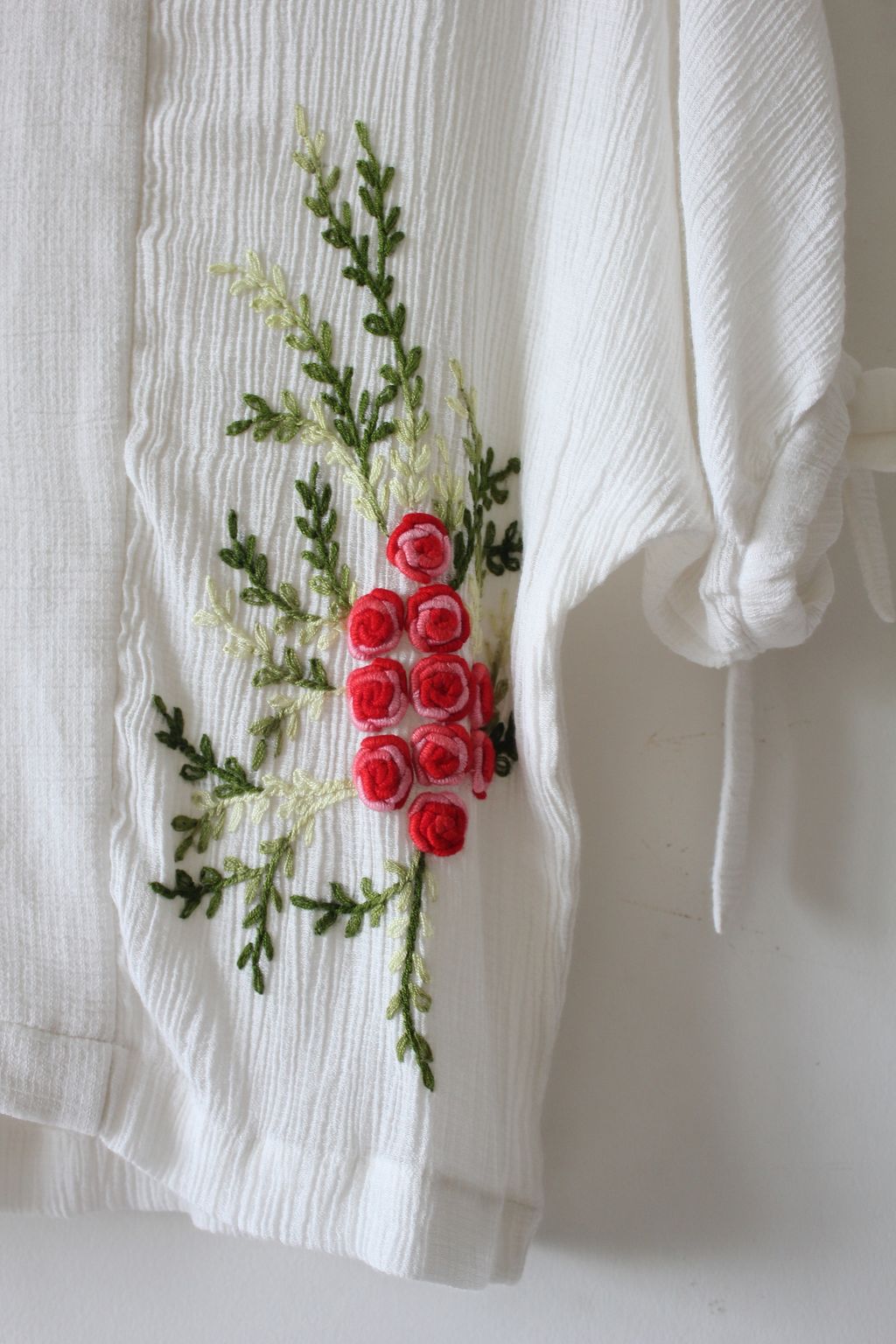 These delightful top that speak the language of love are made of 100% crepe silk blend. Soft to the skin and cooling. With beautiful hand embroidered floral bouquet. In-house designed and hand sewn by embroidery artisans. Made in a limited number in 4 color way variation.