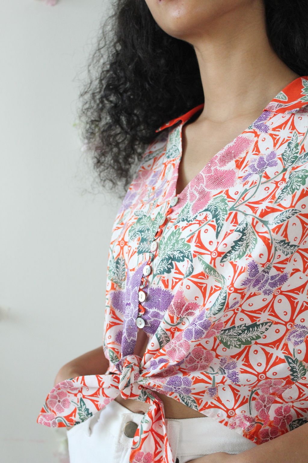 These pastel sleeveless front tie top are made from intricate hand stamped batik textile. Not one piece alike, you will love how beautiful the colours and print of this batik is made by skilled artisans of centuries of batik making wisdom. These batik come from a region where the batik makers have influence from Chinese and European merchants in which is on display in the motifs and colours of the batik.