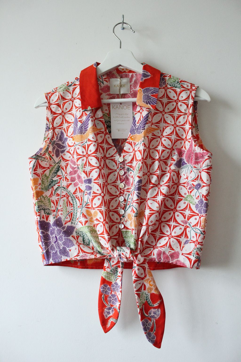 These pastel sleeveless front tie top are made from intricate hand stamped batik textile. Not one piece alike, you will love how beautiful the colours and print of this batik is made by skilled artisans of centuries of batik making wisdom. These batik come from a region where the batik makers have influence from Chinese and European merchants in which is on display in the motifs and colours of the batik.