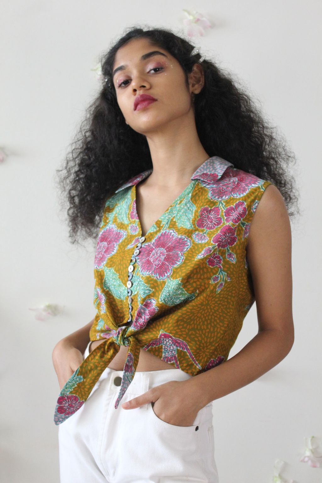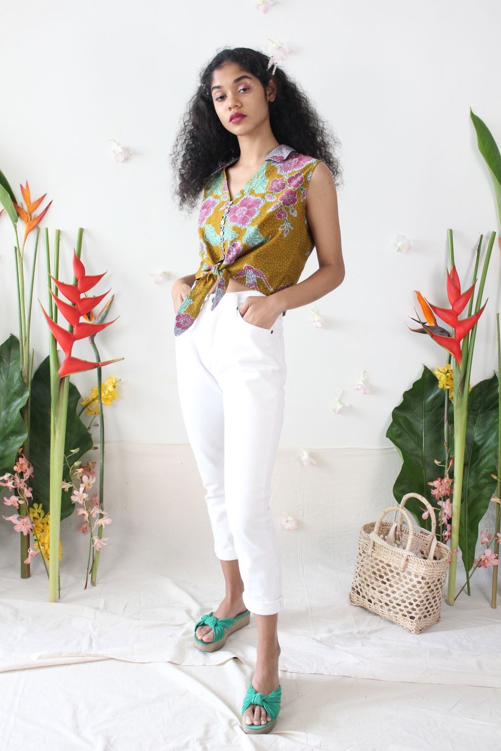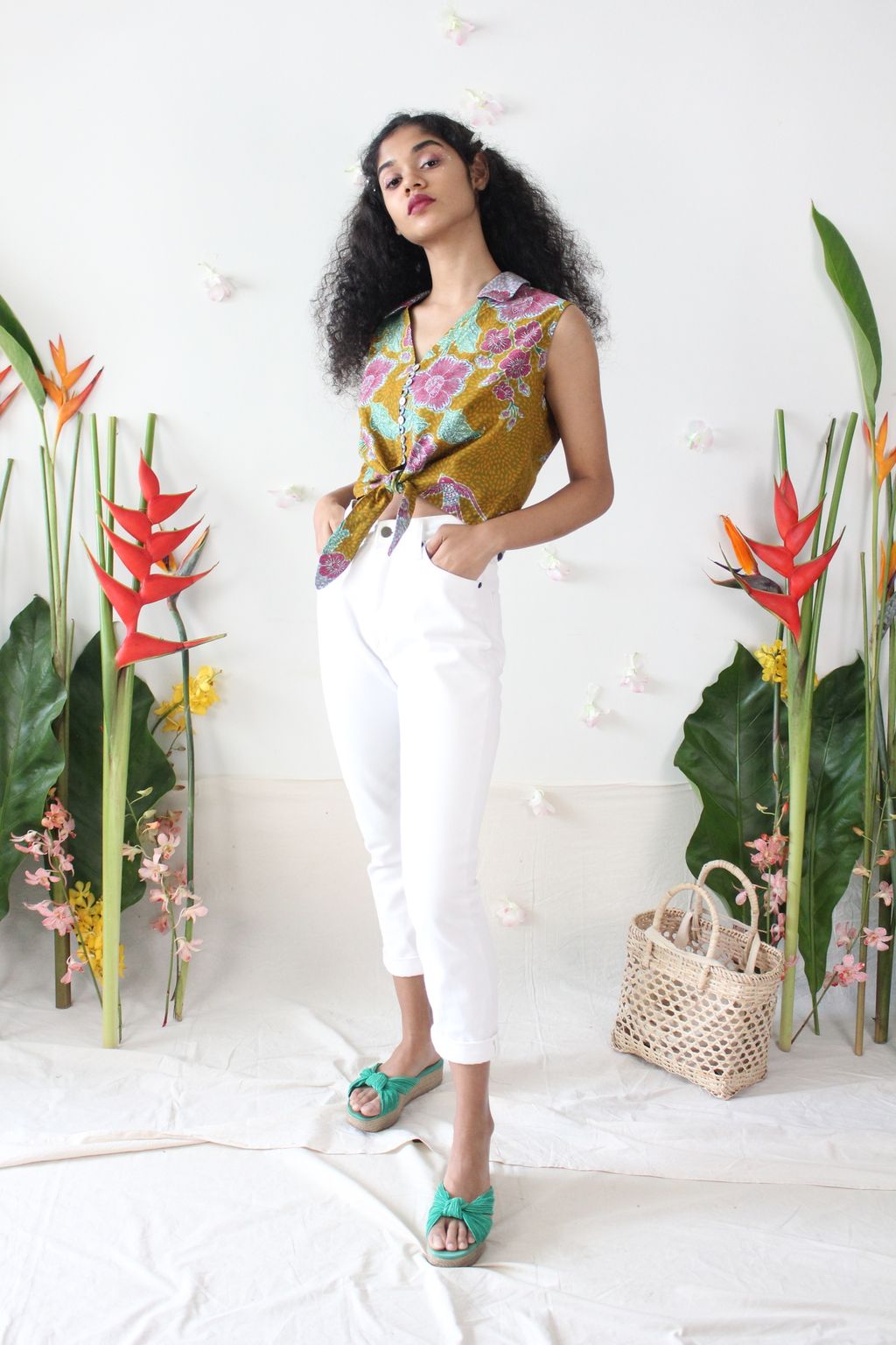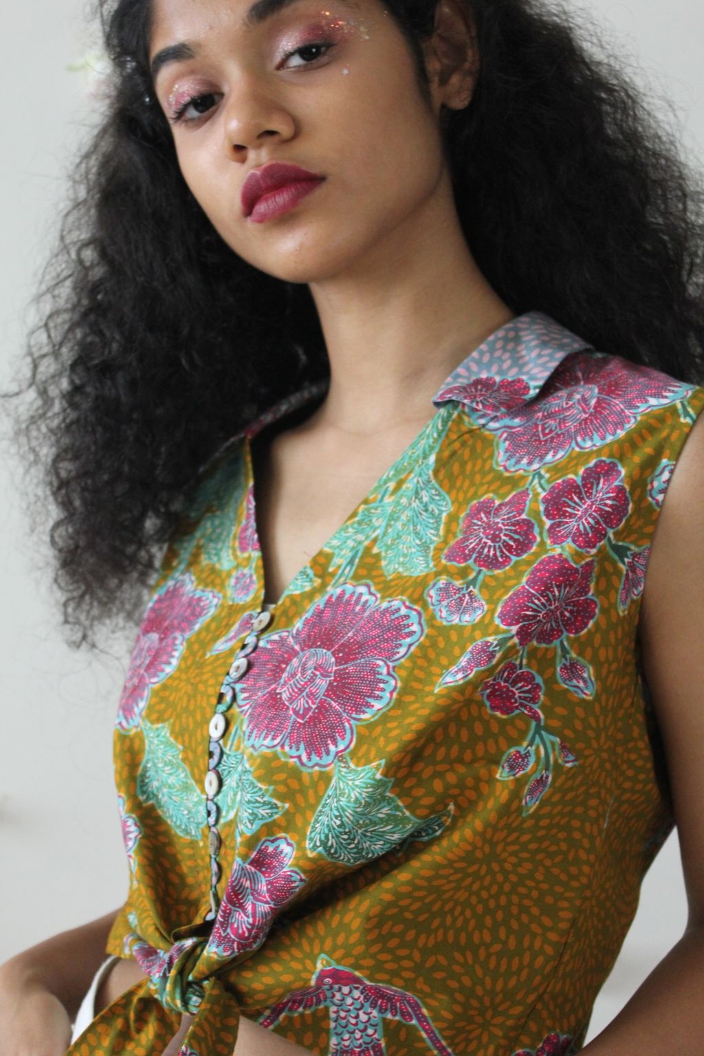 These pastel sleeveless front tie top are made from intricate hand stamped batik textile. Not one piece alike, you will love how beautiful the colours and print of this batik is made by skilled artisans of centuries of batik making wisdom. These batik come from a region where the batik makers have influence from Chinese and European merchants in which is on display in the motifs and colours of the batik.