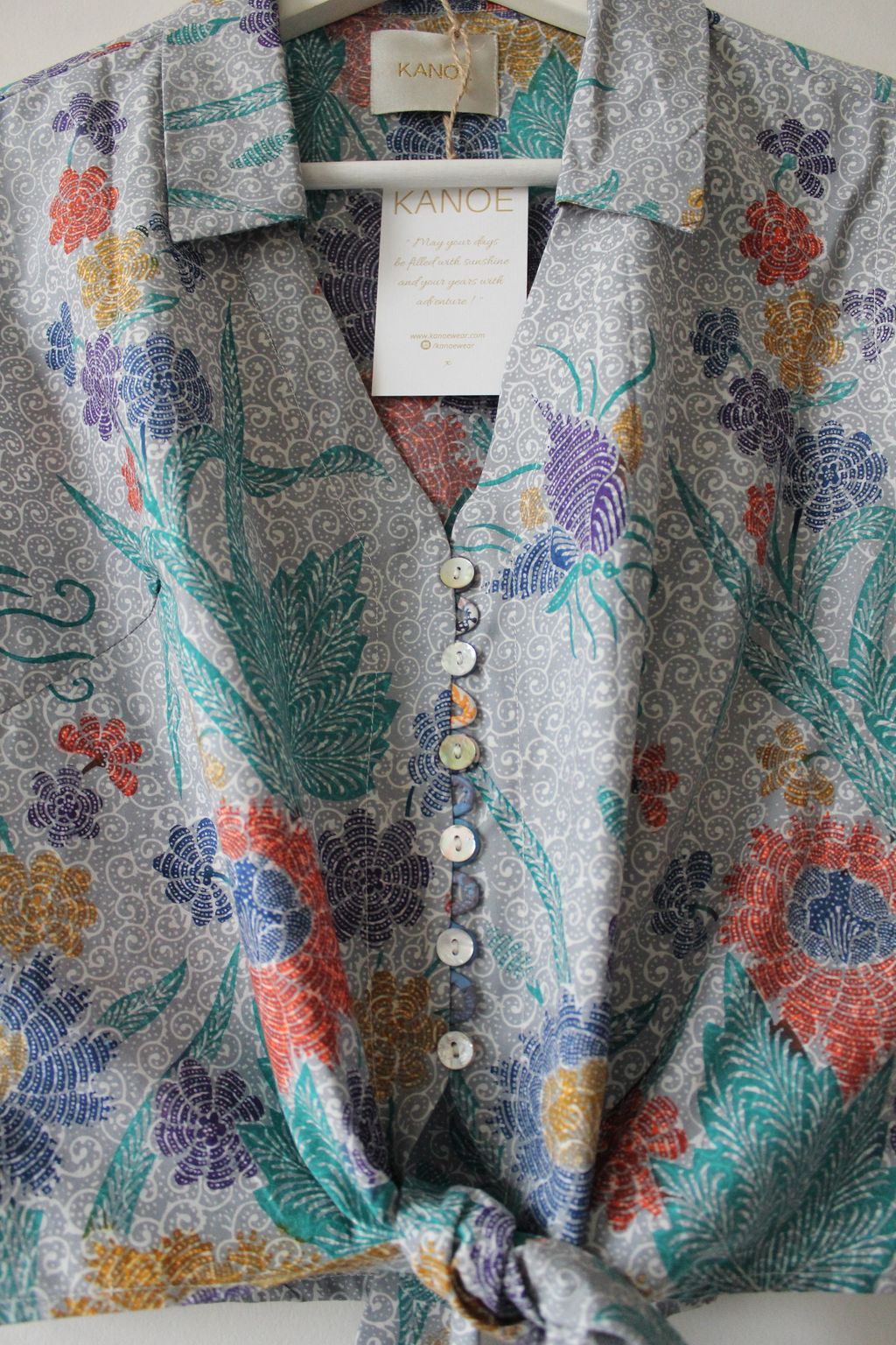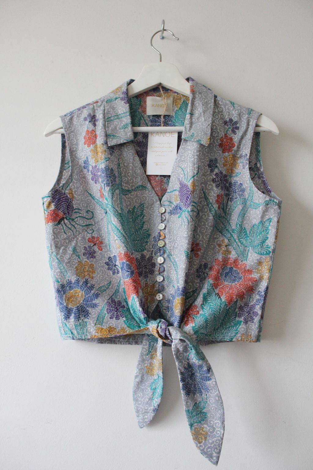 These pastel sleeveless front tie top are made from intricate hand stamped batik textile. Not one piece alike, you will love how beautiful the colours and print of this batik is made by skilled artisans of centuries of batik making wisdom. These batik come from a region where the batik makers have influence from Chinese and European merchants in which is on display in the motifs and colours of the batik.