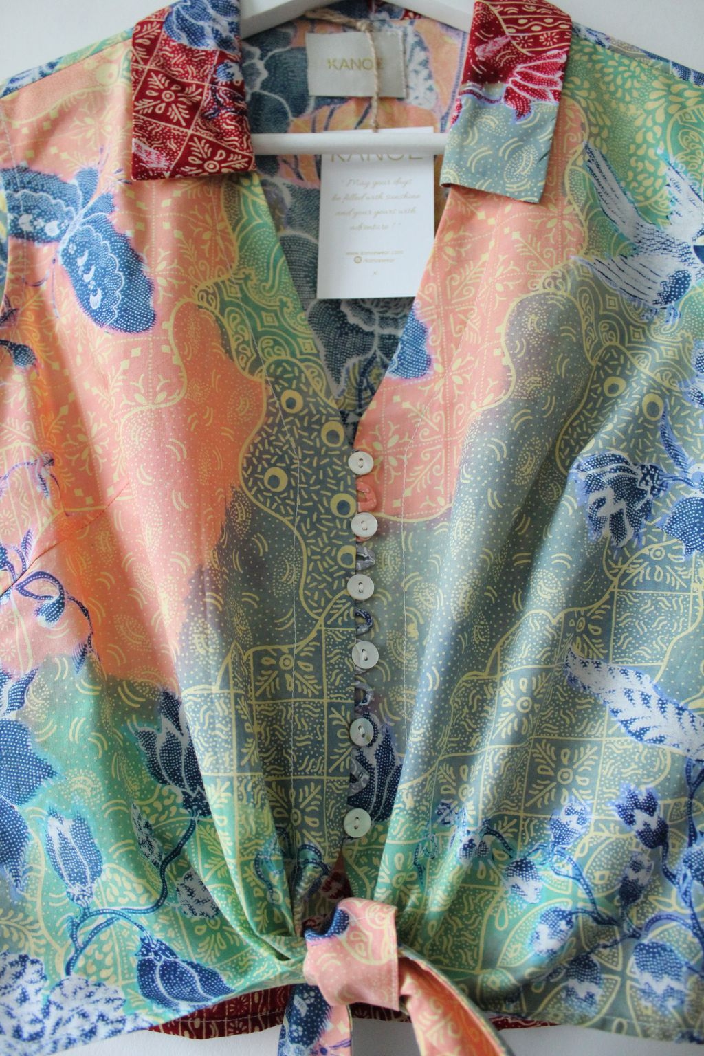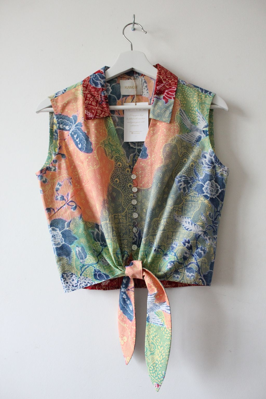 These pastel sleeveless front tie top are made from intricate hand stamped batik textile. Not one piece alike, you will love how beautiful the colours and print of this batik is made by skilled artisans of centuries of batik making wisdom. These batik come from a region where the batik makers have influence from Chinese and European merchants in which is on display in the motifs and colours of the batik.
