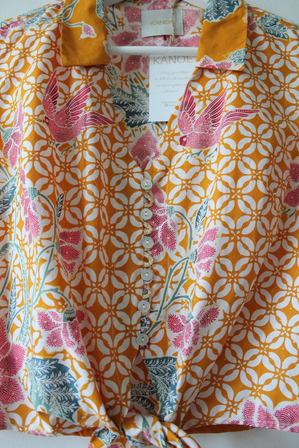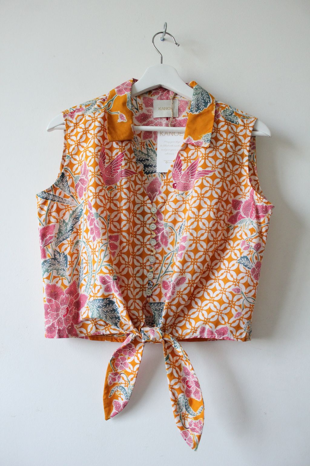 These pastel sleeveless front tie top are made from intricate hand stamped batik textile. Not one piece alike, you will love how beautiful the colours and print of this batik is made by skilled artisans of centuries of batik making wisdom. These batik come from a region where the batik makers have influence from Chinese and European merchants in which is on display in the motifs and colours of the batik.