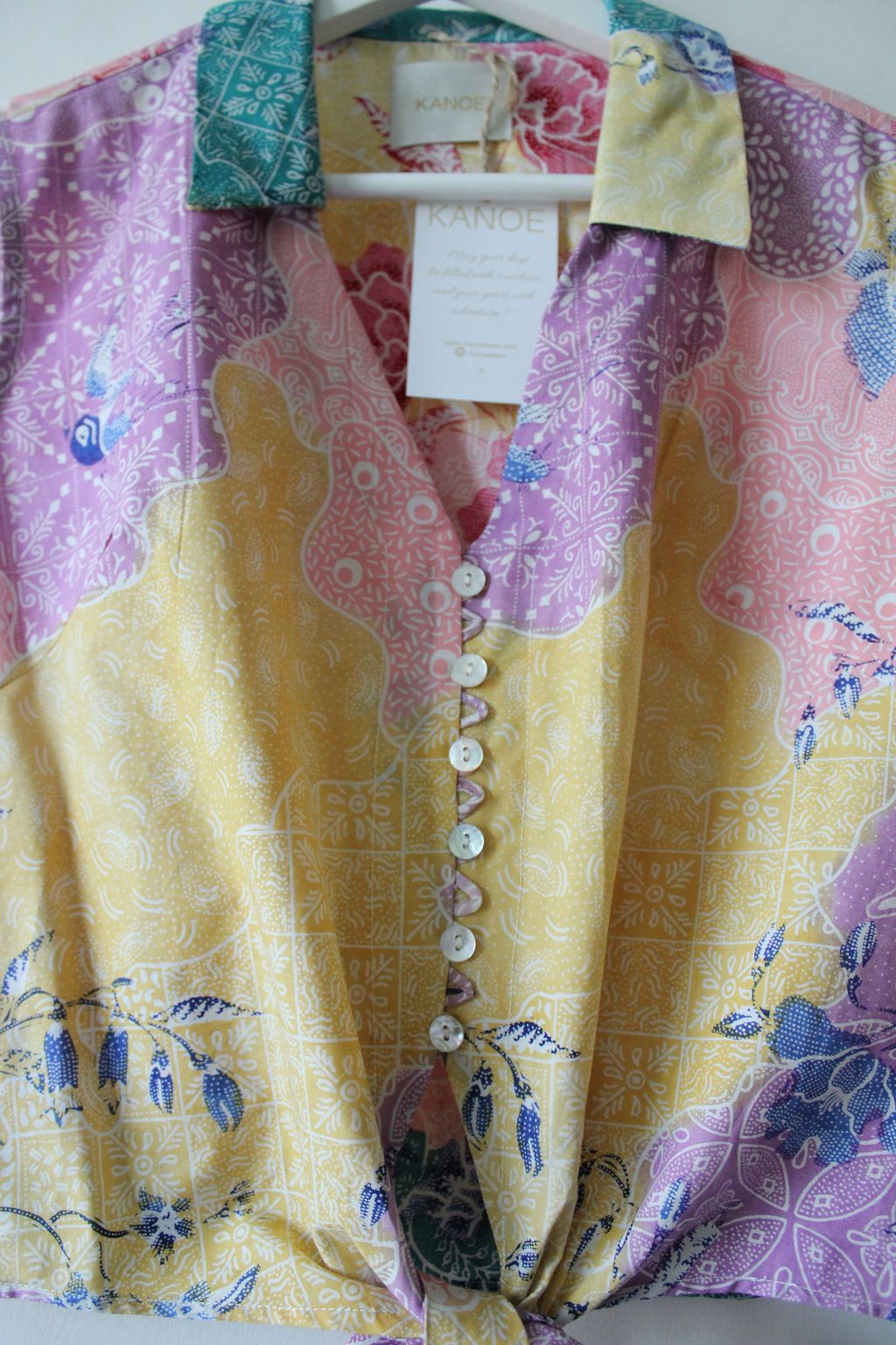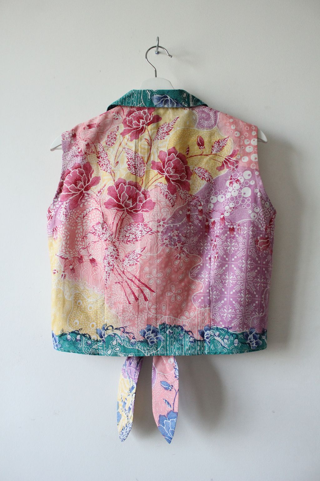 These pastel sleeveless front tie top are made from intricate hand stamped batik textile. Not one piece alike, you will love how beautiful the colours and print of this batik is made by skilled artisans of centuries of batik making wisdom. These batik come from a region where the batik makers have influence from Chinese and European merchants in which is on display in the motifs and colours of the batik.