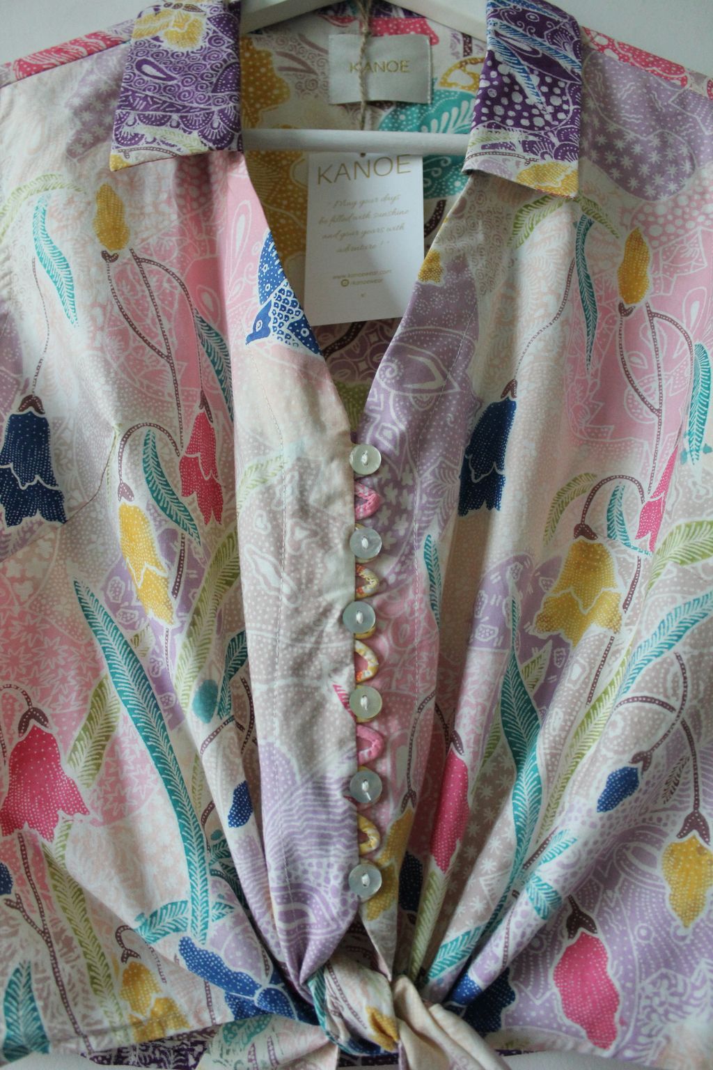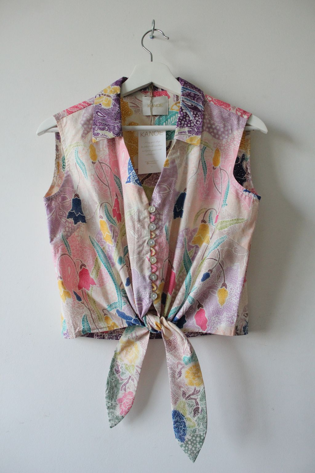 These pastel sleeveless front tie top are made from intricate hand stamped batik textile. Not one piece alike, you will love how beautiful the colours and print of this batik is made by skilled artisans of centuries of batik making wisdom. These batik come from a region where the batik makers have influence from Chinese and European merchants in which is on display in the motifs and colours of the batik.
