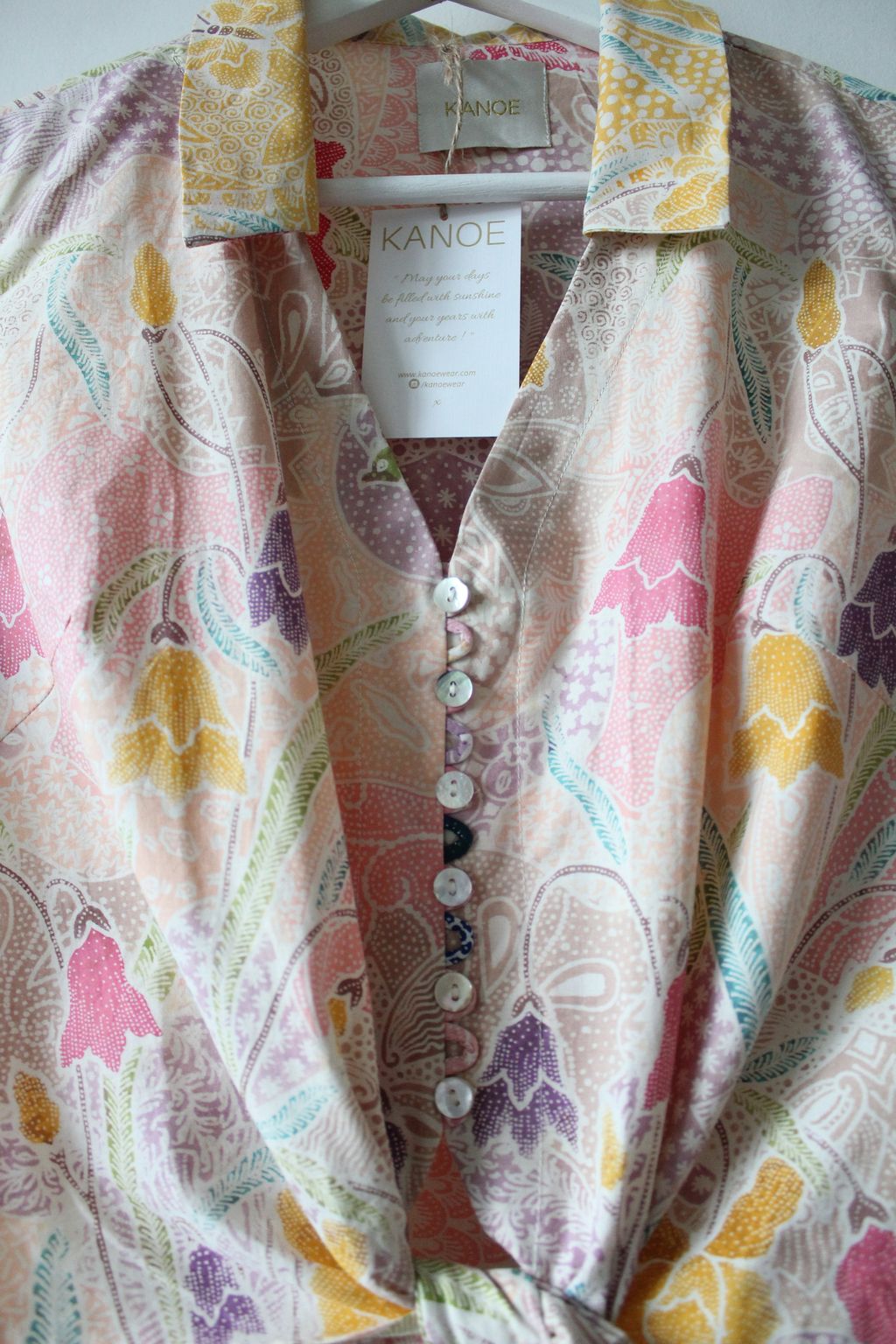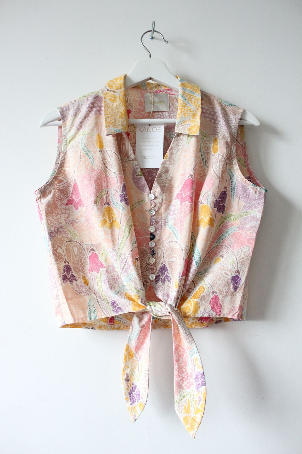 These pastel sleeveless front tie top are made from intricate hand stamped batik textile. Not one piece alike, you will love how beautiful the colours and print of this batik is made by skilled artisans of centuries of batik making wisdom. These batik come from a region where the batik makers have influence from Chinese and European merchants in which is on display in the motifs and colours of the batik.