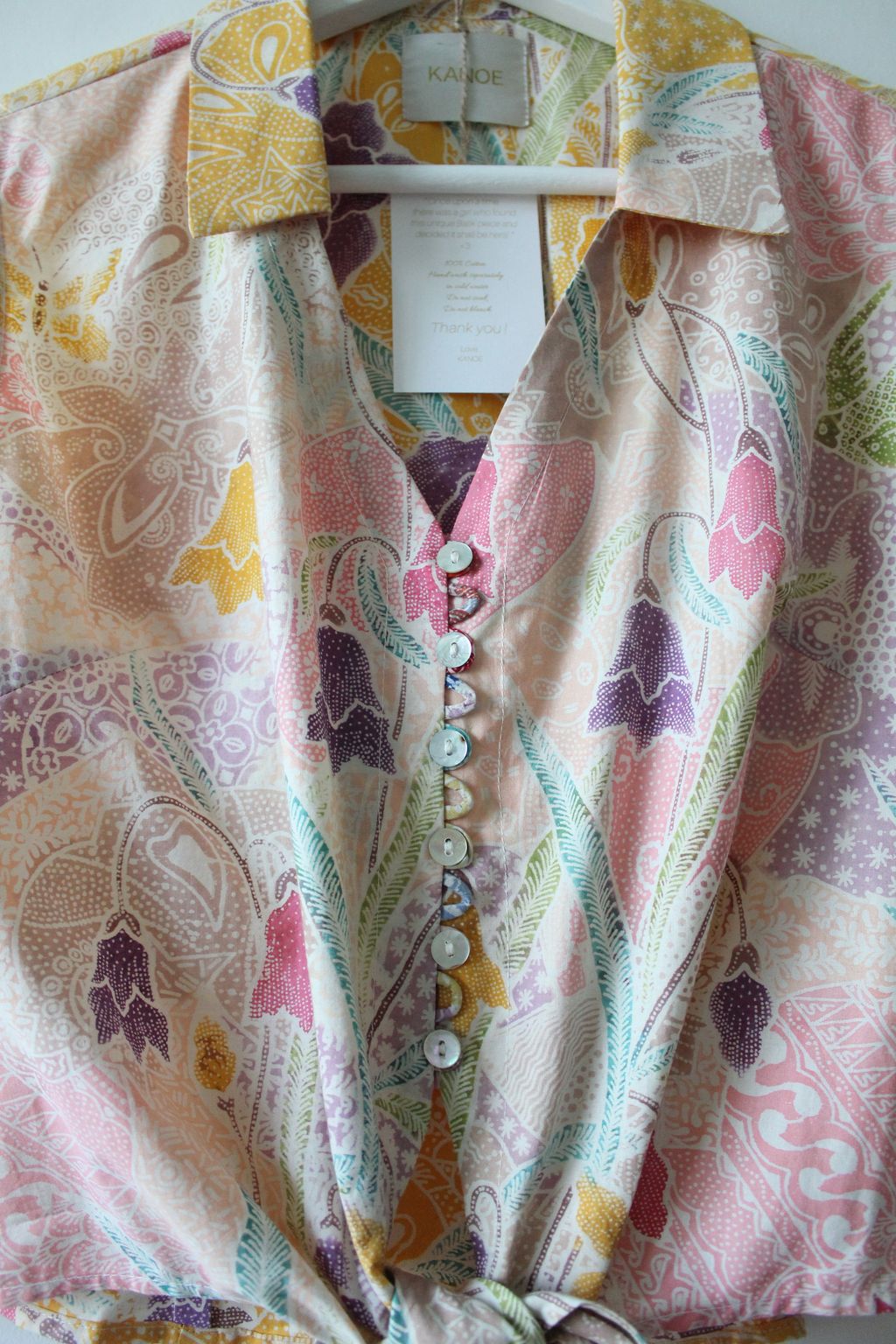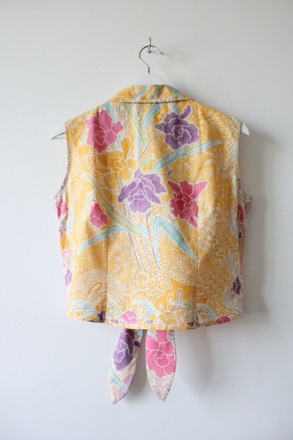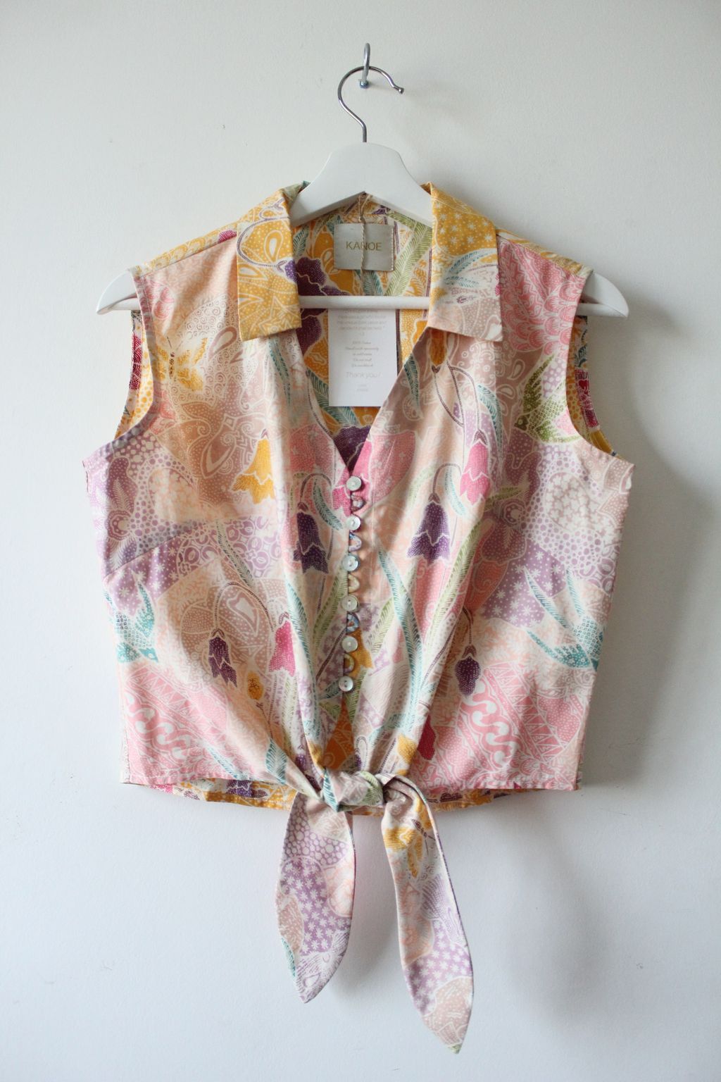 These pastel sleeveless front tie top are made from intricate hand stamped batik textile. Not one piece alike, you will love how beautiful the colours and print of this batik is made by skilled artisans of centuries of batik making wisdom. These batik come from a region where the batik makers have influence from Chinese and European merchants in which is on display in the motifs and colours of the batik.