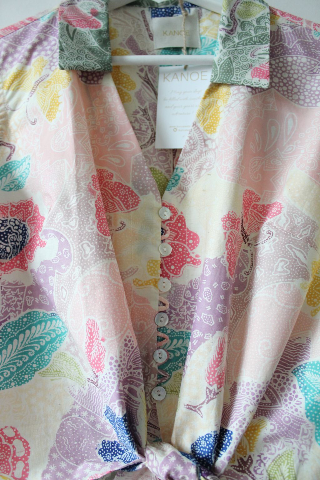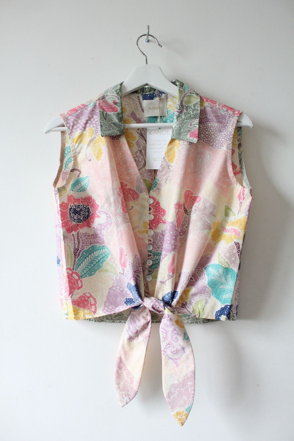 These pastel sleeveless front tie top are made from intricate hand stamped batik textile. Not one piece alike, you will love how beautiful the colours and print of this batik is made by skilled artisans of centuries of batik making wisdom. These batik come from a region where the batik makers have influence from Chinese and European merchants in which is on display in the motifs and colours of the batik.