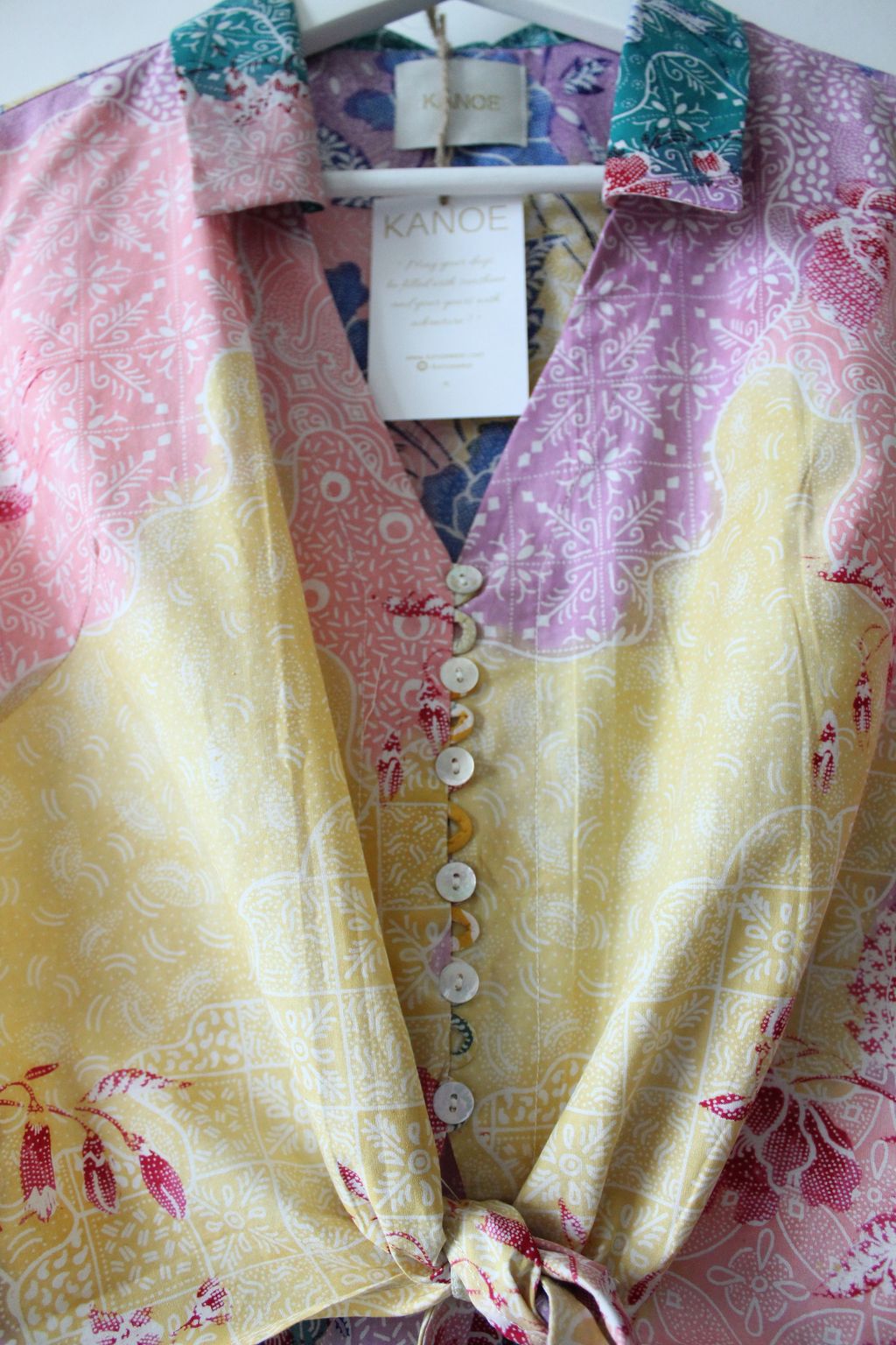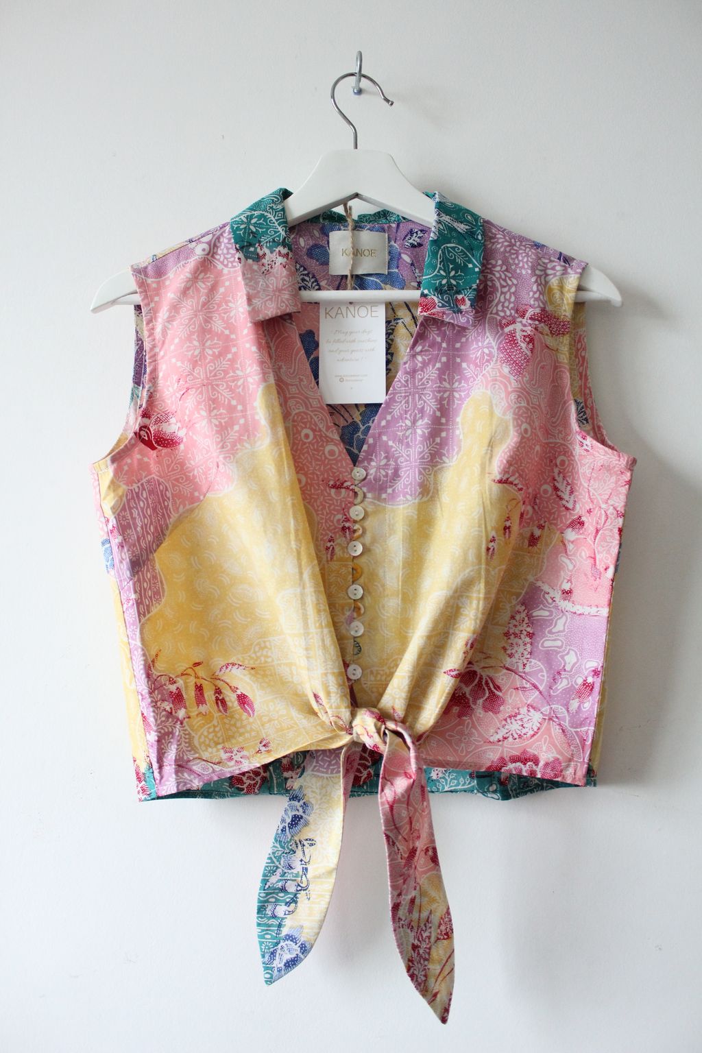 These pastel sleeveless front tie top are made from intricate hand stamped batik textile. Not one piece alike, you will love how beautiful the colours and print of this batik is made by skilled artisans of centuries of batik making wisdom. These batik come from a region where the batik makers have influence from Chinese and European merchants in which is on display in the motifs and colours of the batik.