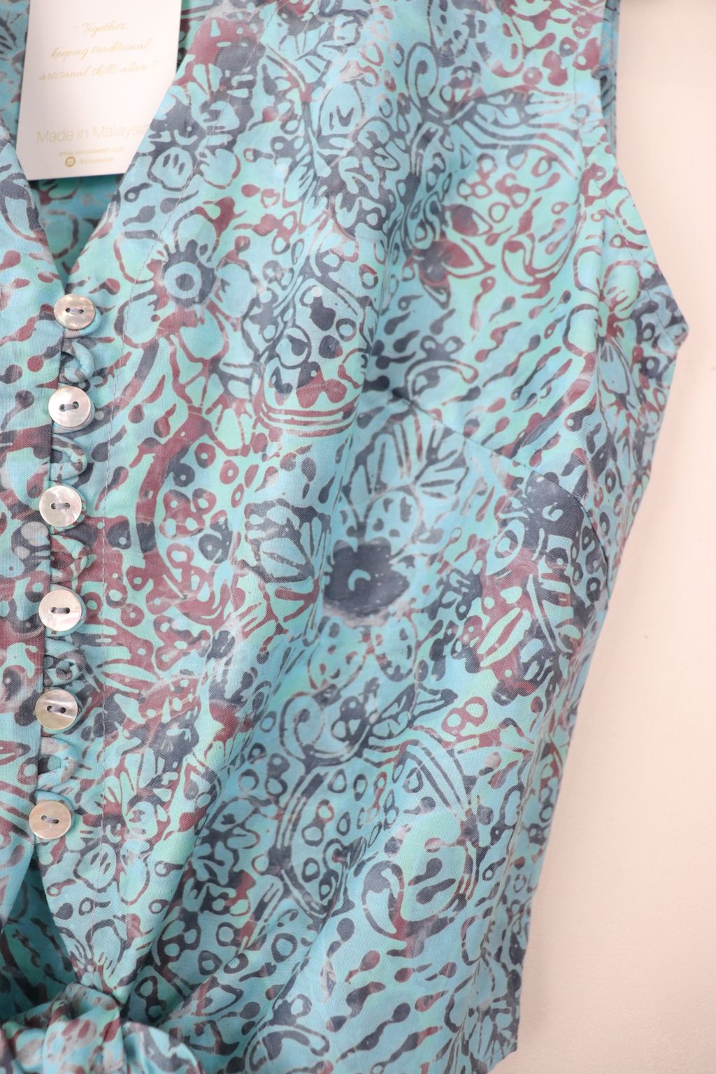 These pastel sleeveless front tie top are made from intricate hand stamped batik textile. Not one piece alike, you will love these beautiful pastel batiks made by skilled local artisans of talent. These batik textiles are made in Malaysia by artisans who push their creative boundaries to create timeless textiles in this modern age with traditional wisdom of age past.