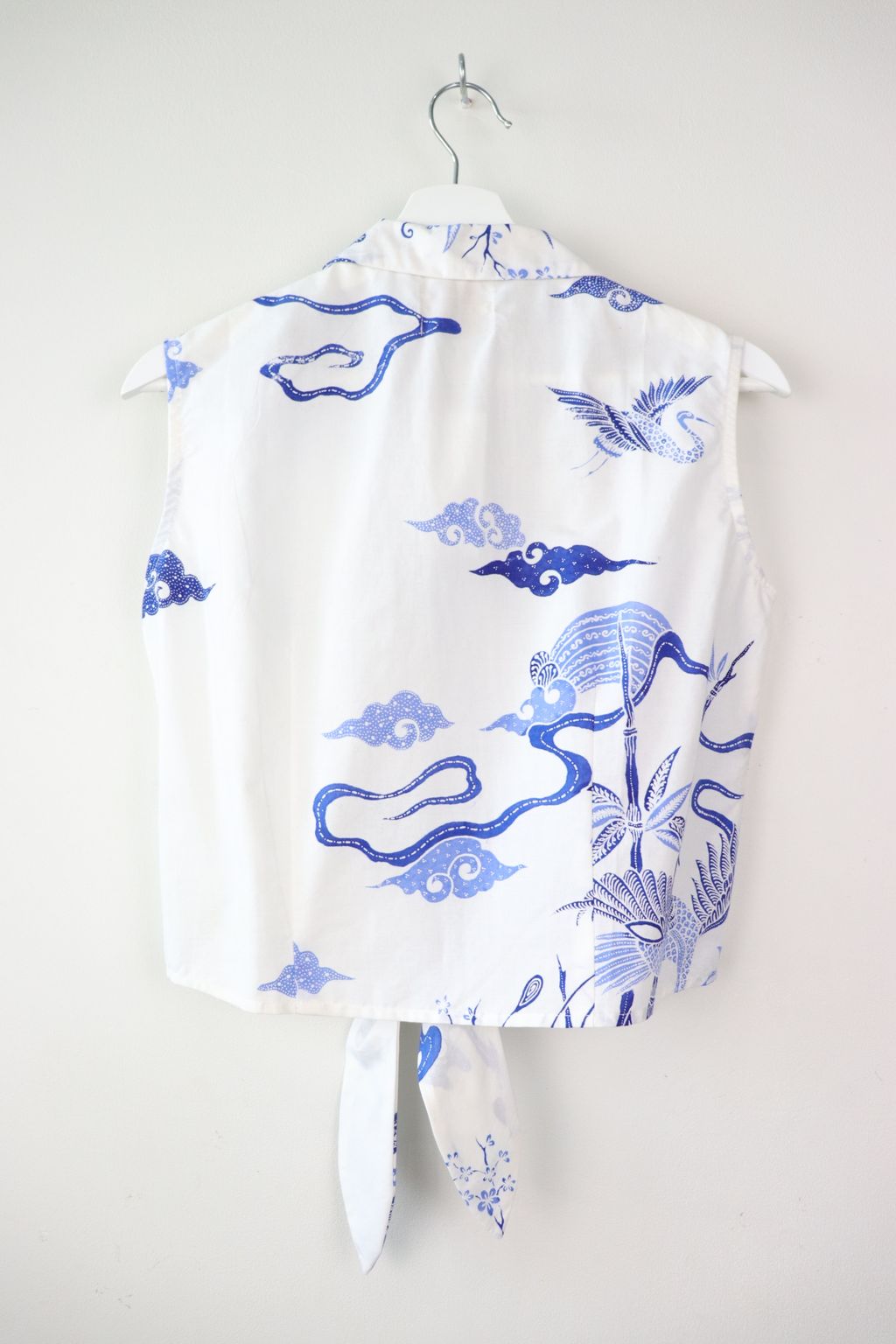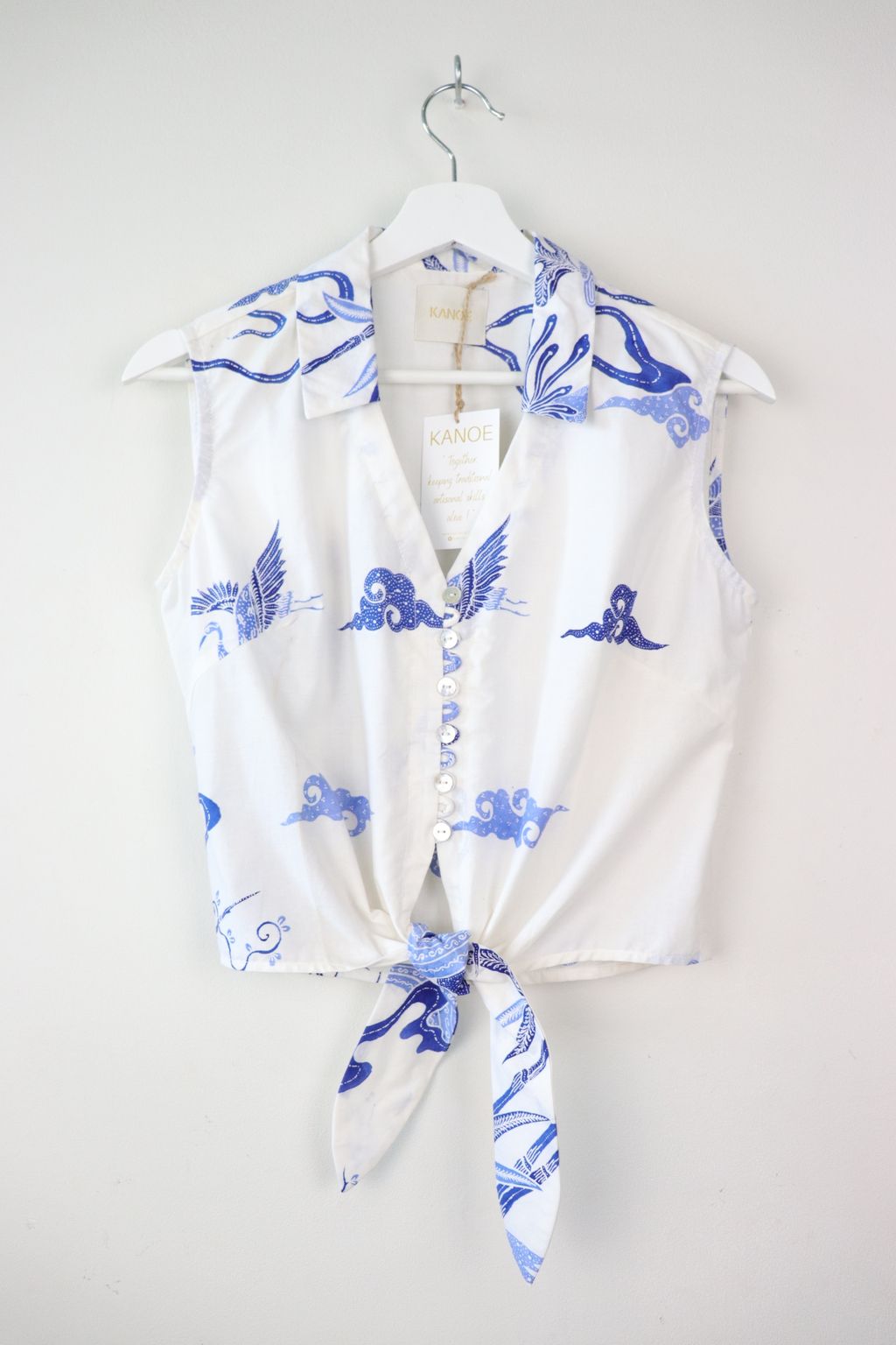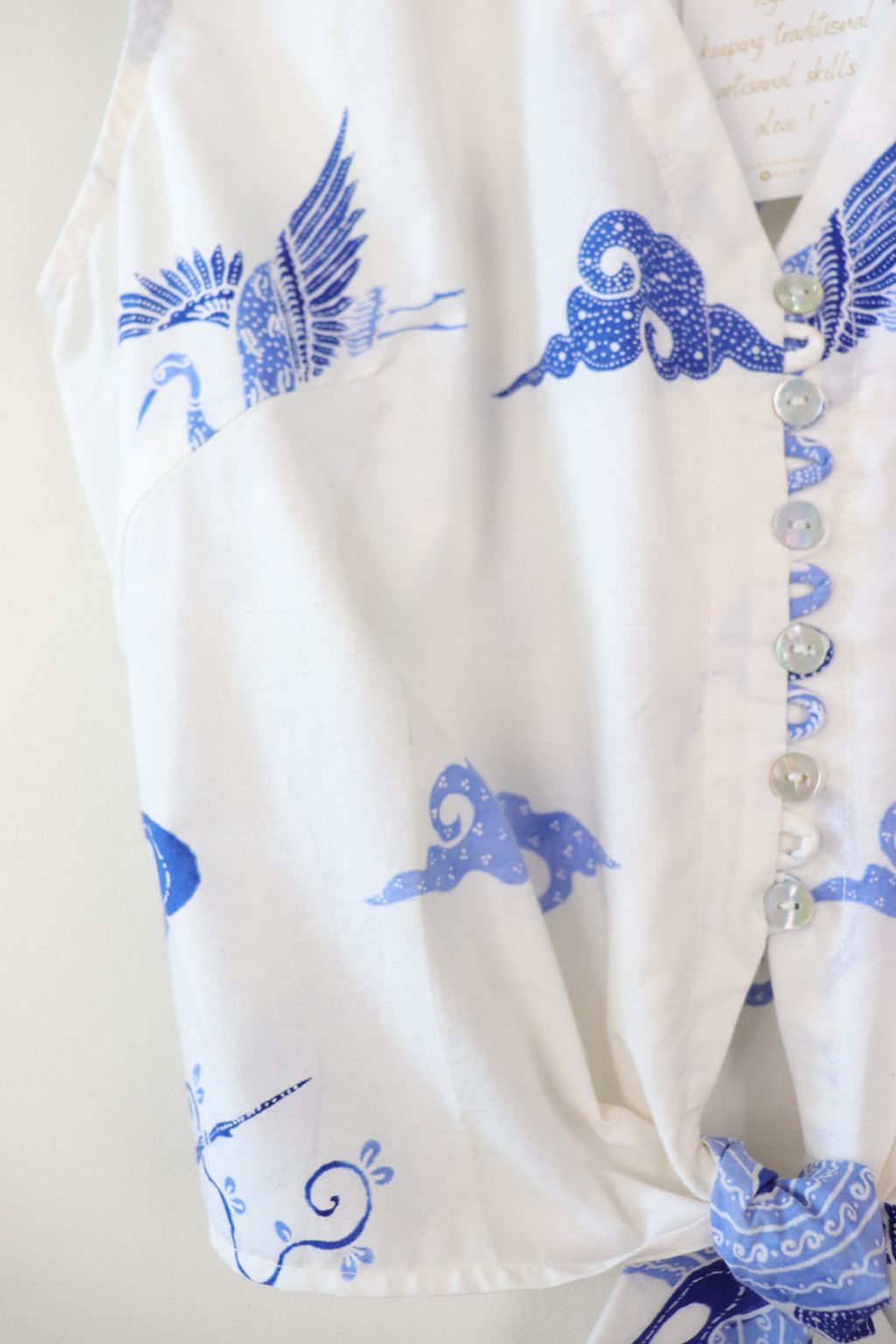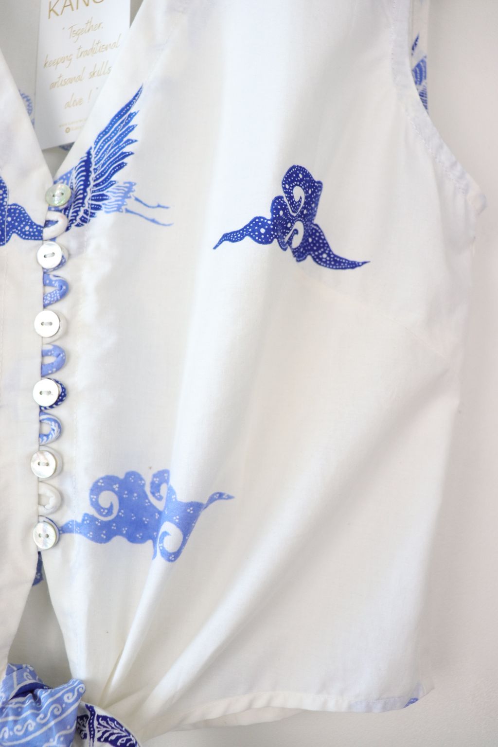 These pastel sleeveless front tie top are made from intricate hand stamped batik textile. Not one piece alike, you will love how beautiful the colours and print of this batik is made by skilled artisans of centuries of batik making wisdom. These batik come from a region where the batik makers have influence from Chinese and European merchants in which is on display in the motifs and colours of the batik.