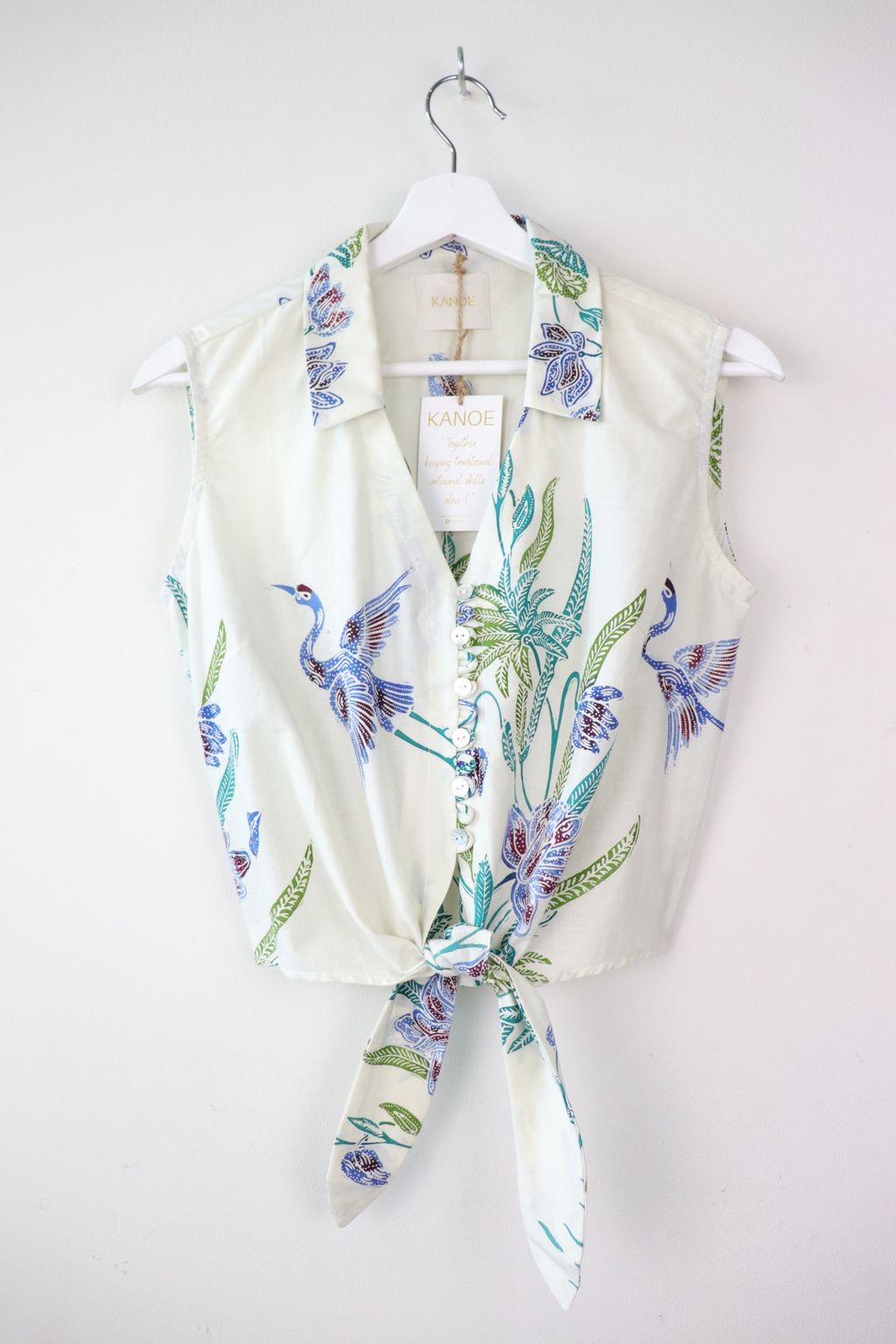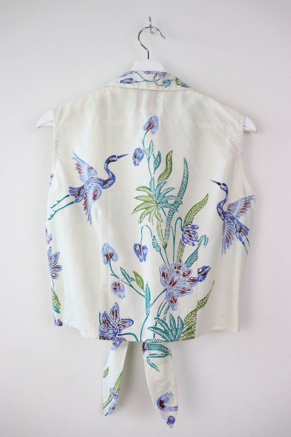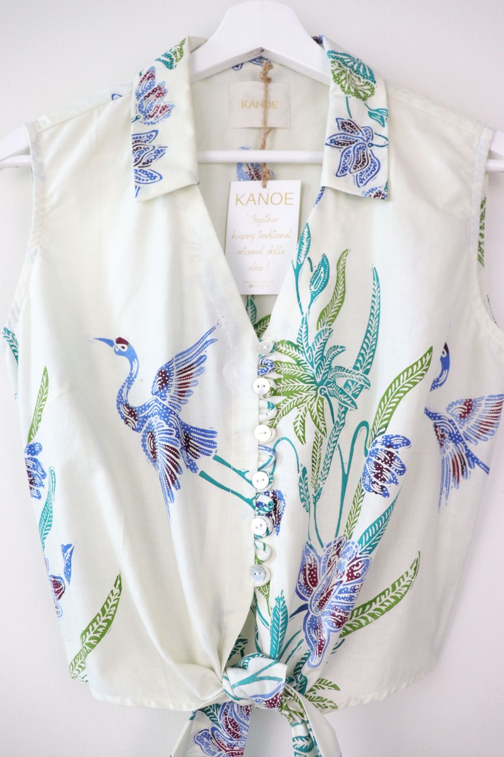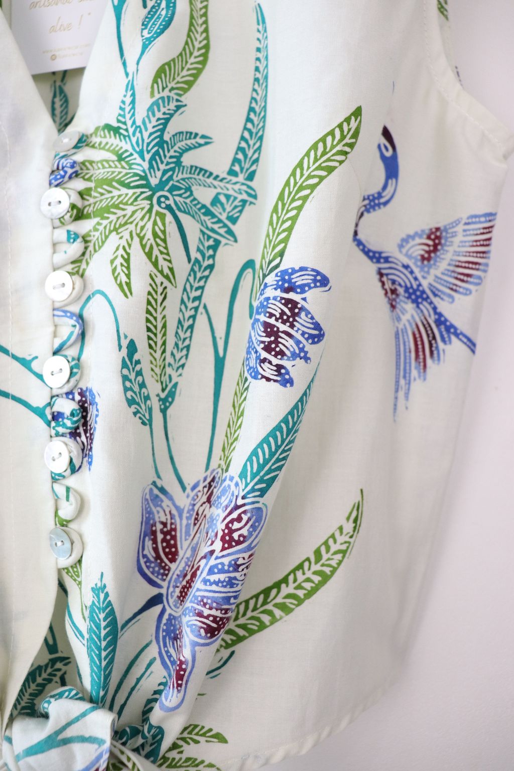 These pastel sleeveless front tie top are made from intricate hand stamped batik textile. Not one piece alike, you will love how beautiful the colours and print of this batik is made by skilled artisans of centuries of batik making wisdom. These batik come from a region where the batik makers have influence from Chinese and European merchants in which is on display in the motifs and colours of the batik.