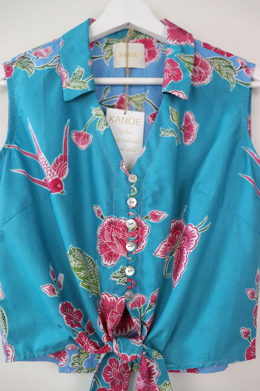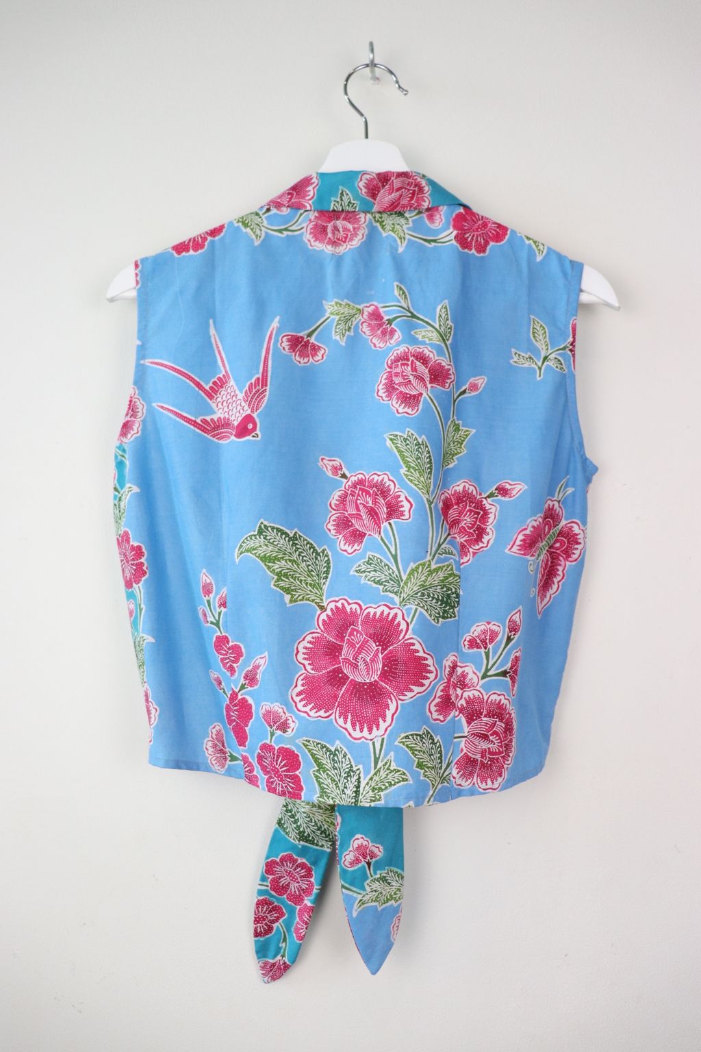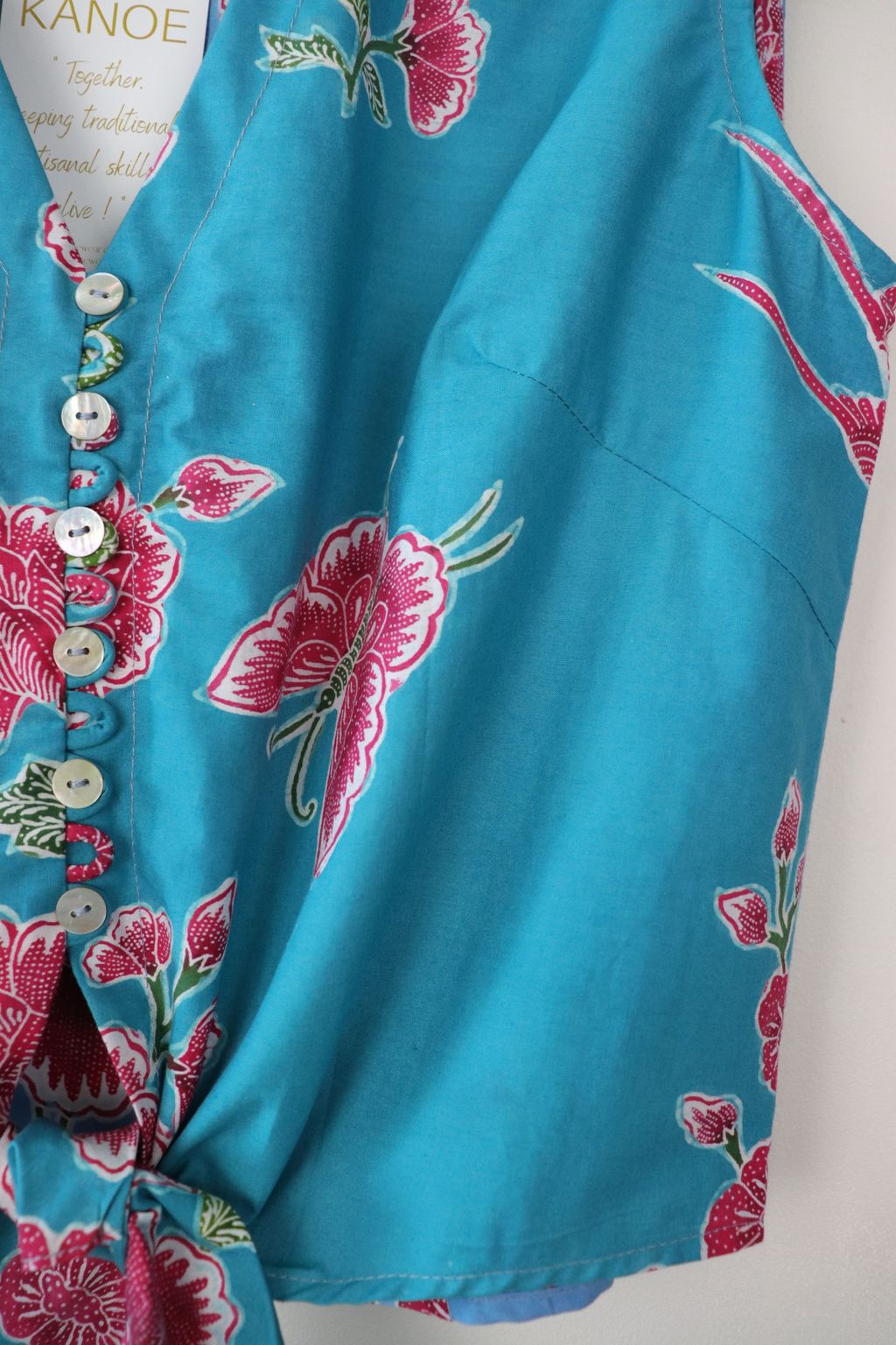 These pastel sleeveless front tie top are made from intricate hand stamped batik textile. Not one piece alike, you will love how beautiful the colours and print of this batik is made by skilled artisans of centuries of batik making wisdom. These batik come from a region where the batik makers have influence from Chinese and European merchants in which is on display in the motifs and colours of the batik.