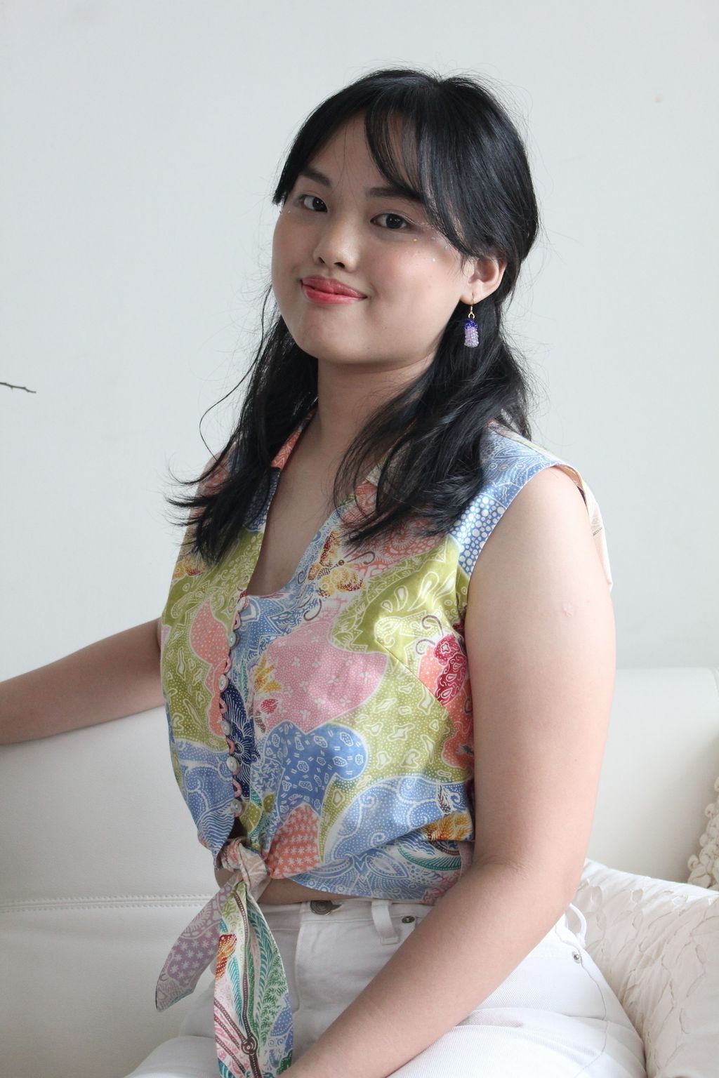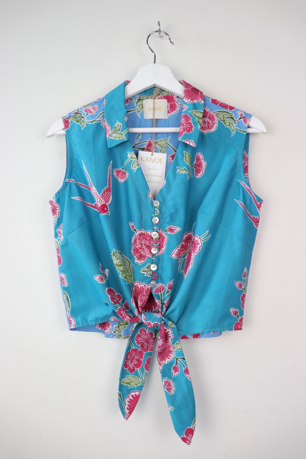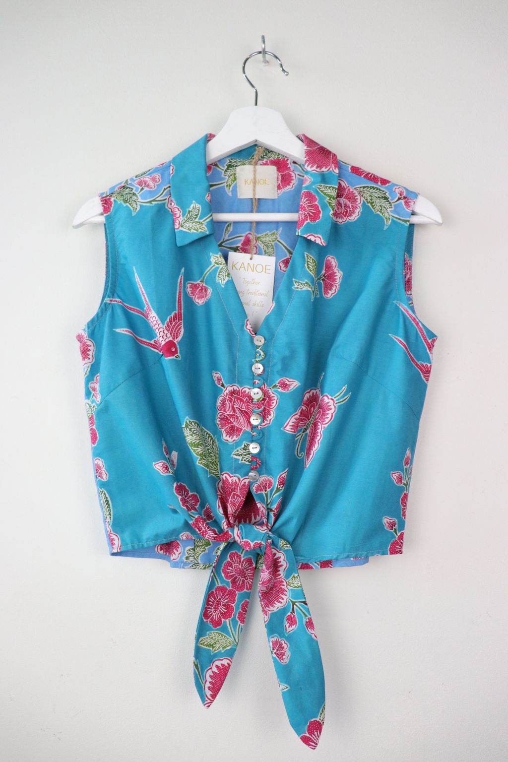 These pastel sleeveless front tie top are made from intricate hand stamped batik textile. Not one piece alike, you will love how beautiful the colours and print of this batik is made by skilled artisans of centuries of batik making wisdom. These batik come from a region where the batik makers have influence from Chinese and European merchants in which is on display in the motifs and colours of the batik.