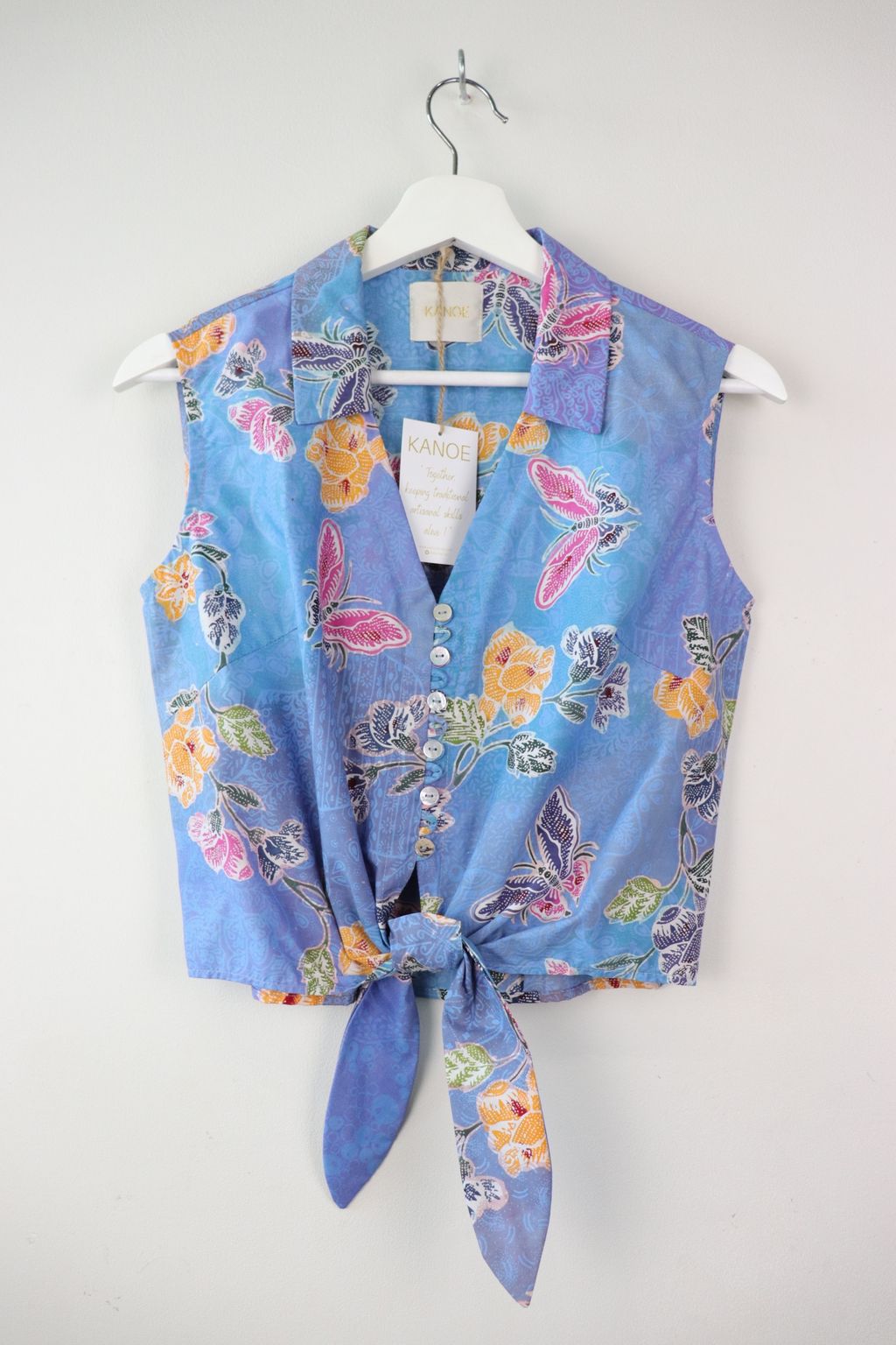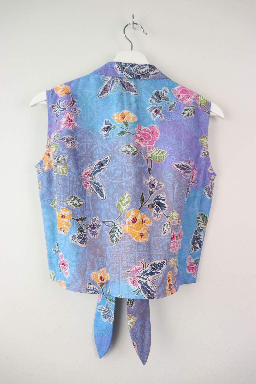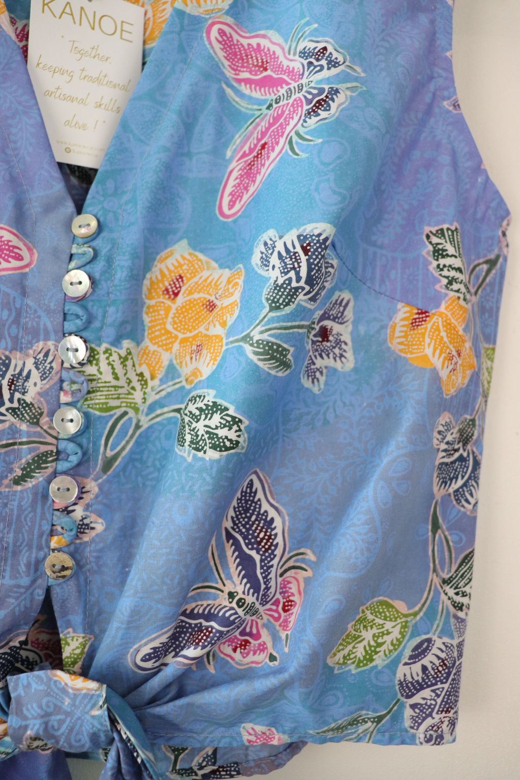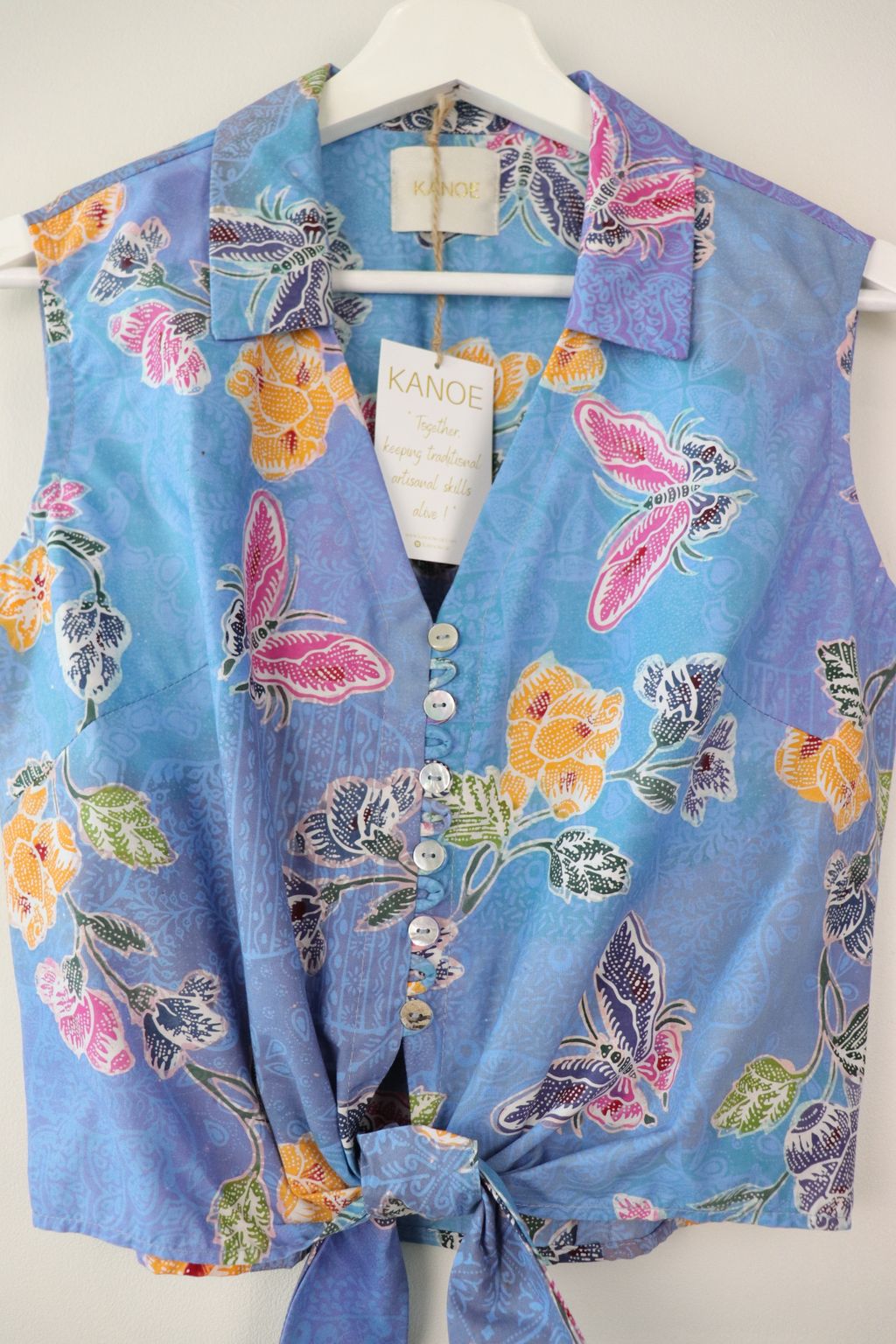 These pastel sleeveless front tie top are made from intricate hand stamped batik textile. Not one piece alike, you will love how beautiful the colours and print of this batik is made by skilled artisans of centuries of batik making wisdom. These batik come from a region where the batik makers have influence from Chinese and European merchants in which is on display in the motifs and colours of the batik.