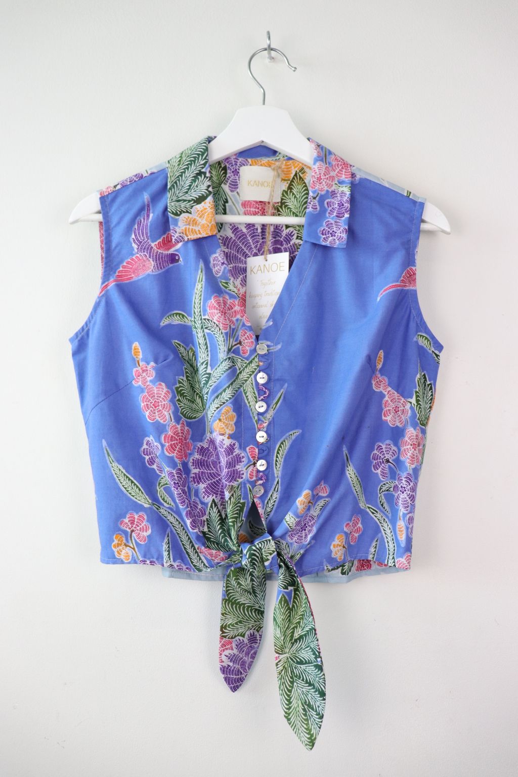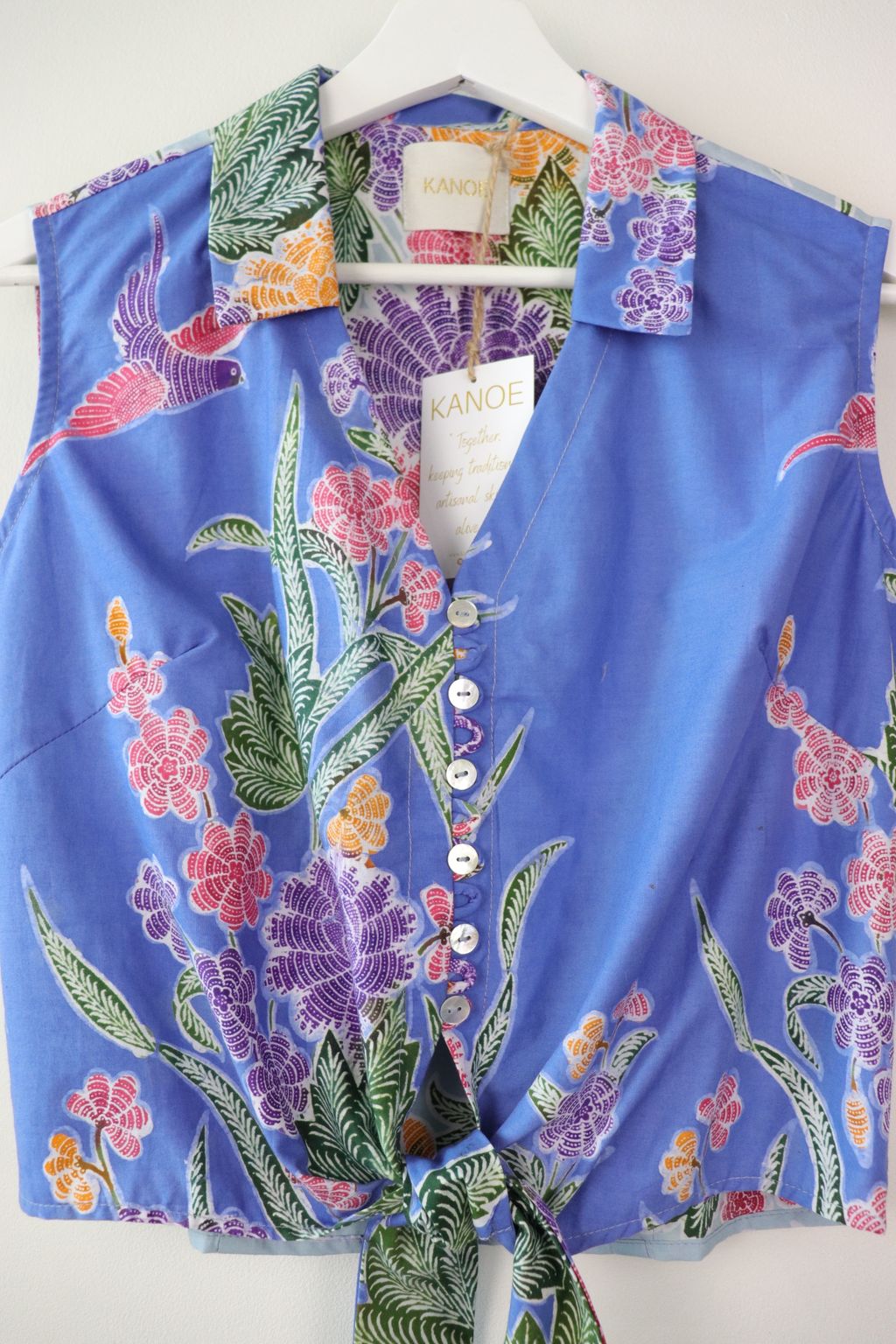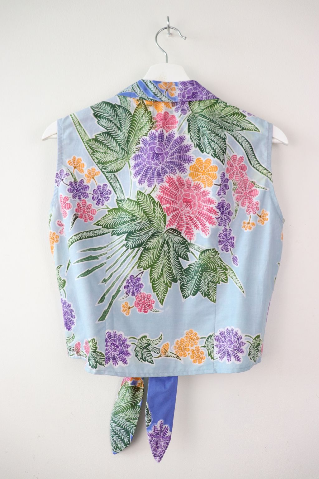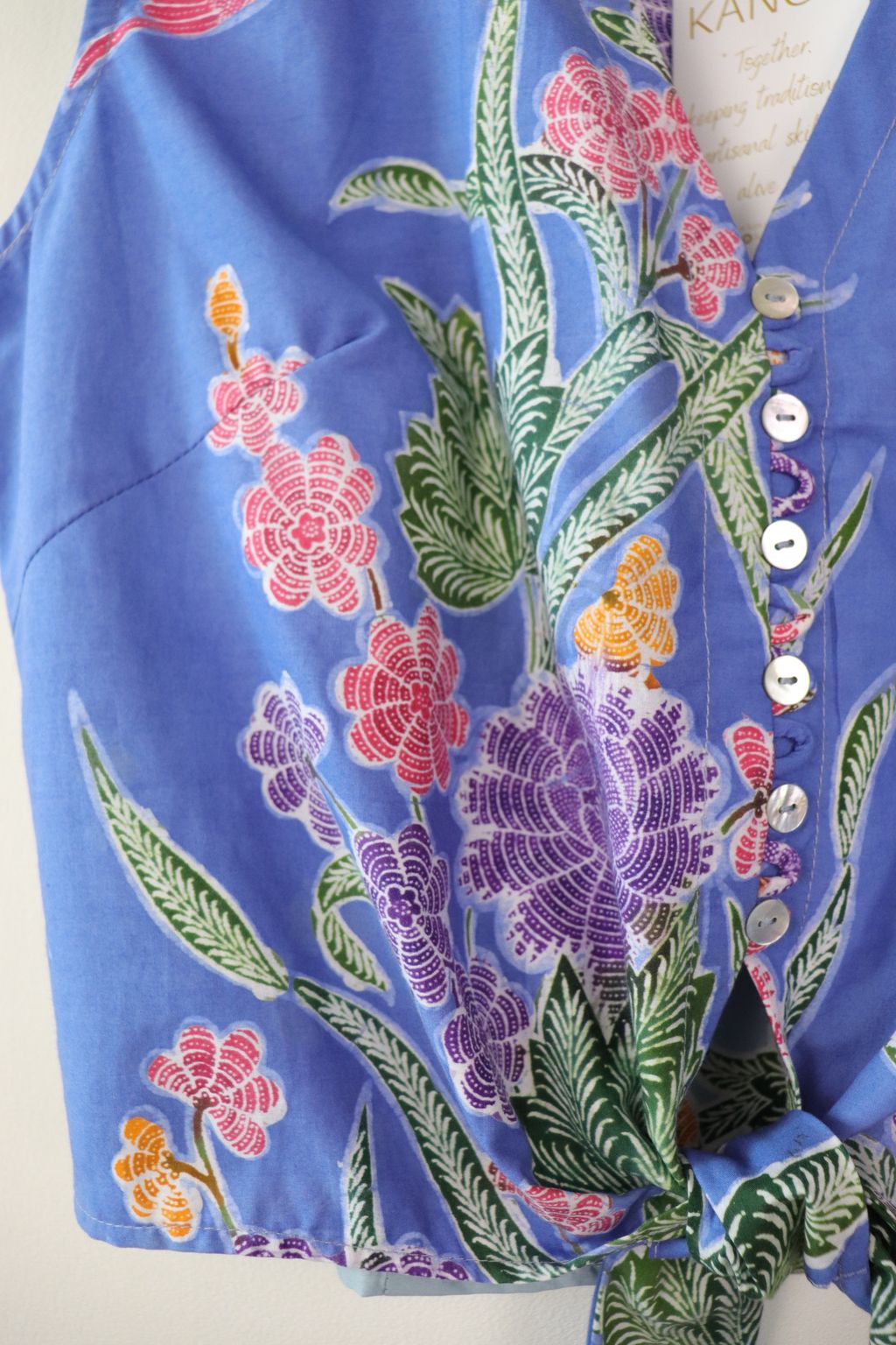 These pastel sleeveless front tie top are made from intricate hand stamped batik textile. Not one piece alike, you will love how beautiful the colours and print of this batik is made by skilled artisans of centuries of batik making wisdom. These batik come from a region where the batik makers have influence from Chinese and European merchants in which is on display in the motifs and colours of the batik.
