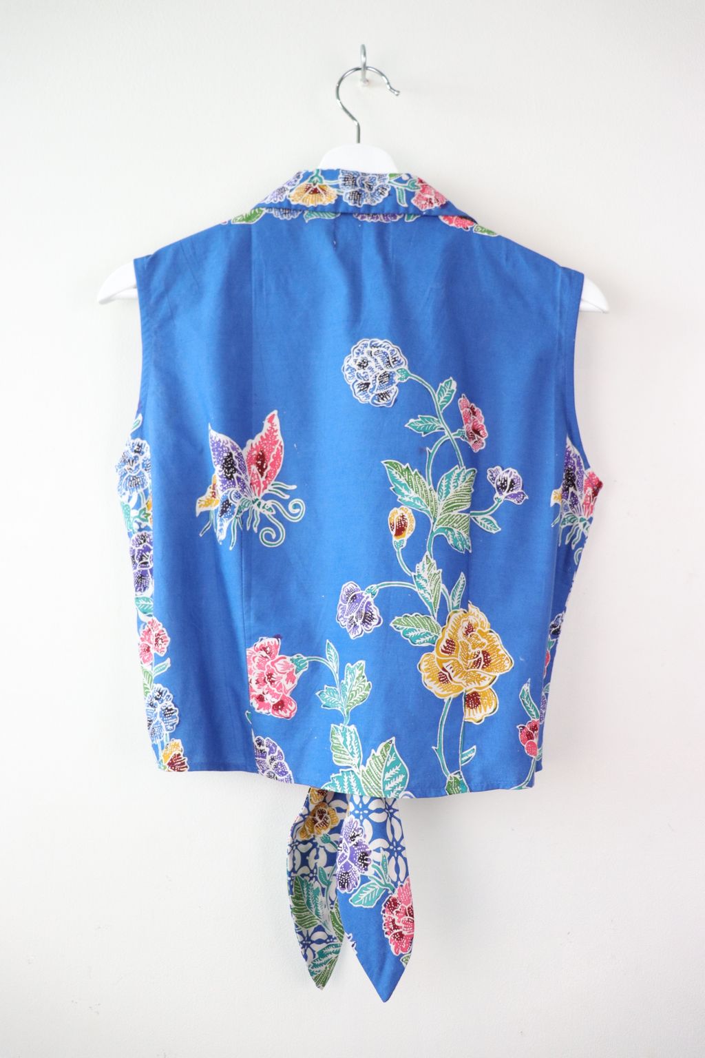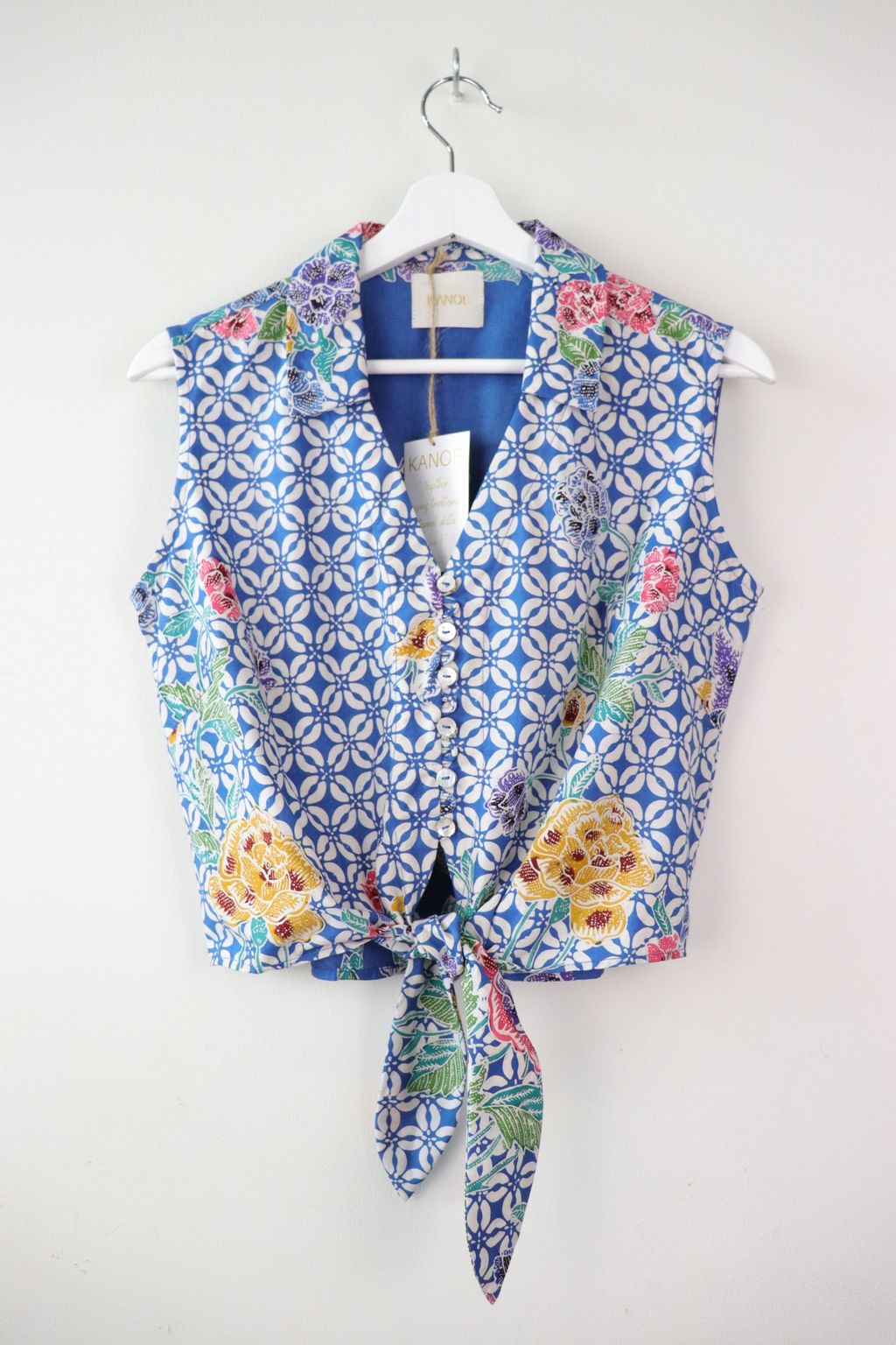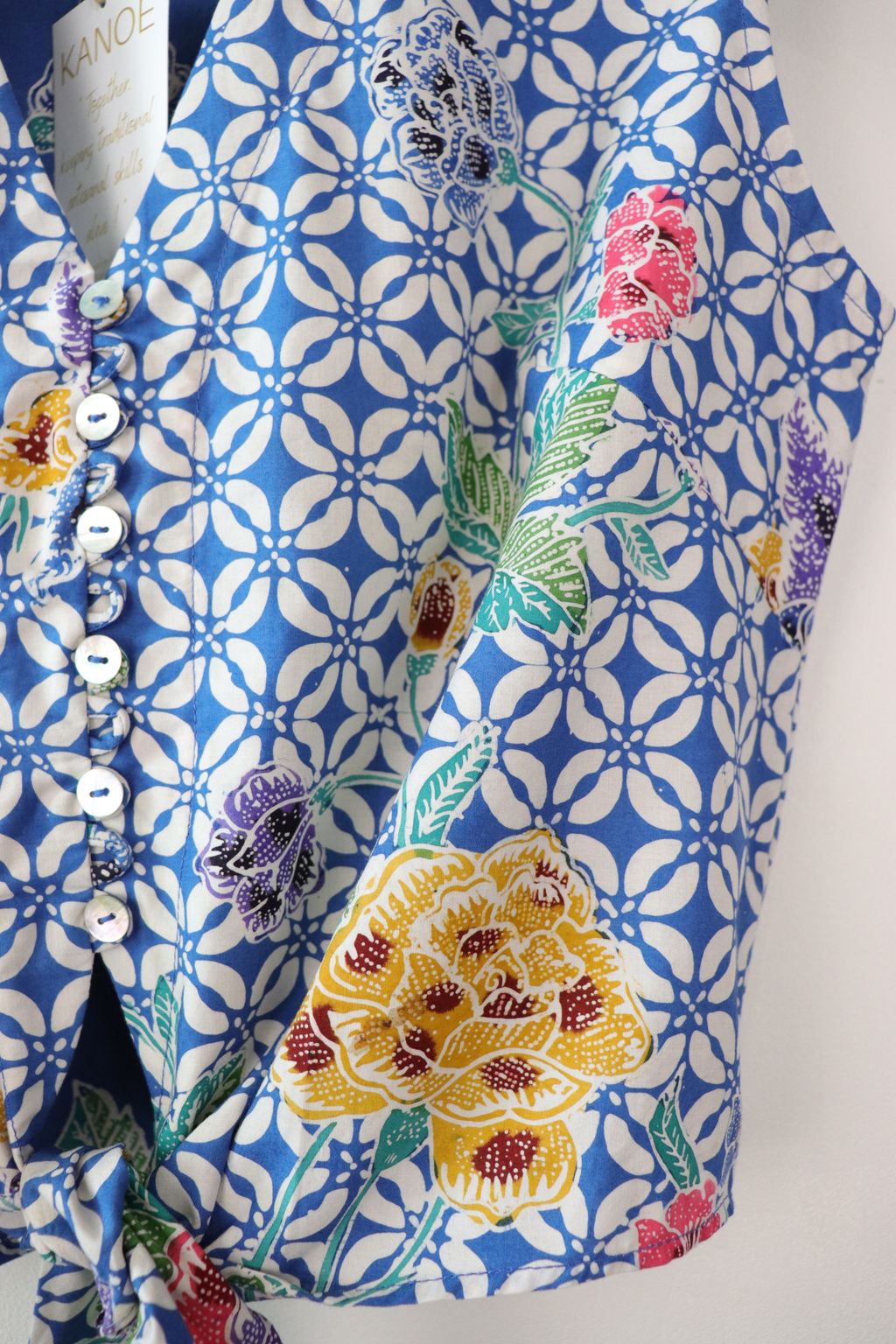 These pastel sleeveless front tie top are made from intricate hand stamped batik textile. Not one piece alike, you will love how beautiful the colours and print of this batik is made by skilled artisans of centuries of batik making wisdom. These batik come from a region where the batik makers have influence from Chinese and European merchants in which is on display in the motifs and colours of the batik.