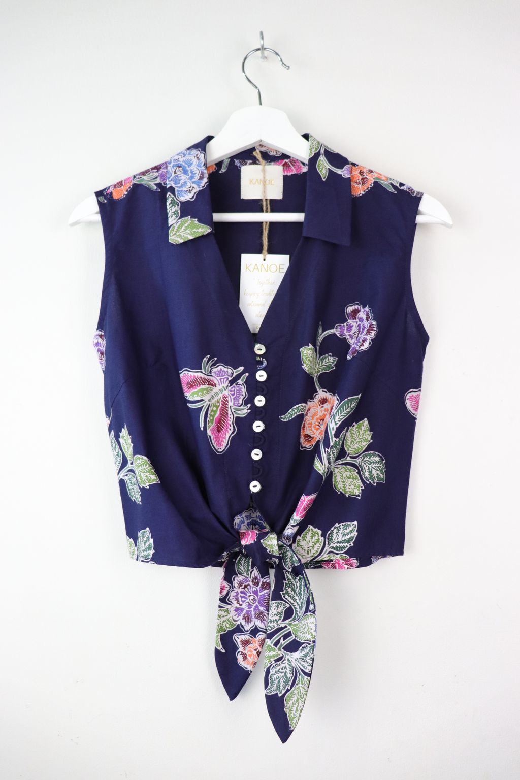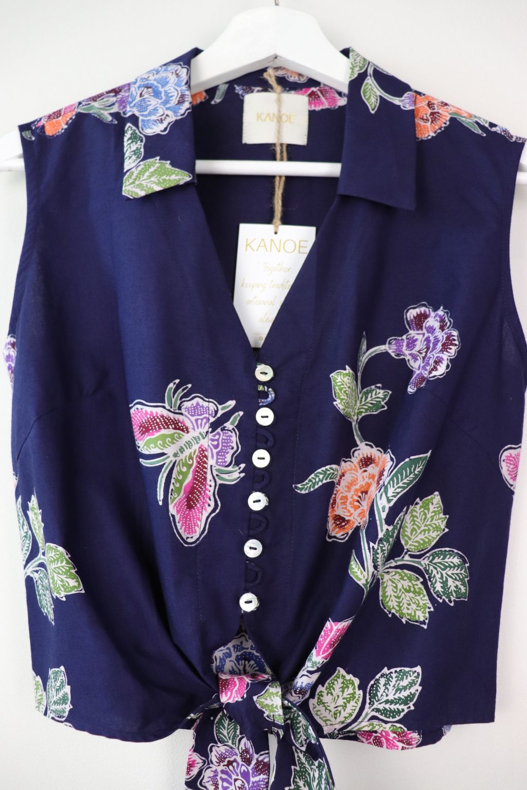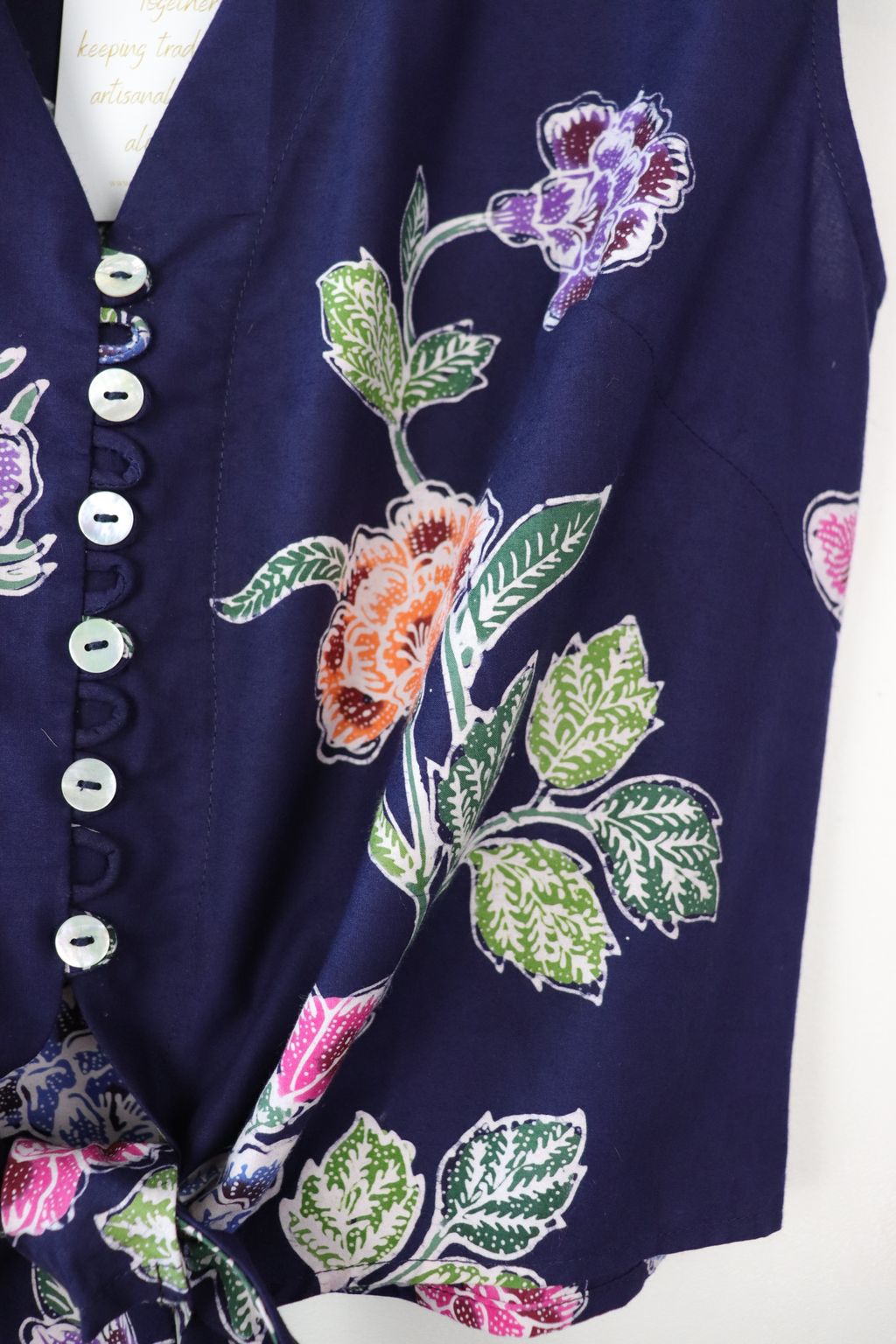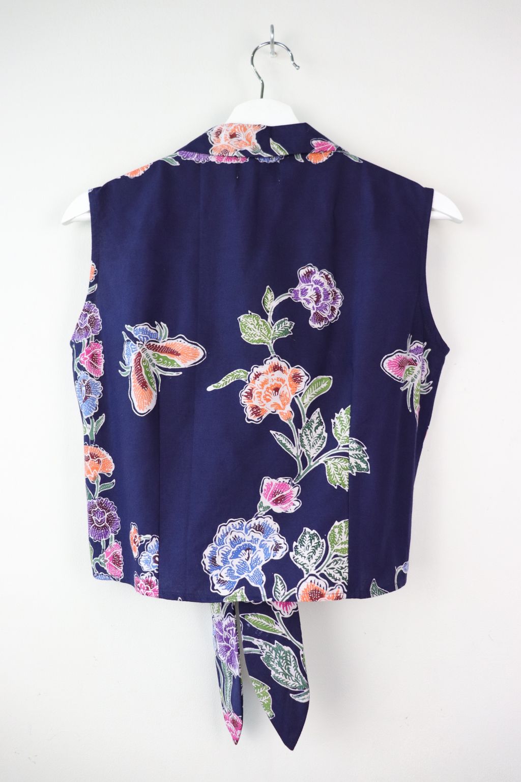These pastel sleeveless front tie top are made from intricate hand stamped batik textile. Not one piece alike, you will love how beautiful the colours and print of this batik is made by skilled artisans of centuries of batik making wisdom. These batik come from a region where the batik makers have influence from Chinese and European merchants in which is on display in the motifs and colours of the batik.