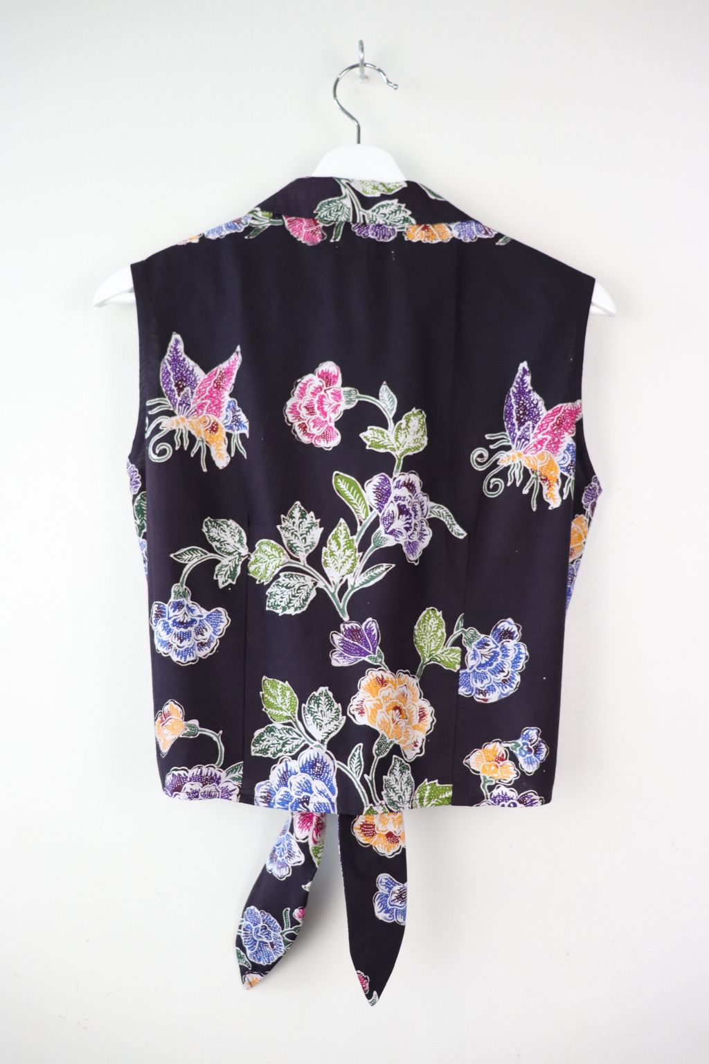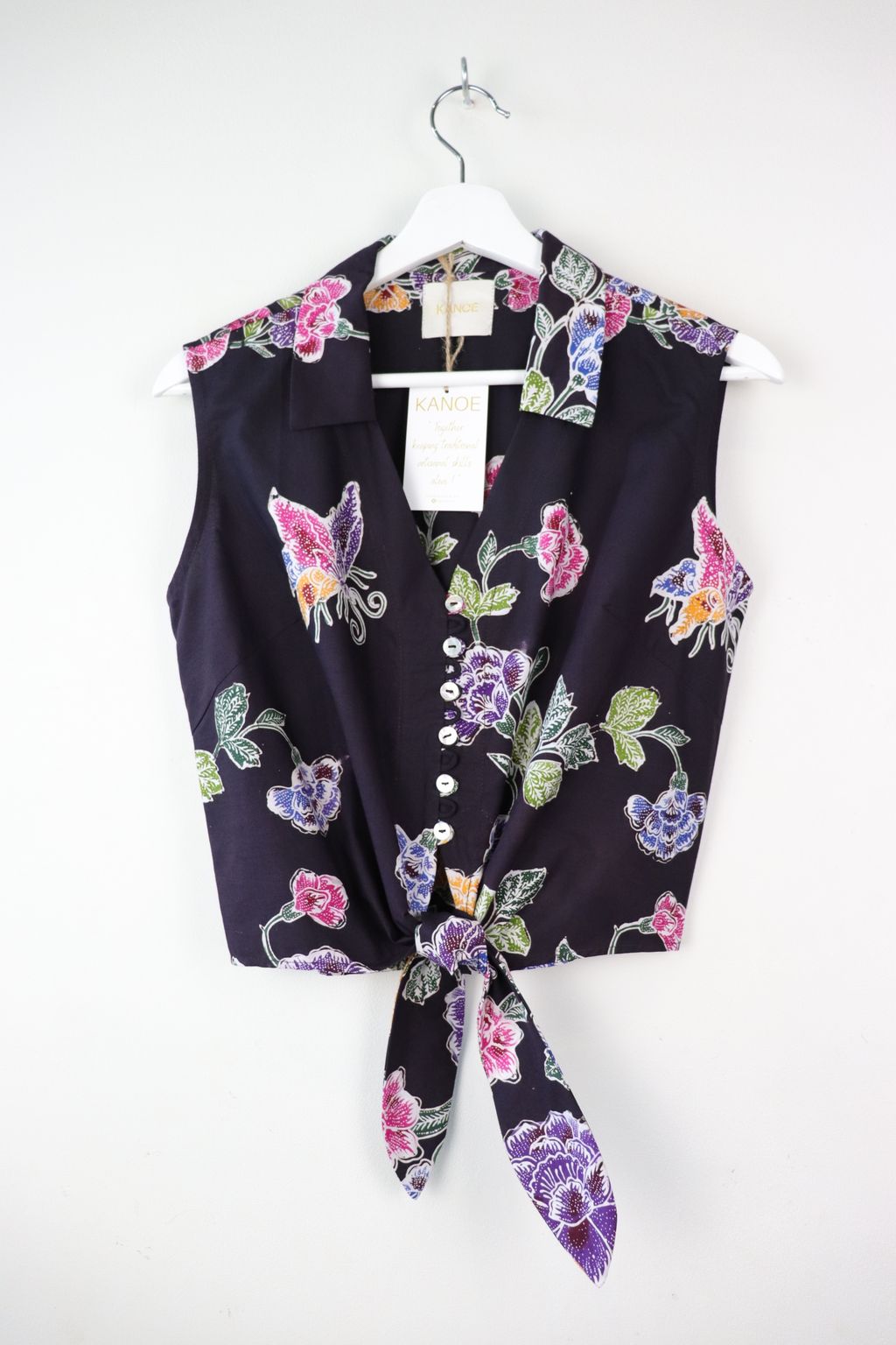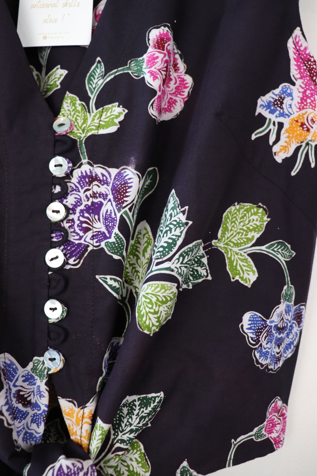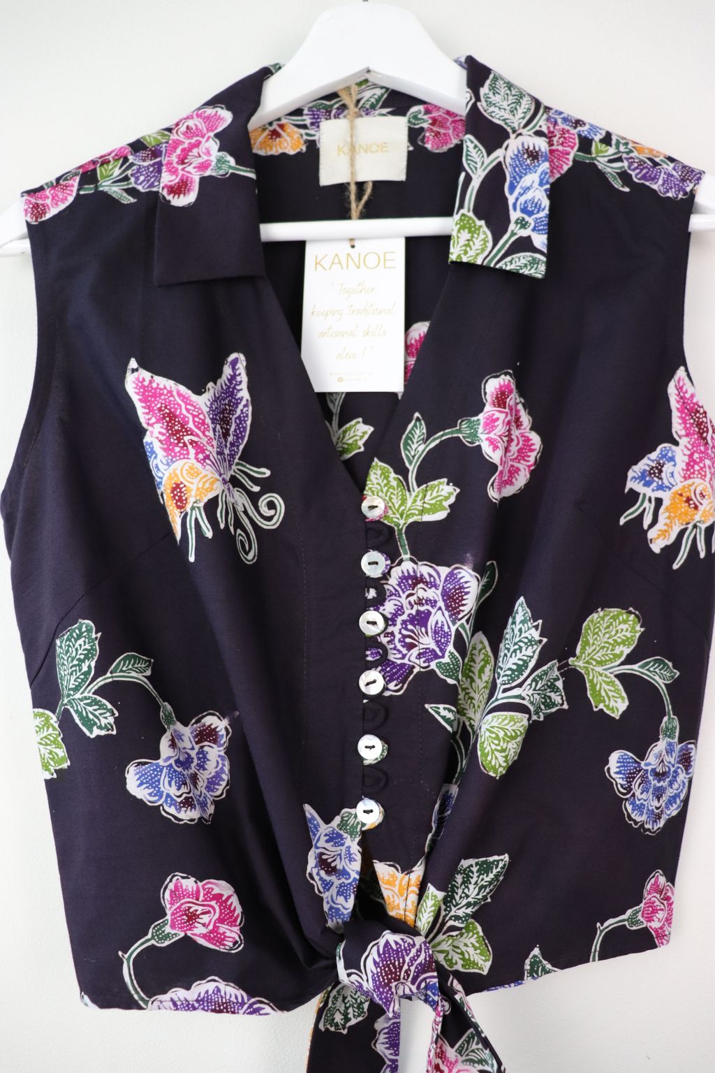 These pastel sleeveless front tie top are made from intricate hand stamped batik textile. Not one piece alike, you will love how beautiful the colours and print of this batik is made by skilled artisans of centuries of batik making wisdom. These batik come from a region where the batik makers have influence from Chinese and European merchants in which is on display in the motifs and colours of the batik.