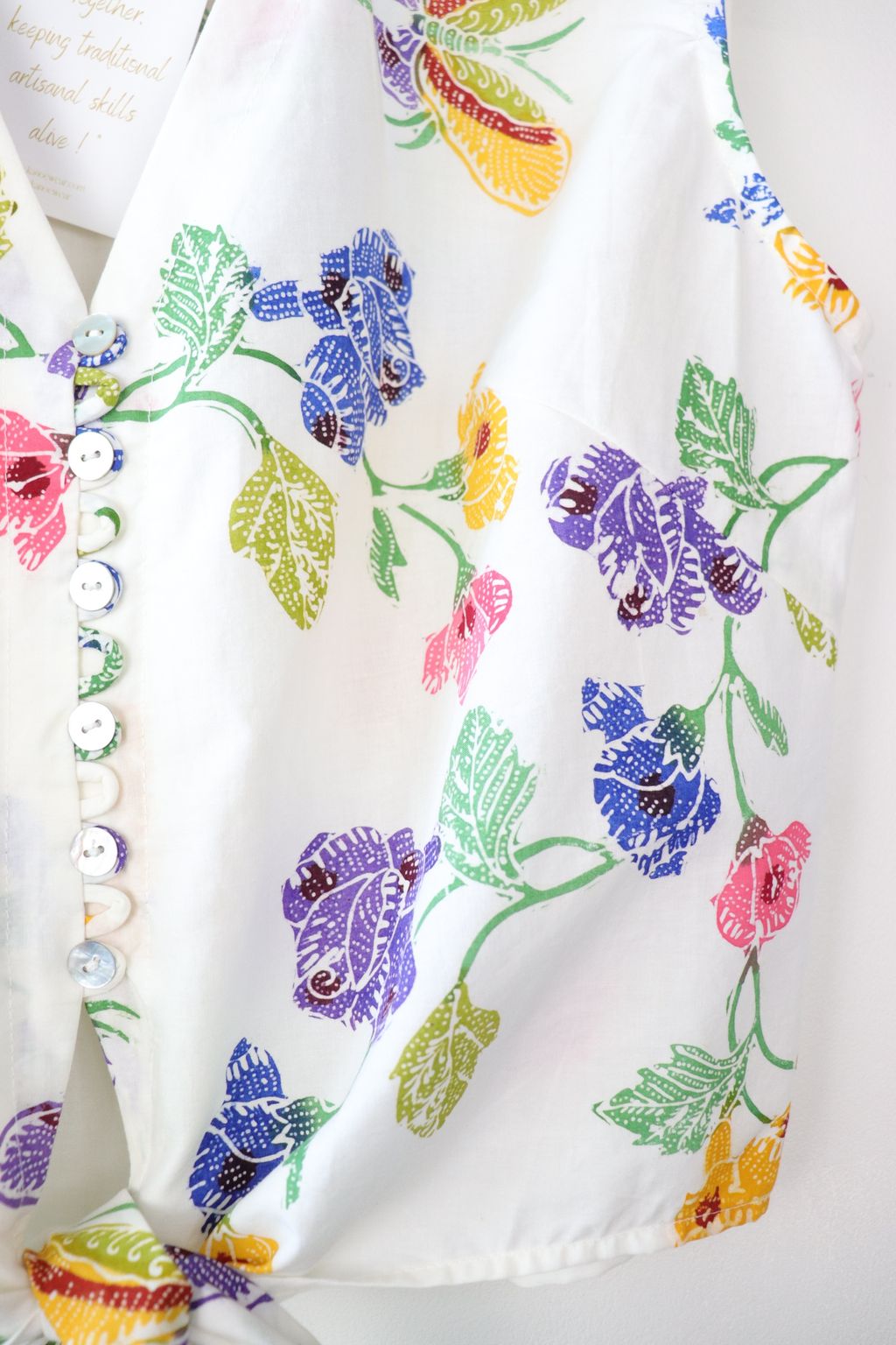These pastel sleeveless front tie top are made from intricate hand stamped batik textile. Not one piece alike, you will love how beautiful the colours and print of this batik is made by skilled artisans of centuries of batik making wisdom. These batik come from a region where the batik makers have influence from Chinese and European merchants in which is on display in the motifs and colours of the batik.