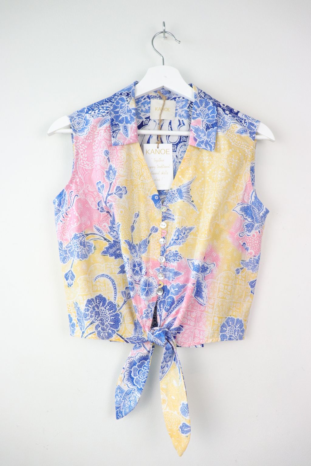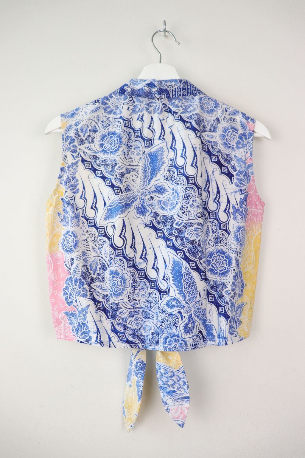 These pastel sleeveless front tie top are made from intricate hand stamped batik textile. Not one piece alike, you will love how beautiful the colours and print of this batik is made by skilled artisans of centuries of batik making wisdom. These batik come from a region where the batik makers have influence from Chinese and European merchants in which is on display in the motifs and colours of the batik.