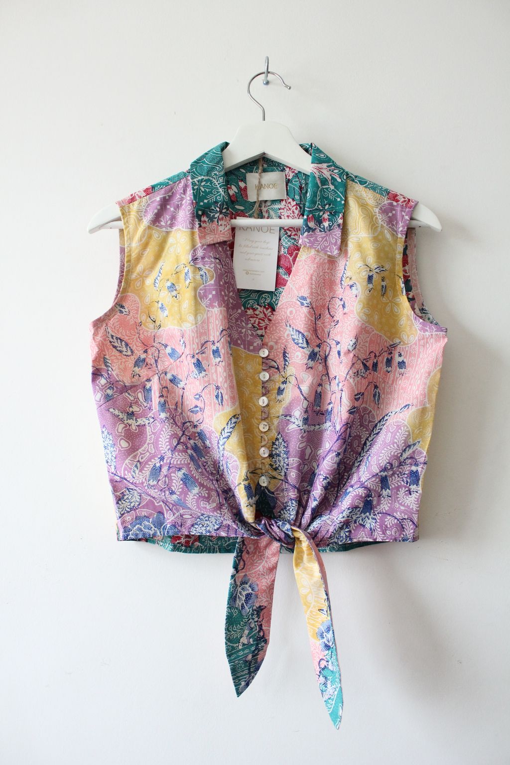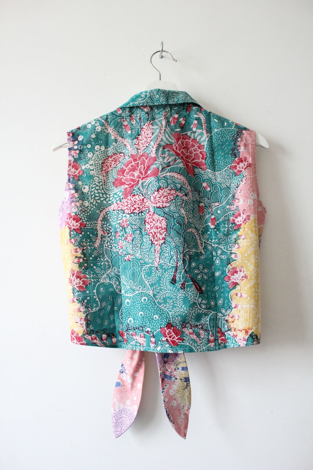These pastel sleeveless front tie top are made from intricate hand stamped batik textile. Not one piece alike, you will love how beautiful the colours and print of this batik is made by skilled artisans of centuries of batik making wisdom. These batik come from a region where the batik makers have influence from Chinese and European merchants in which is on display in the motifs and colours of the batik.