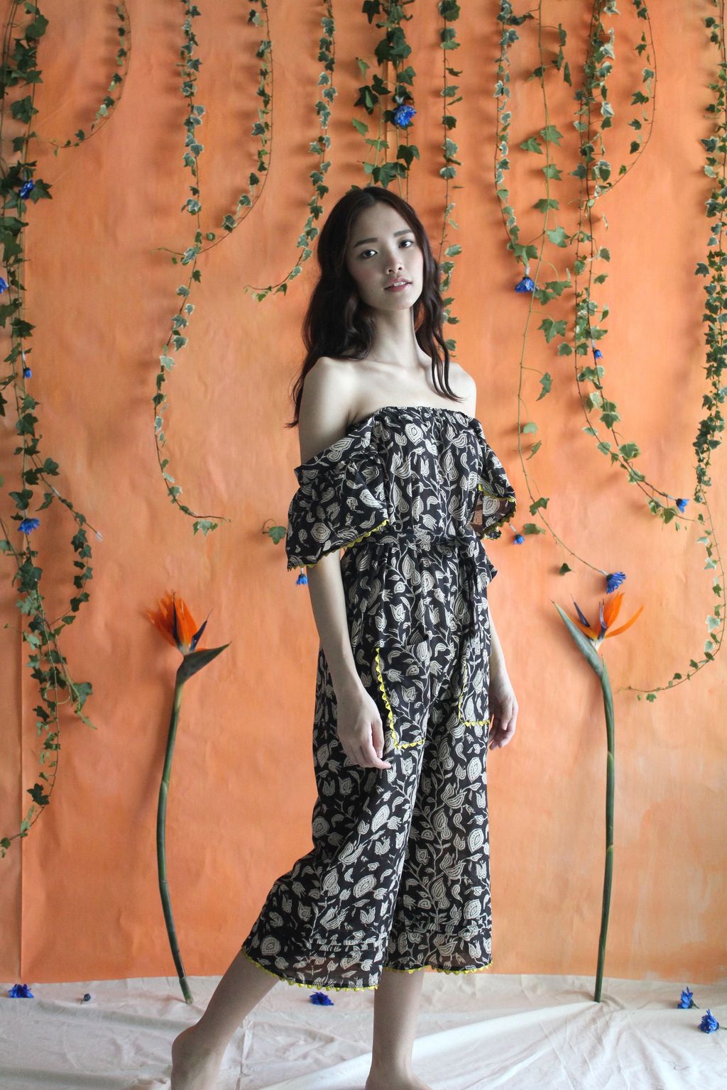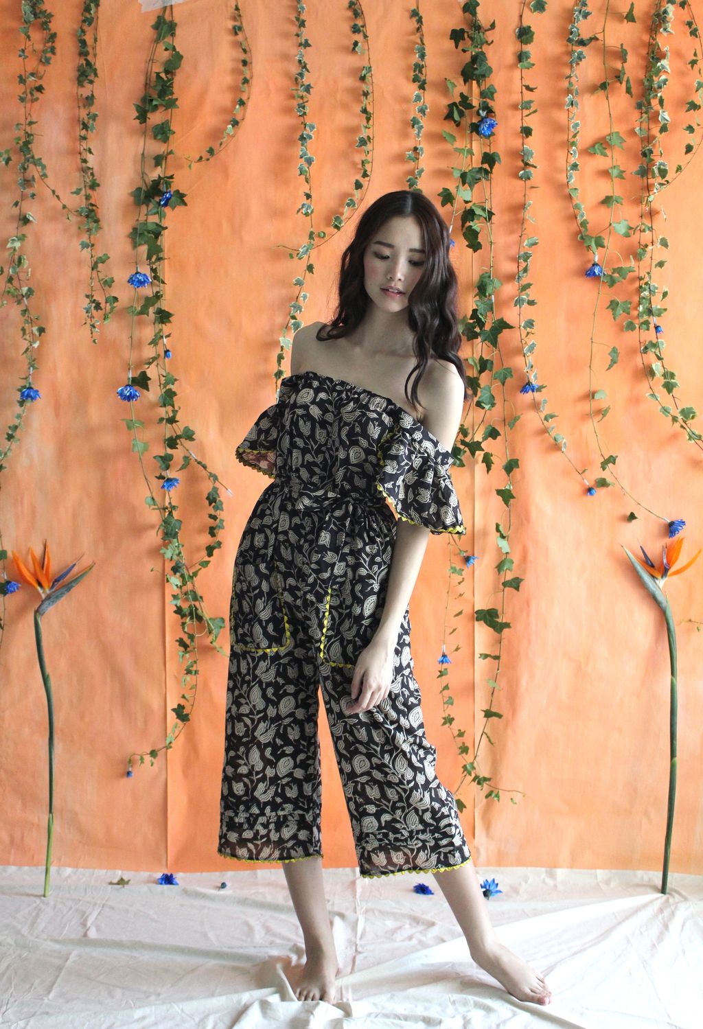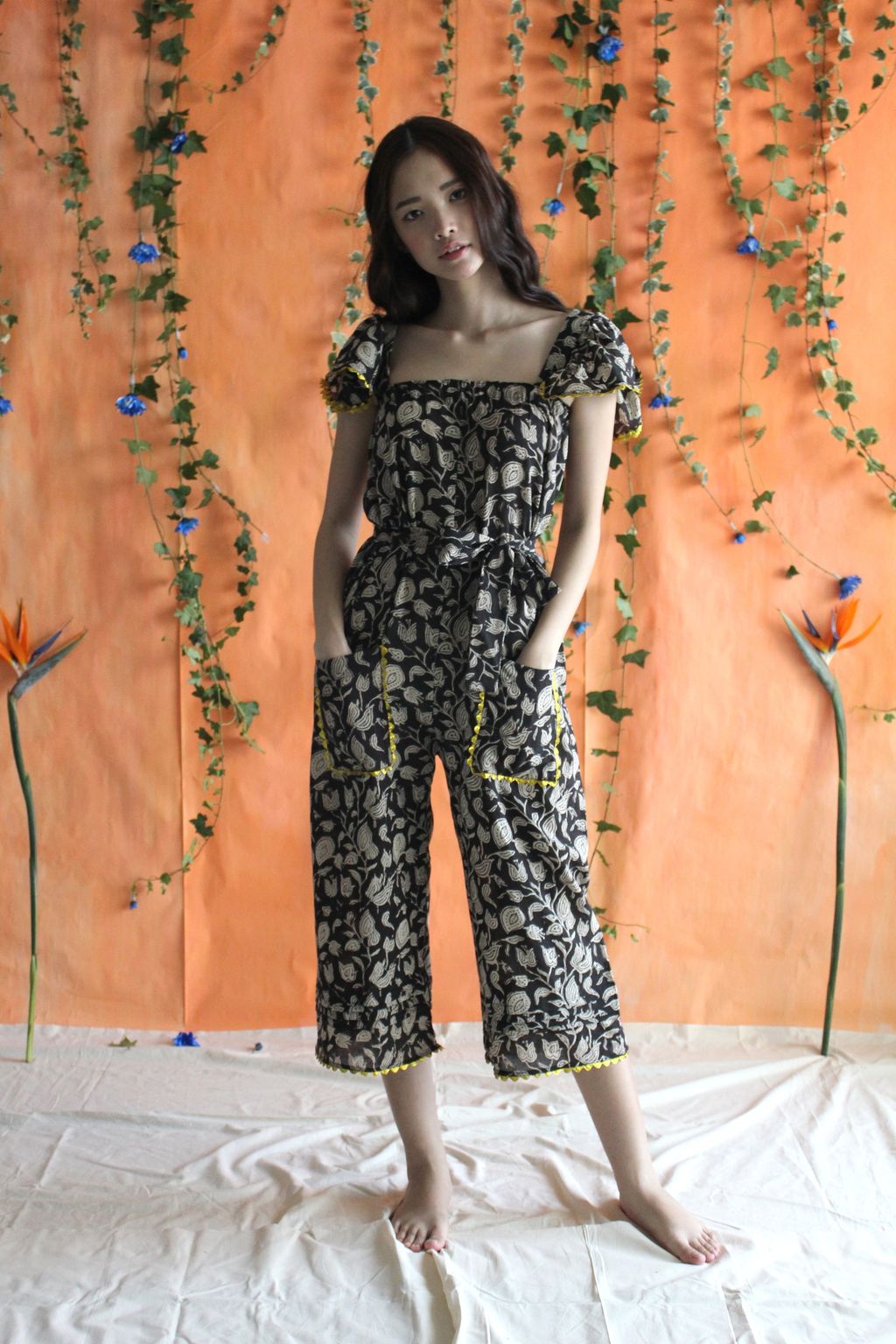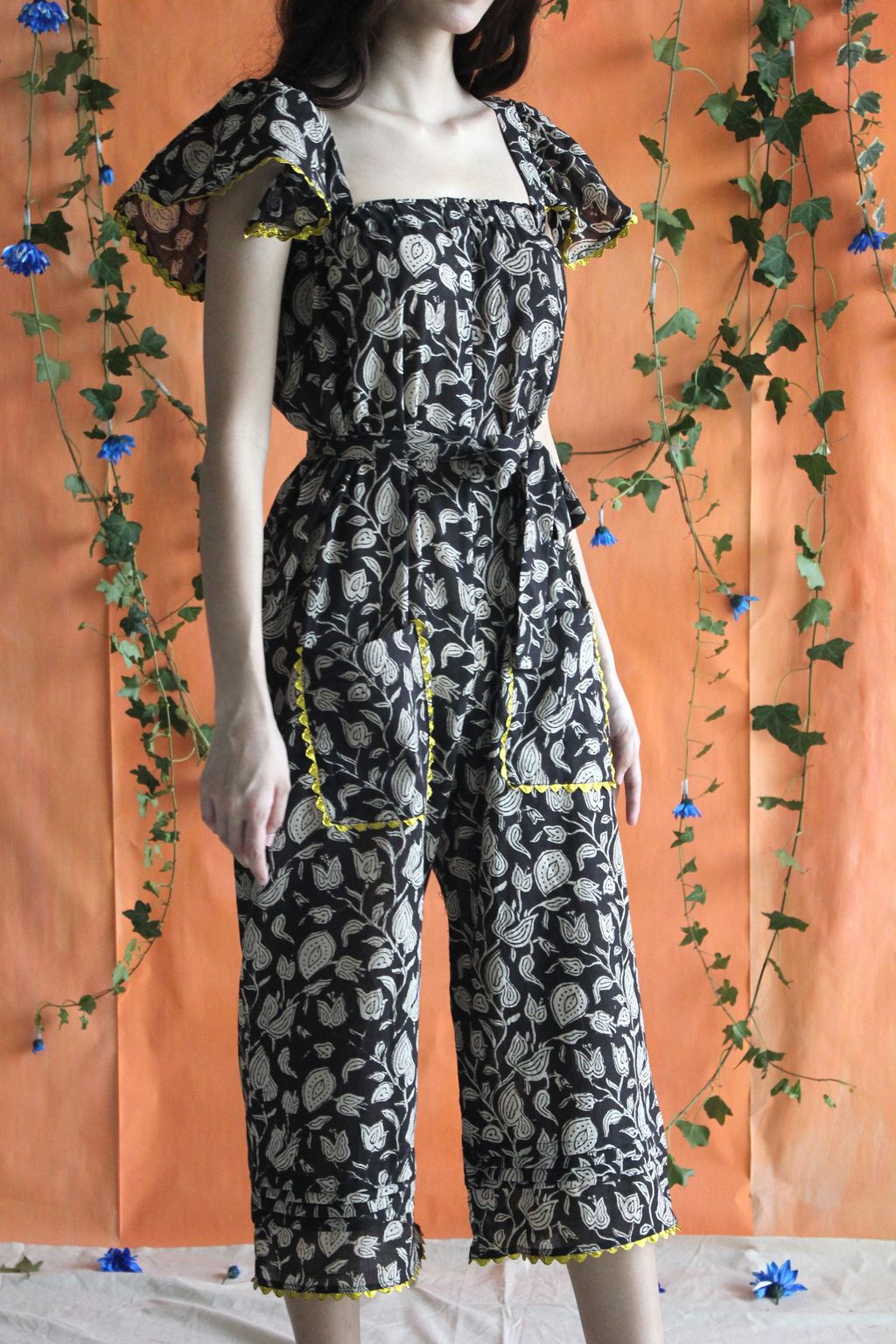 Made up of 100% hand block printed cotton with large detailed florals with a black background suitable for day and night. The jumpsuit comes with a matching fabric belt to tie at the waist tie. We have added some pleats for some texture and the edges are of gold trimmings as well as around the rectangular patch pockets to add some shimmy!