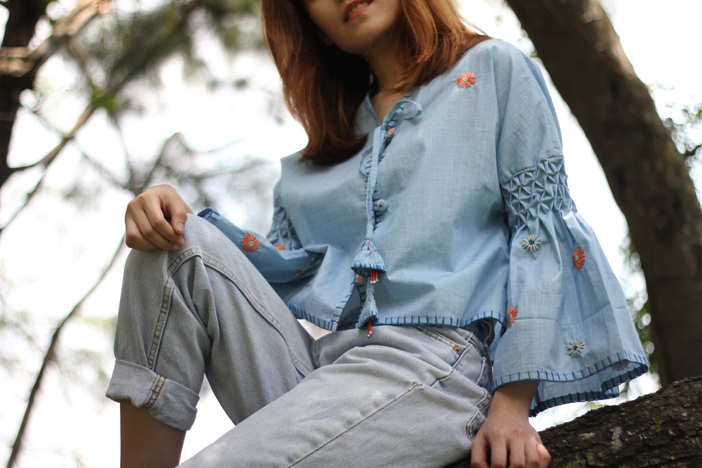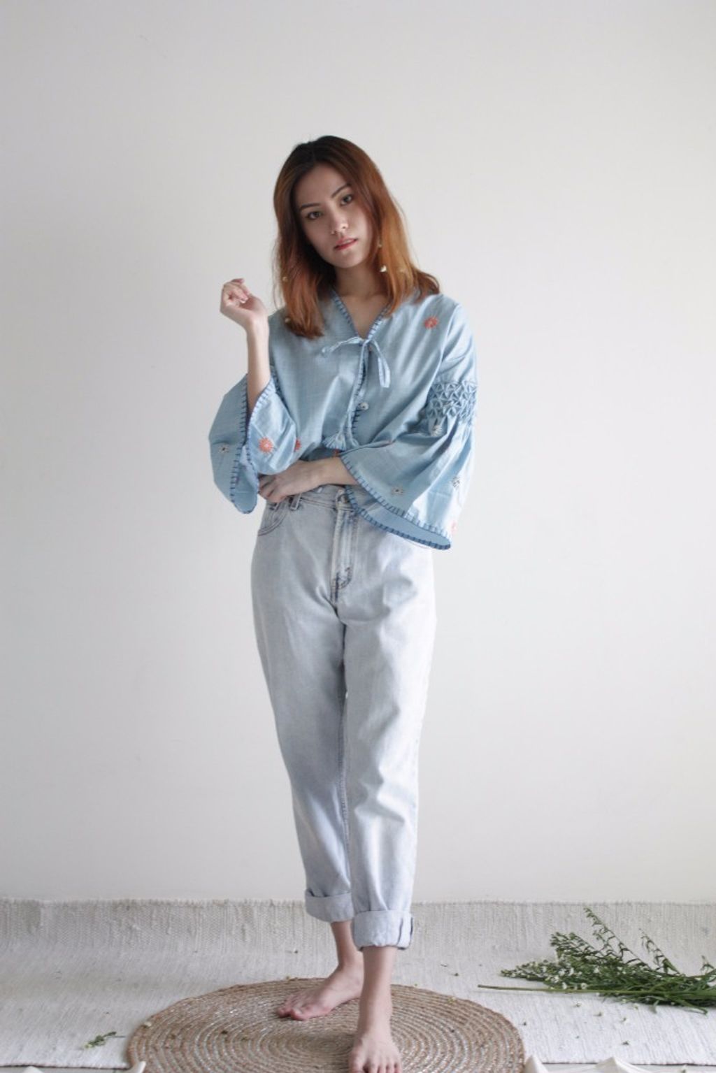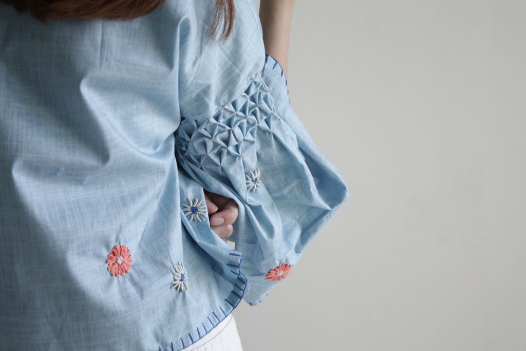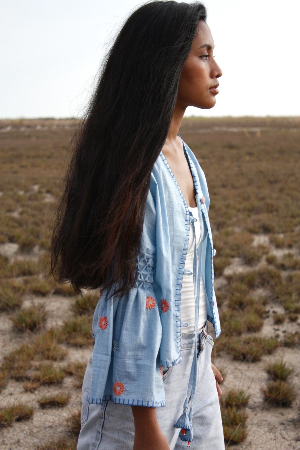 Each top is made of 100% linen and is fully finished with hand embroidery details. From the smocking at the sleeves, to the spontaneous flowers and the blanket stitch edging. Even the buttons on this top has floral embroidery on each of them. Wear this top open or buttoned up and tie it up with our flower tassel found in the centre front.