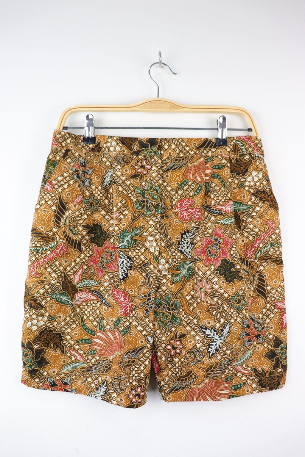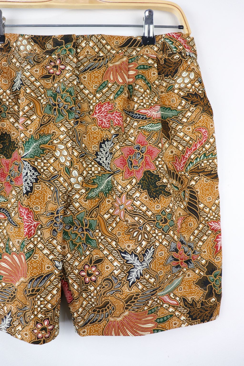 100% cotton batik with pockets at both sides, zip and metal hook fastening in the front and an elastic back for ease and comfort.