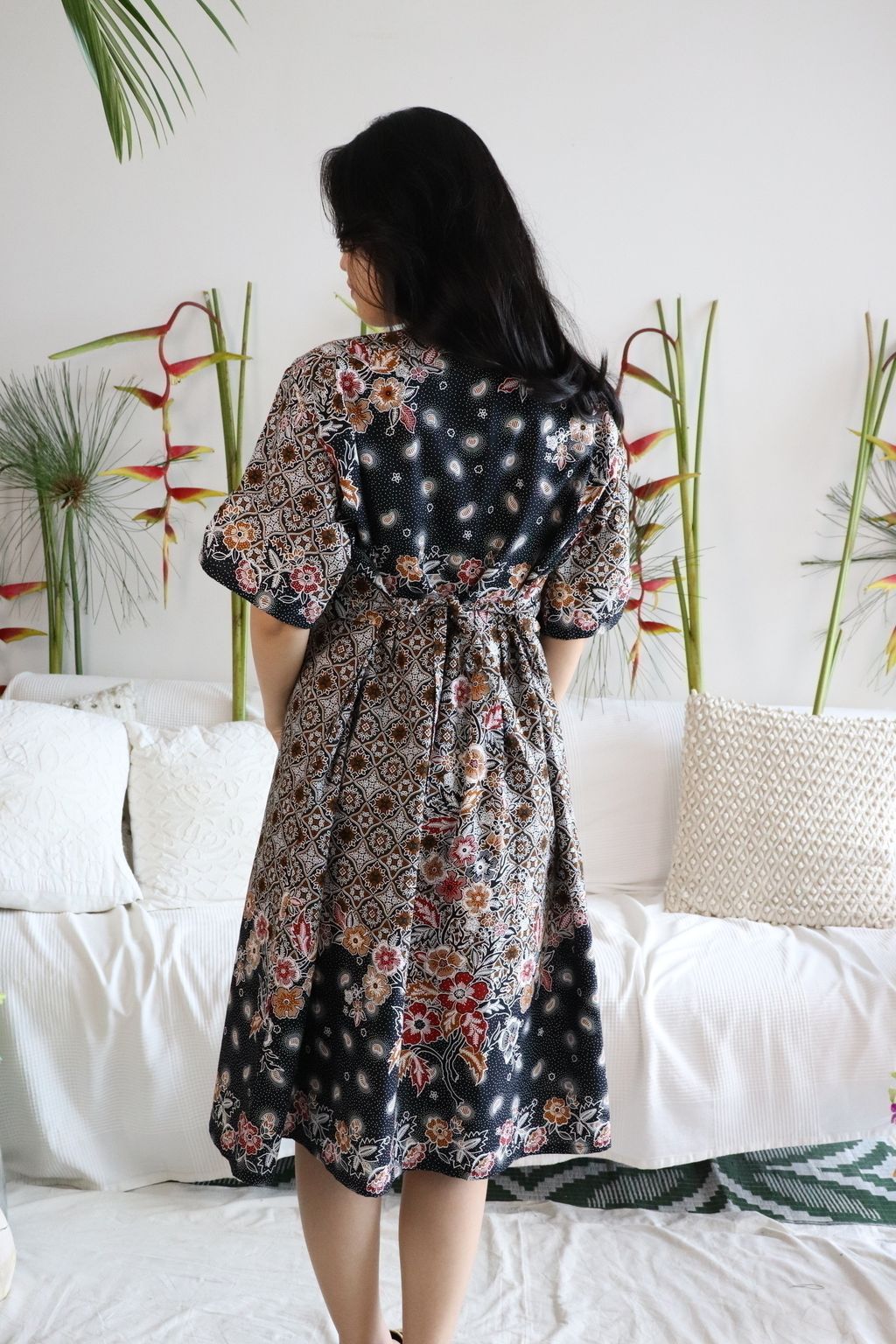 Has pockets at the sides and a tie to niche in at the waist accentuating the feminine shape.