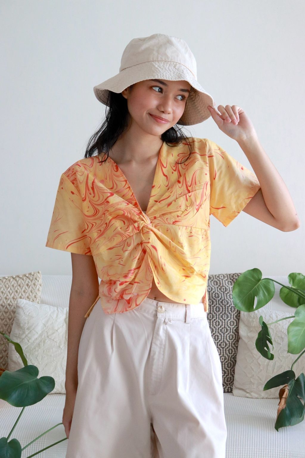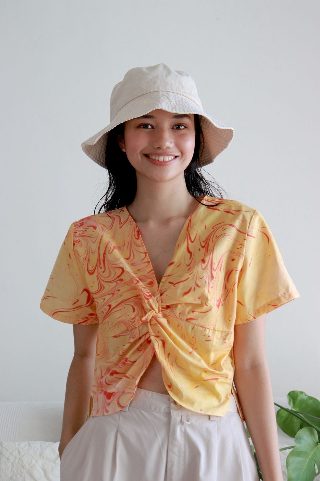 These Twisted Front Tops are made of Hand Marbled Batik by local Malaysian artisans. They are a fresh twirl of shades made of 100% cotton batik.