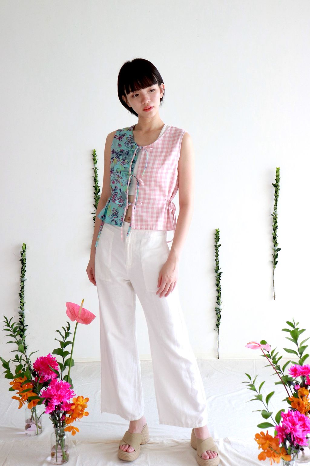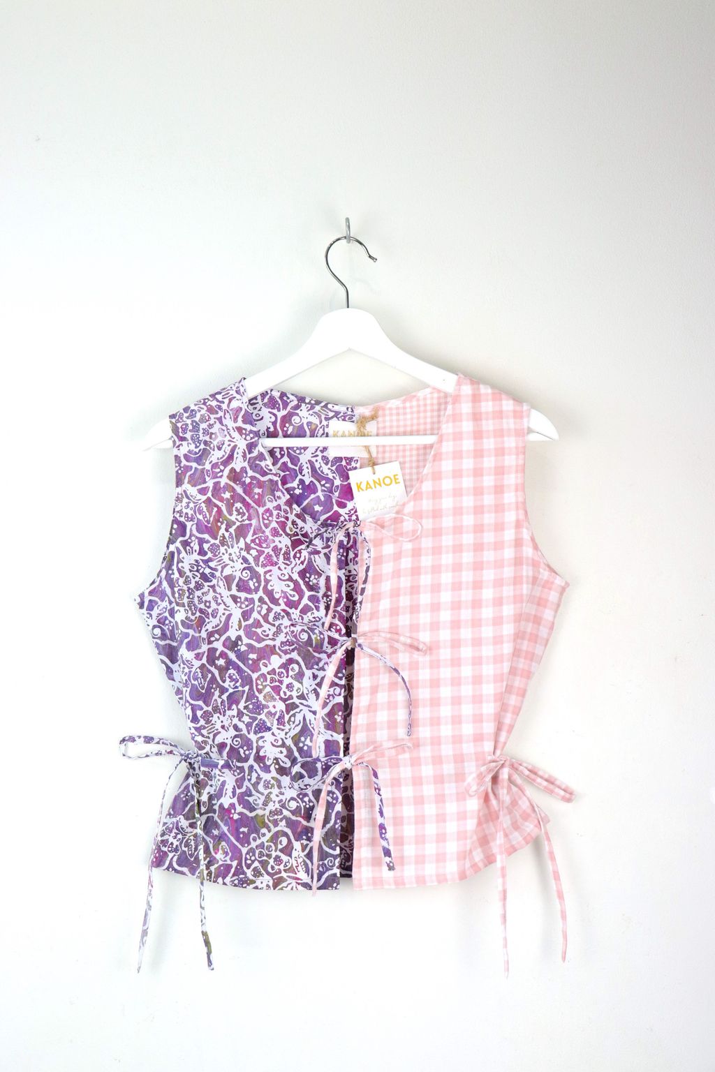If you like a fun mix in pattern, prints and colors... Check out our Limited Edition Triple Tie Front Vest!