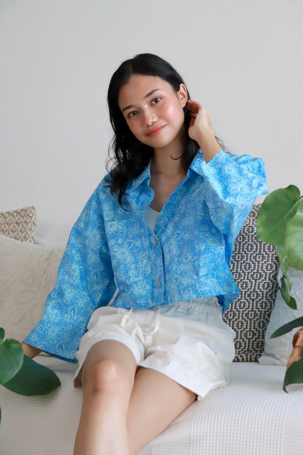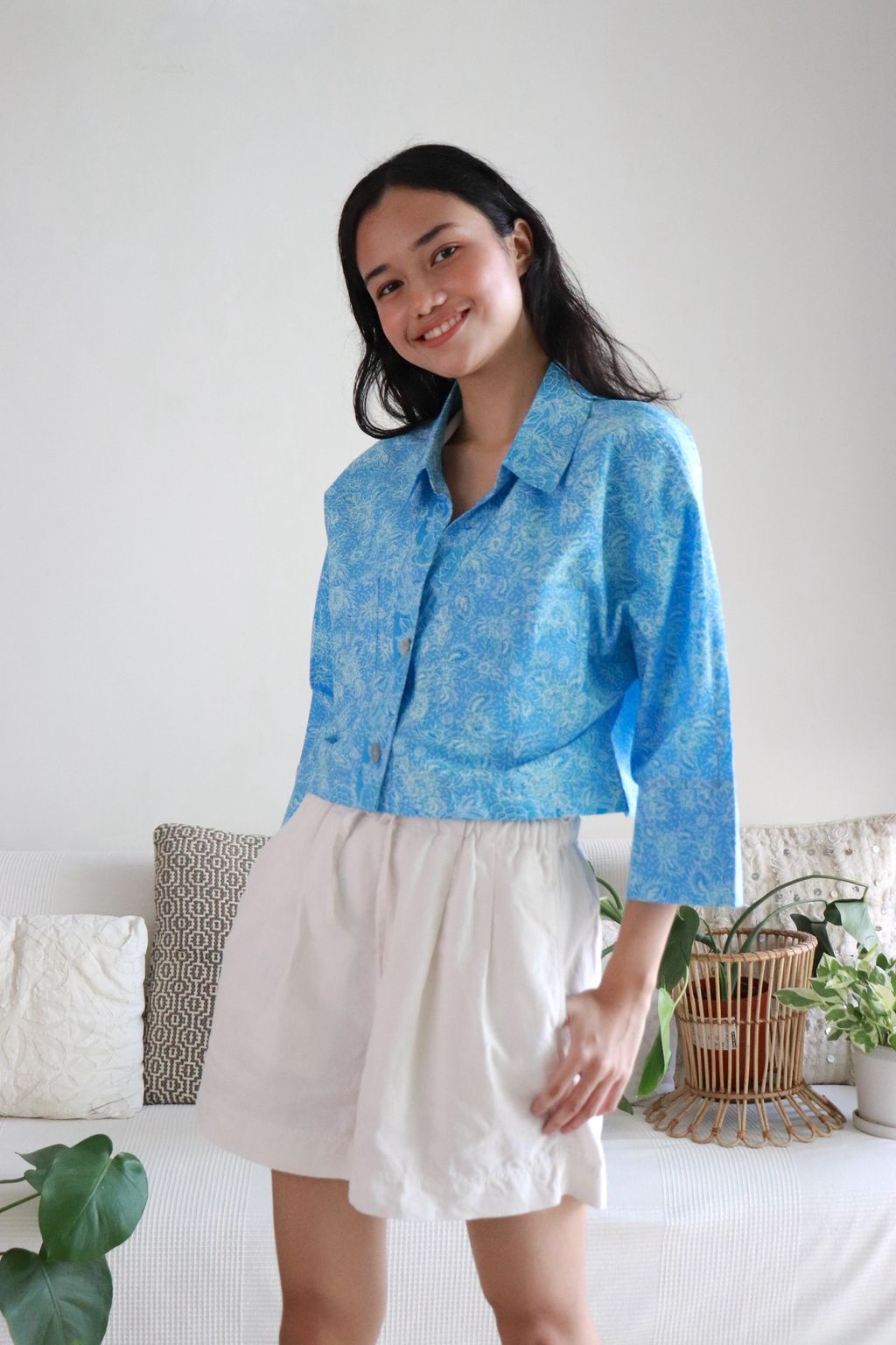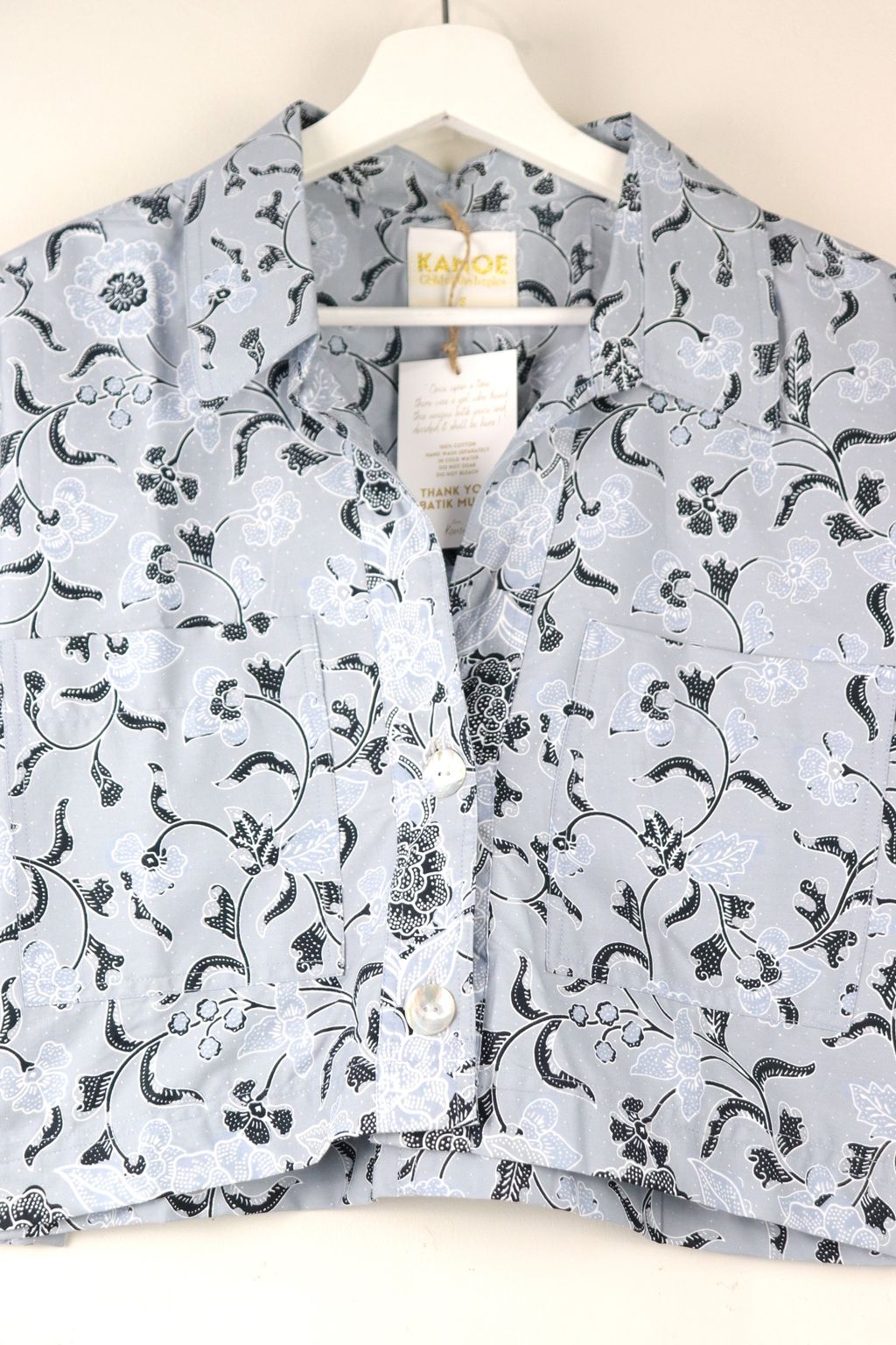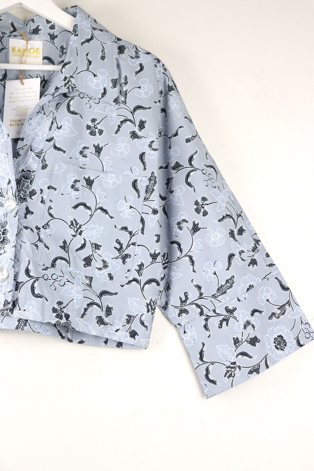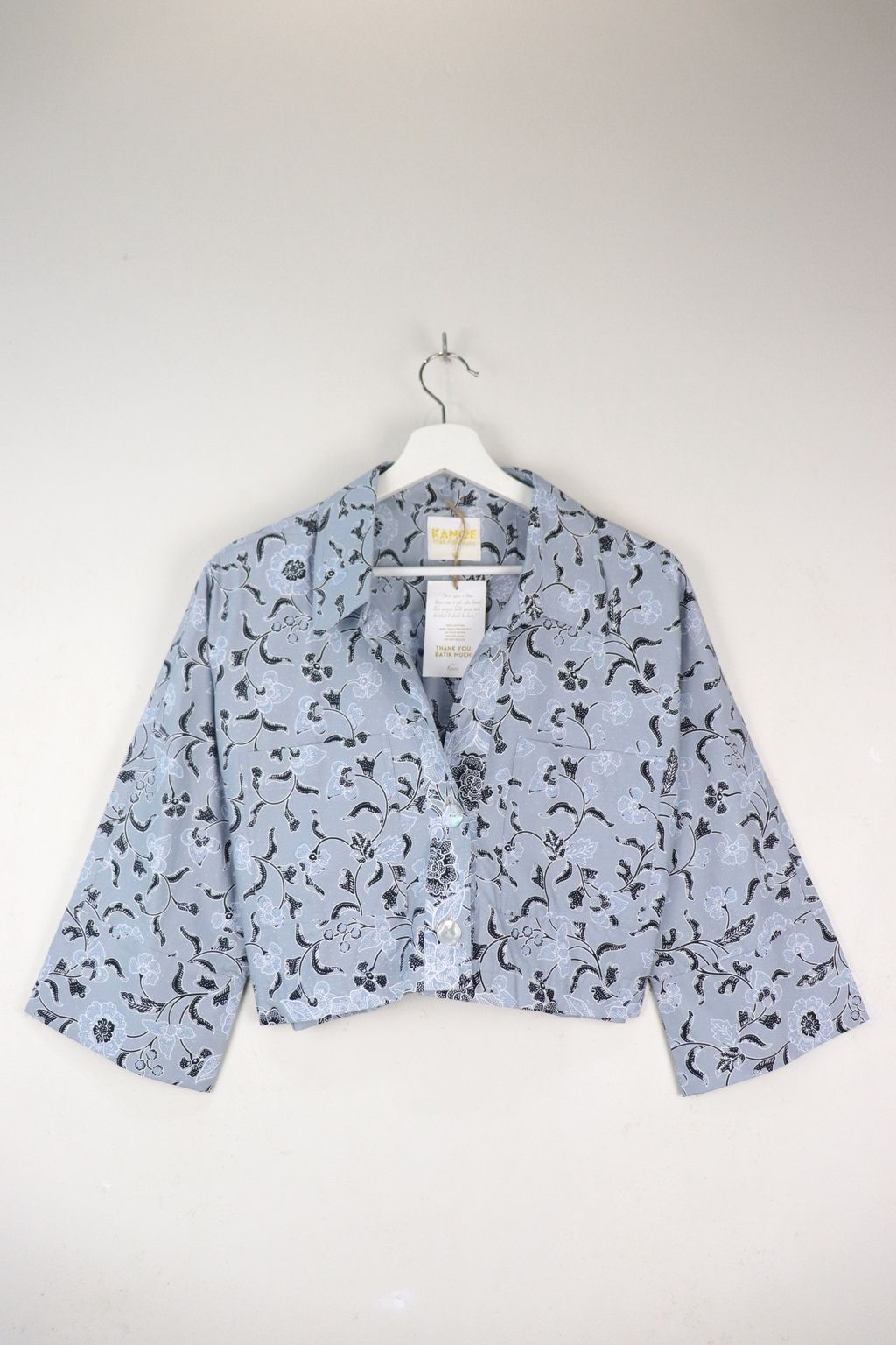 Effortless and chic, this Utilitarian Cropped Batik Shirt comes with a sharp Stiff Collar adding to the Sophisticated Dapper look, with functional Pockets and au naturale Mother of Pearl buttons down the front that speaks the understated Elegance of today.