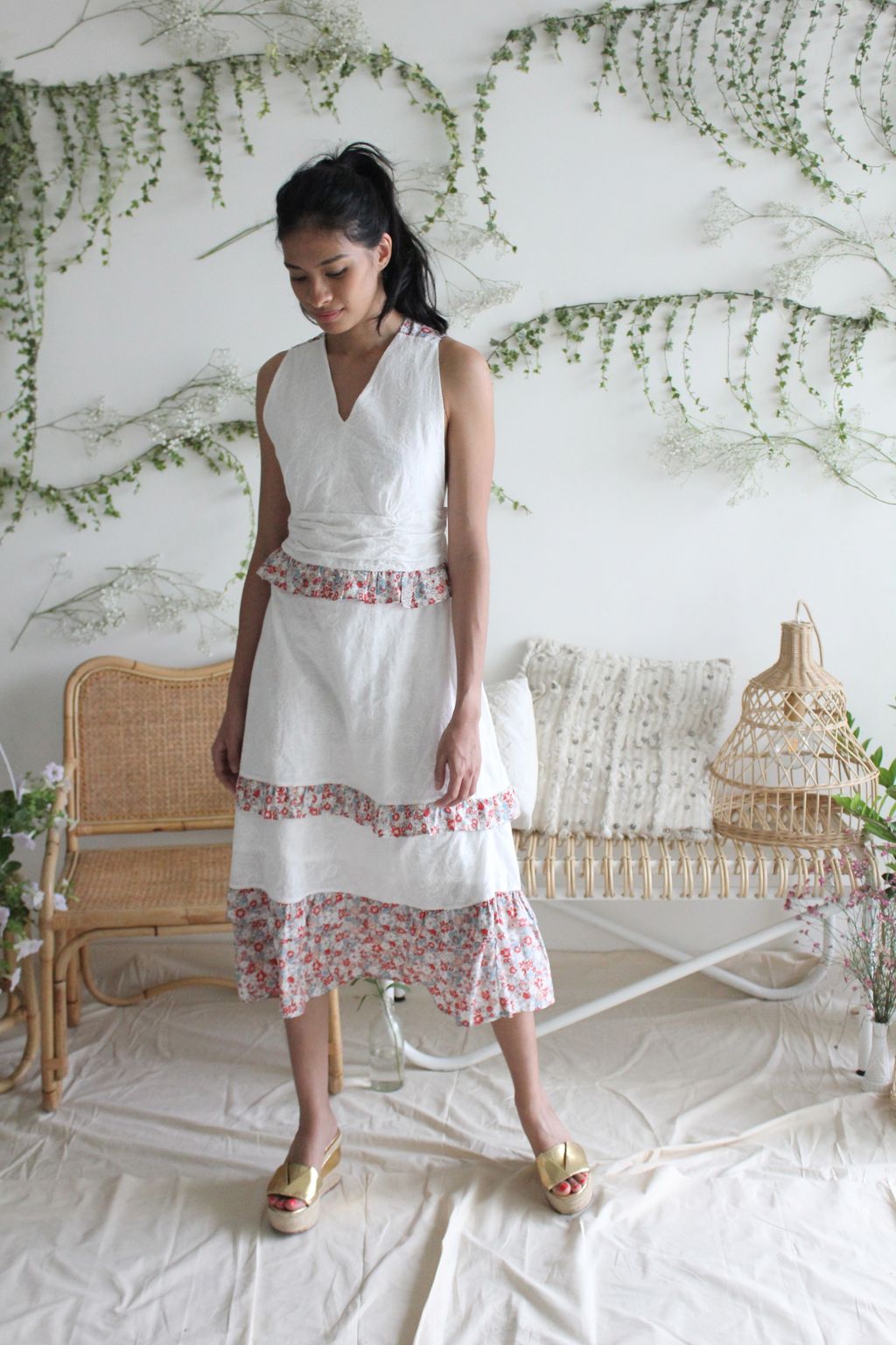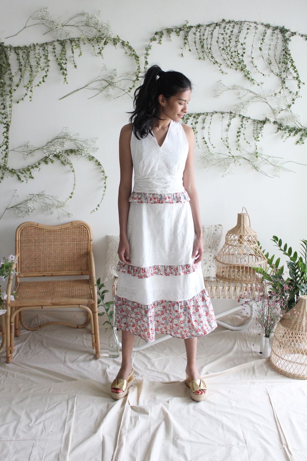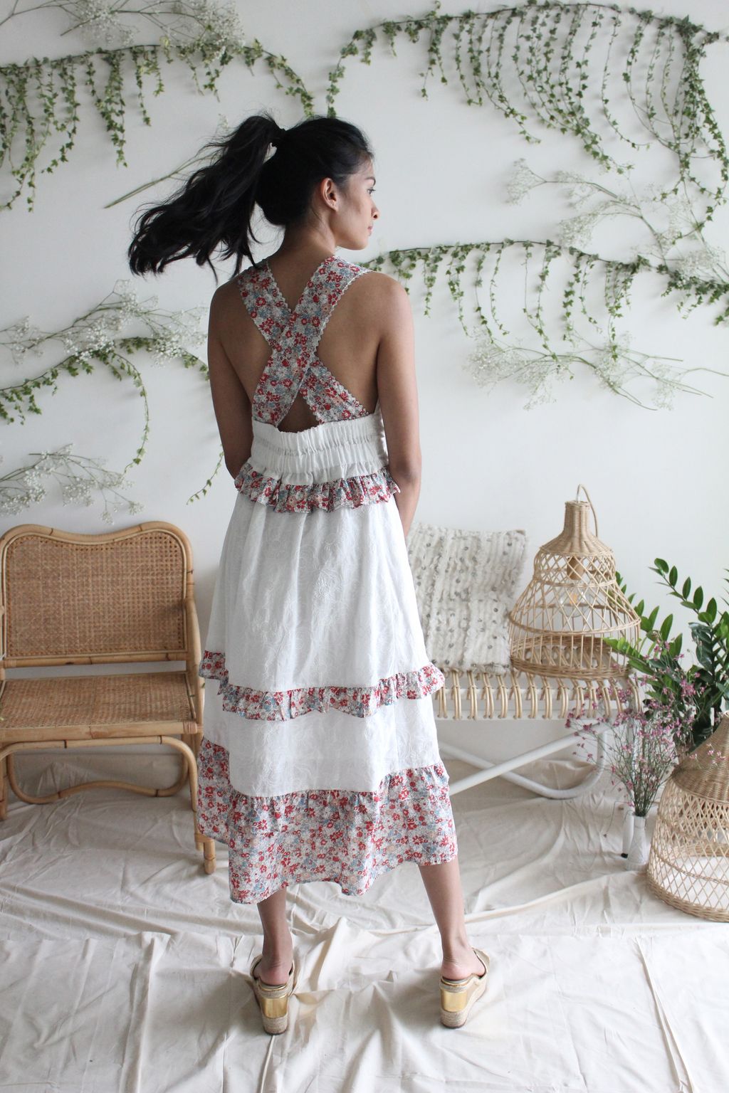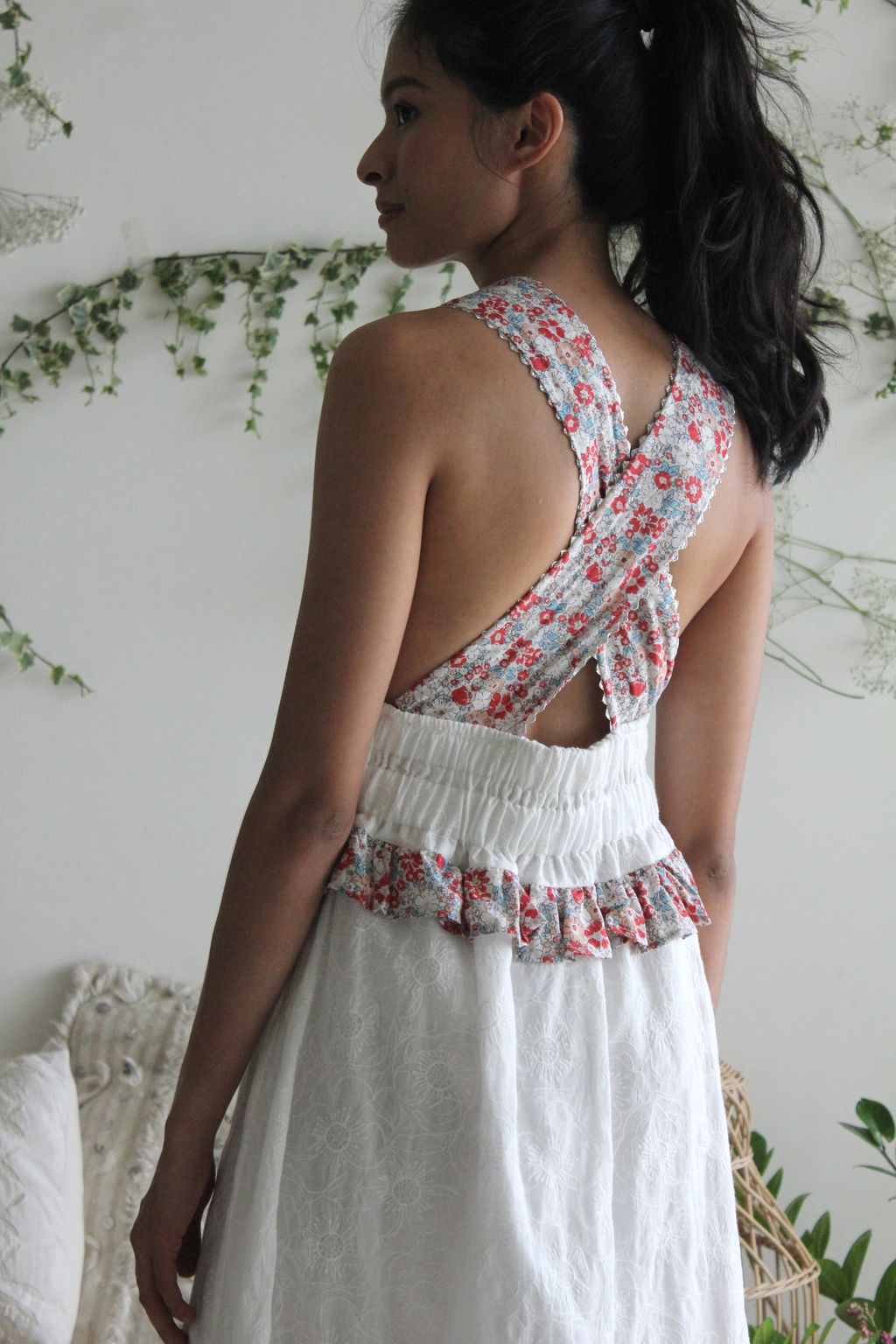 Made of 100% floral embroidered cotton adding feels and texture. V-neckline with a beautiful cross back floral strap with silver ric-rac edging. Elasticized waist at the back and a zipper opening at the side.