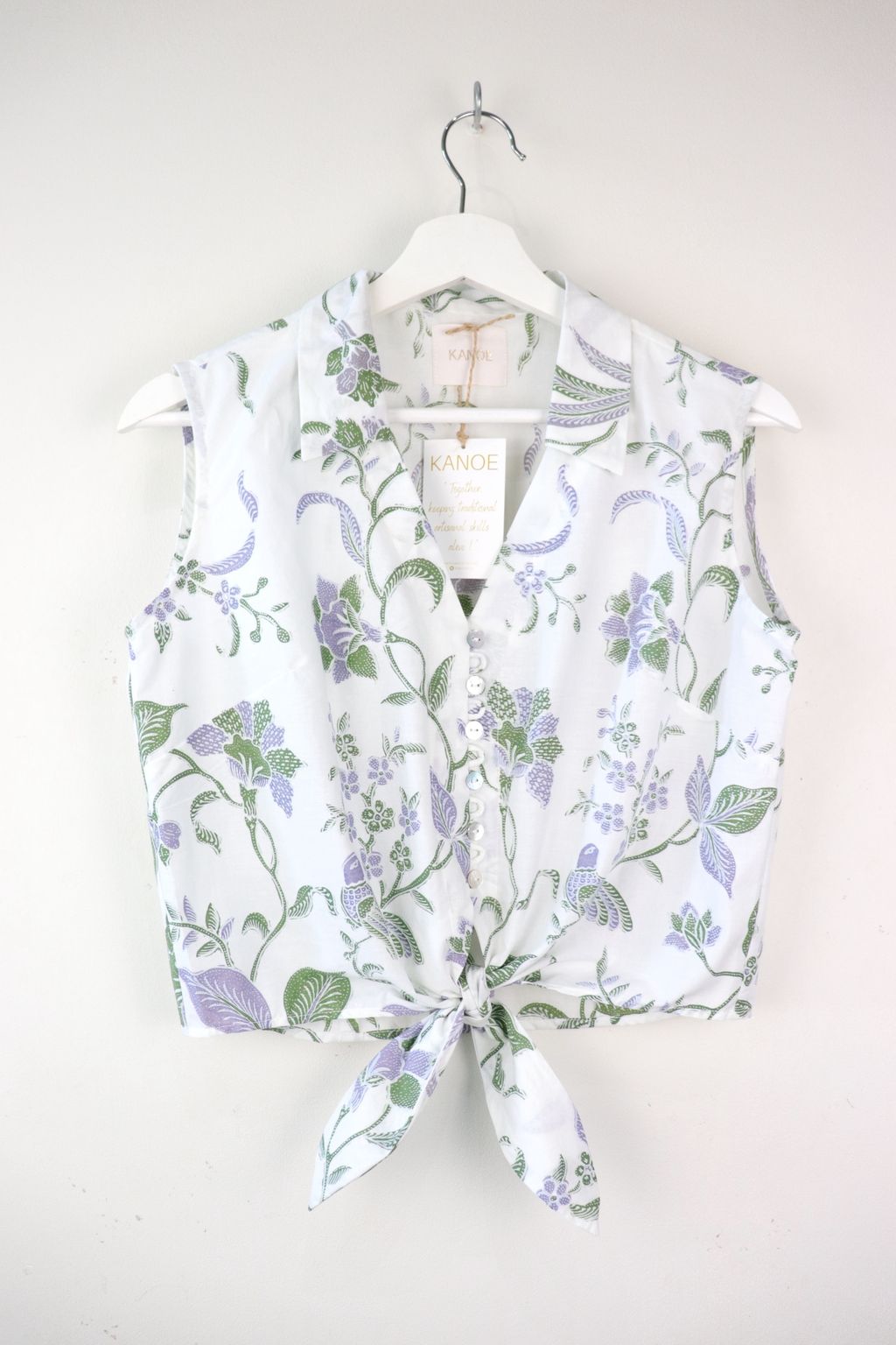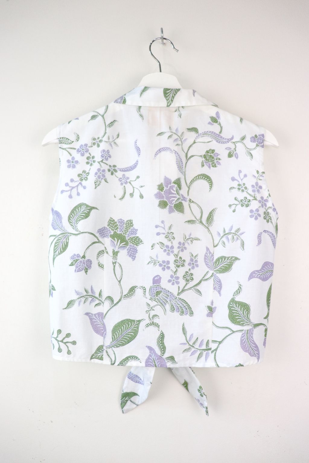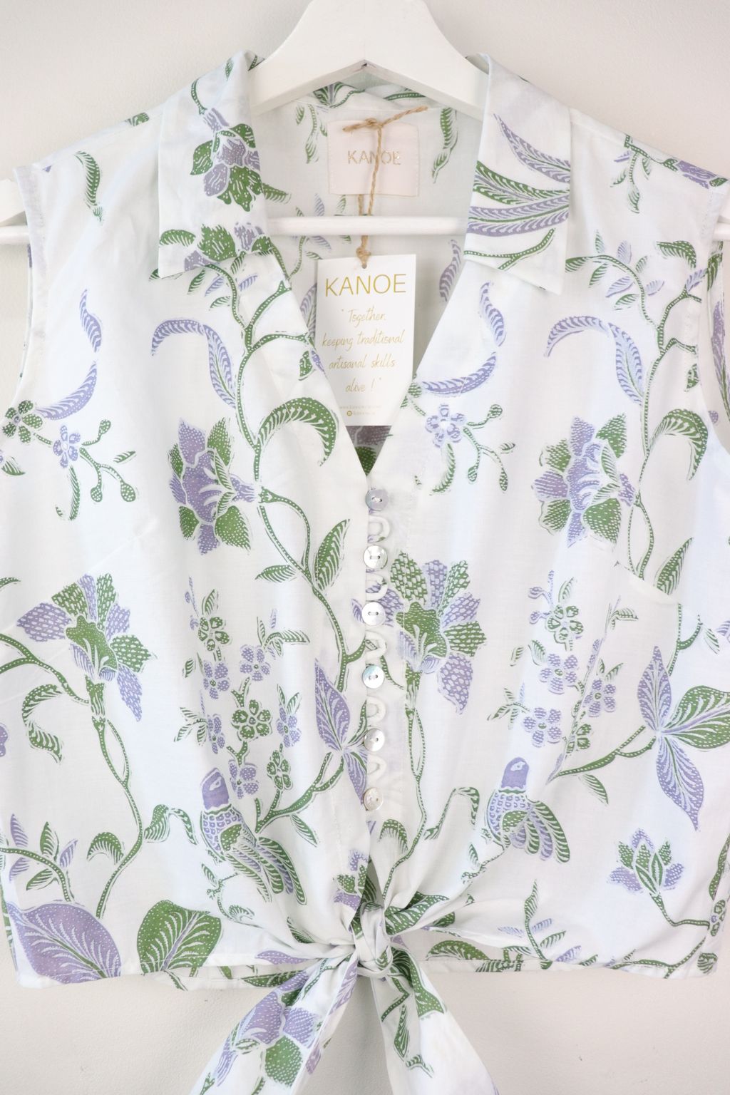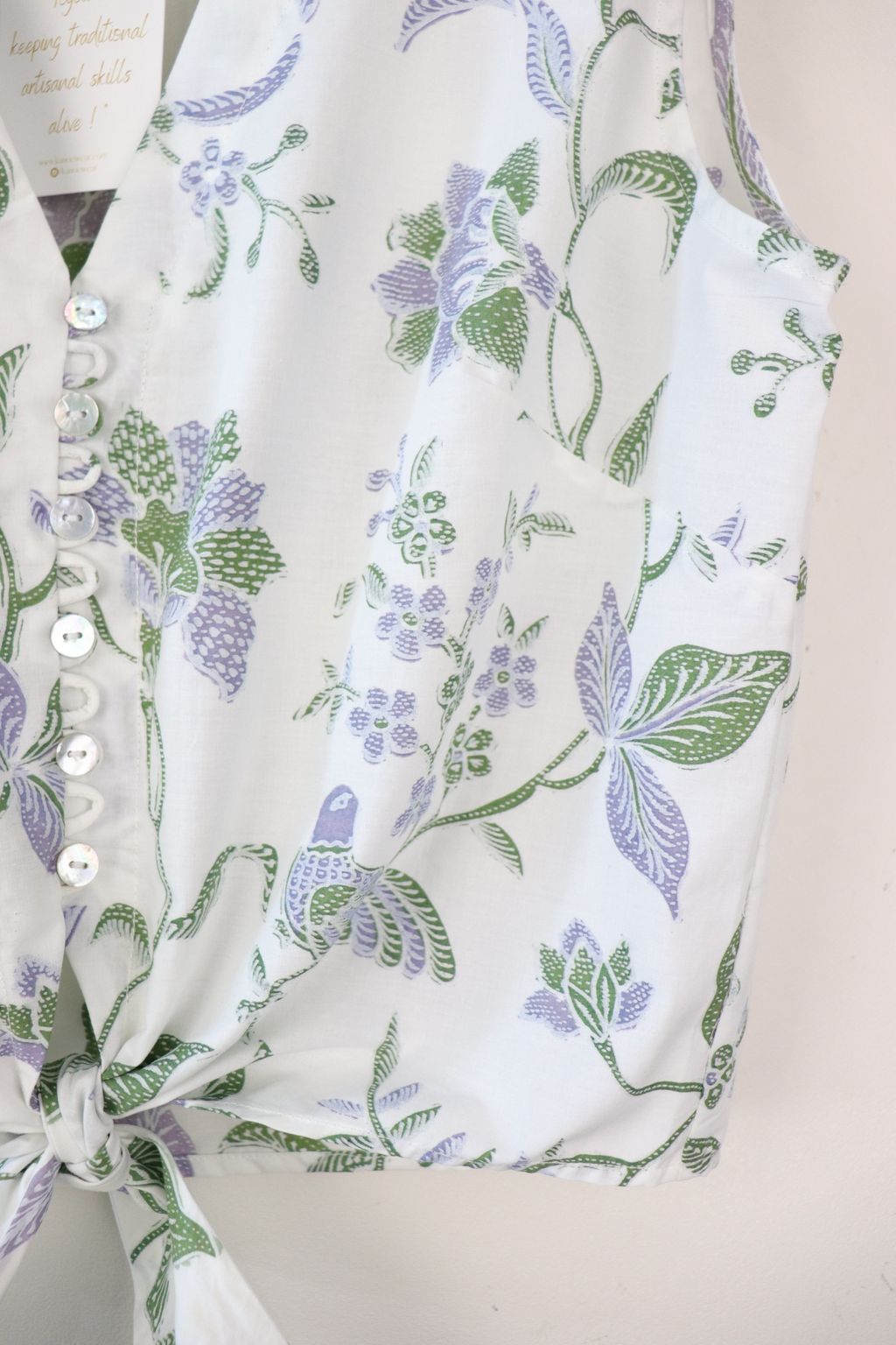 These pastel sleeveless front tie top are made from intricate hand stamped batik textile. Not one piece alike, you will love how beautiful the colours and print of this batik is made by skilled artisans of centuries of batik making wisdom. These batik come from a region where the batik makers have influence from Chinese and European merchants in which is on display in the motifs and colours of the batik.